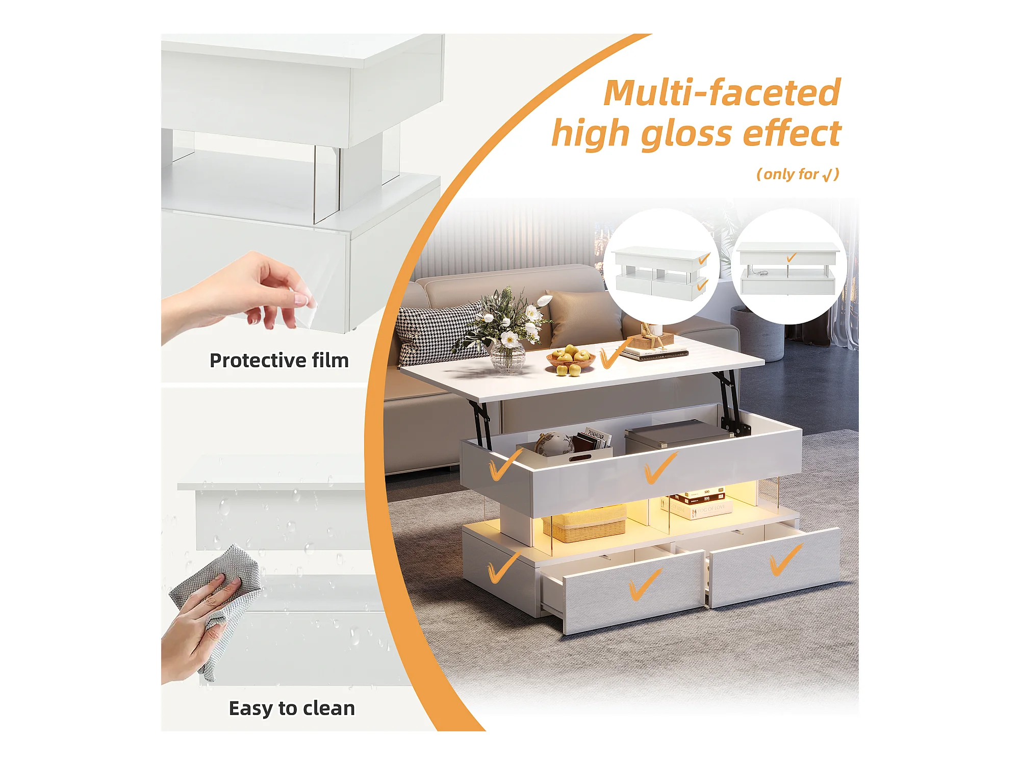 Table basse relevable avec LED - avec rangements - effet brillant - Blanc