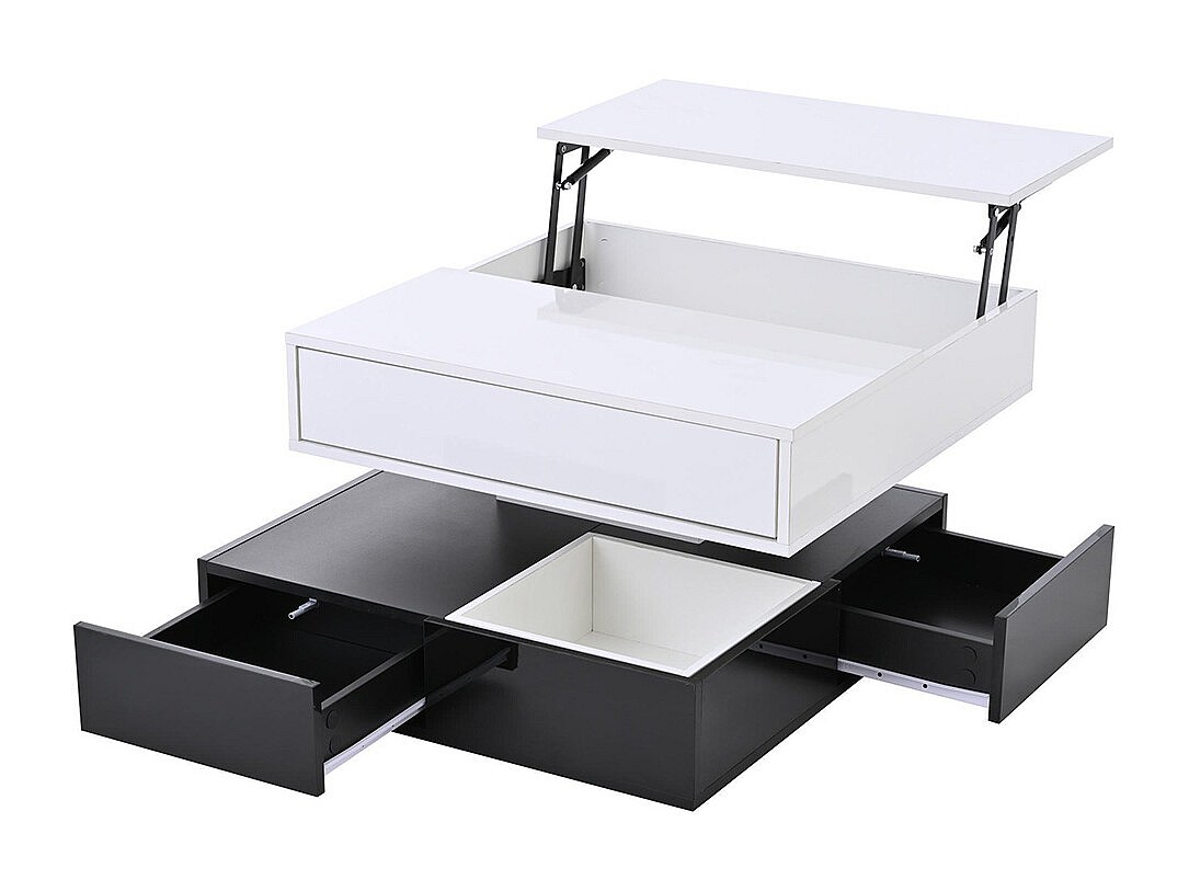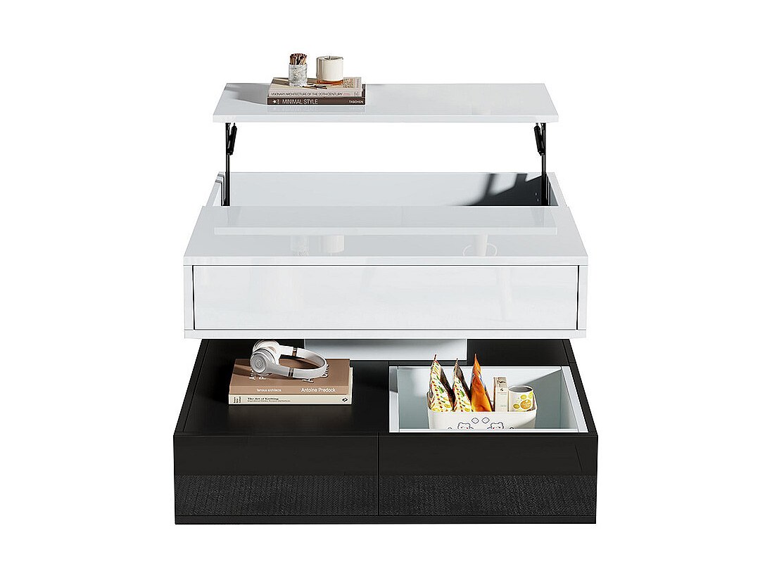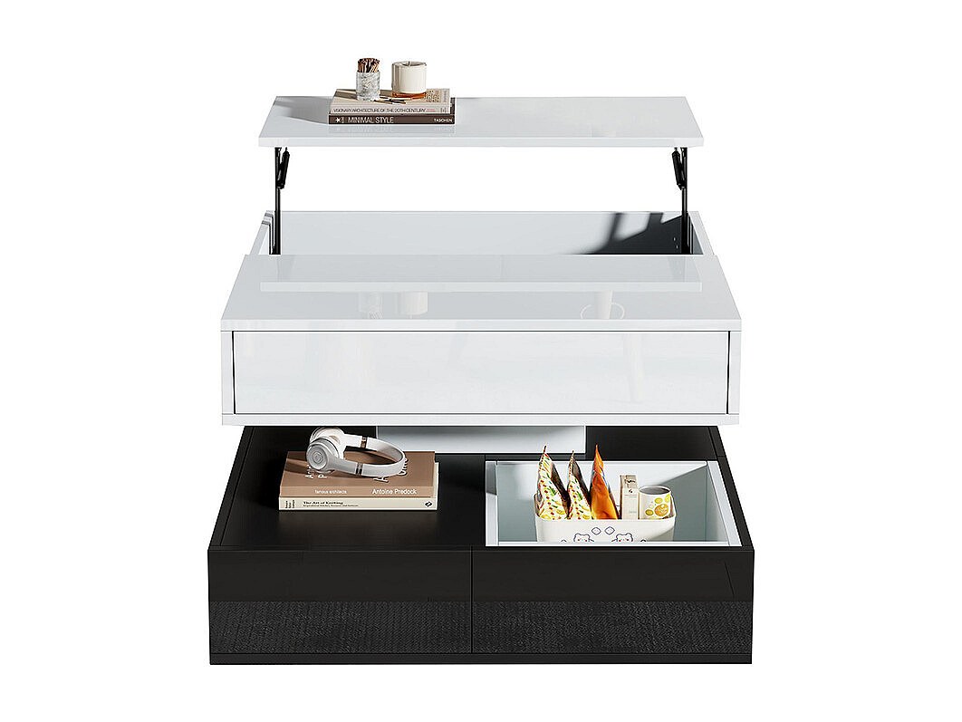 Table basse relevable 360° plateau pivotant 3 tiroirs double couche géométrique brillante rangement blanc noir