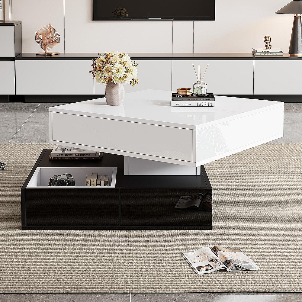 Table basse avec plateau rotatif à 360°- 70 x 70 x 40 cm - double couche avec 3 tiroirs - aggloméré - blanc + noir