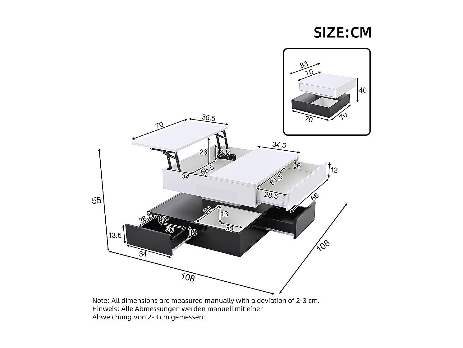 Table basse avec plateau relevable 95x48x40cm avec 2 tiroirs, LED, corps en noir laqué
