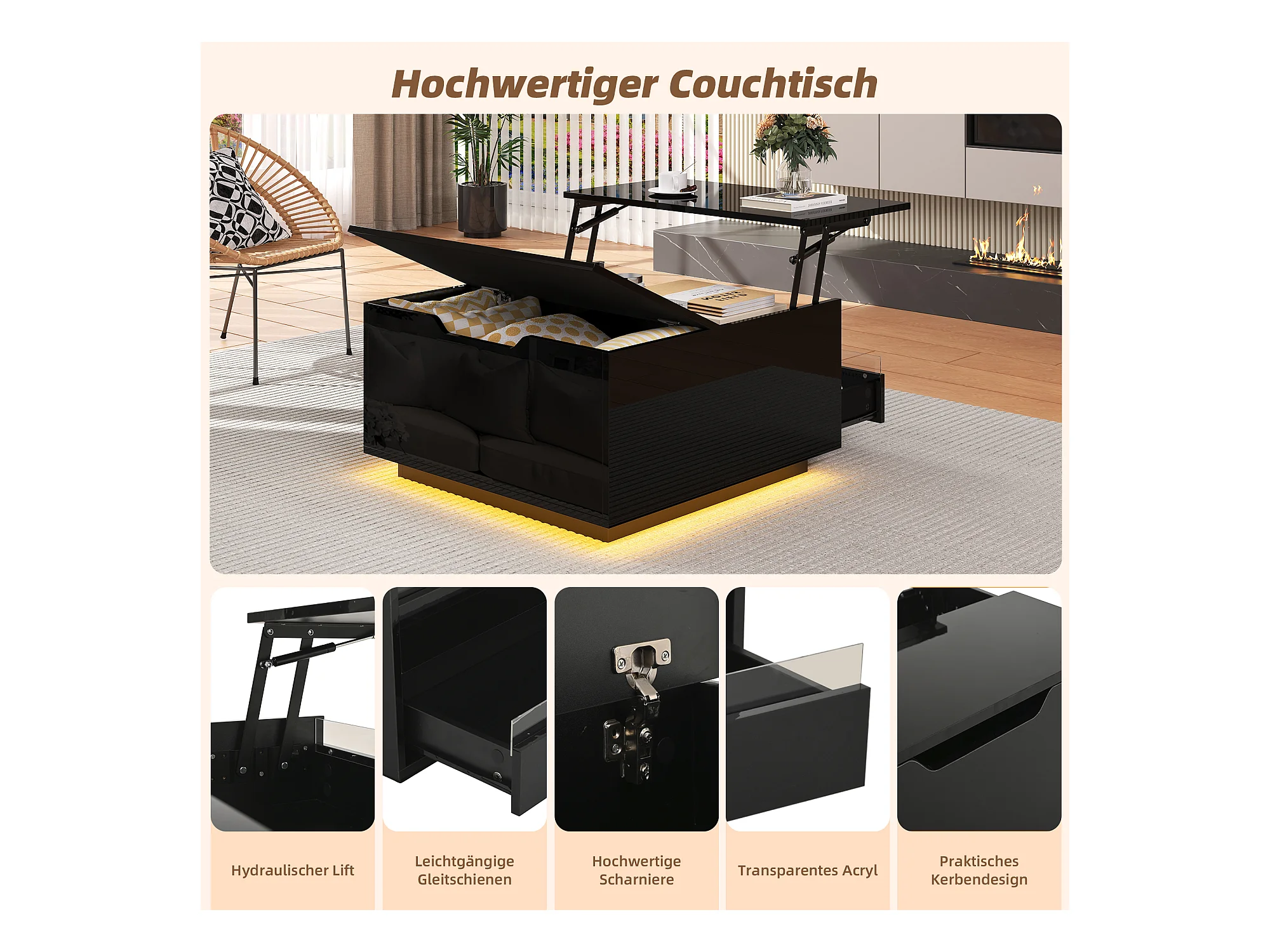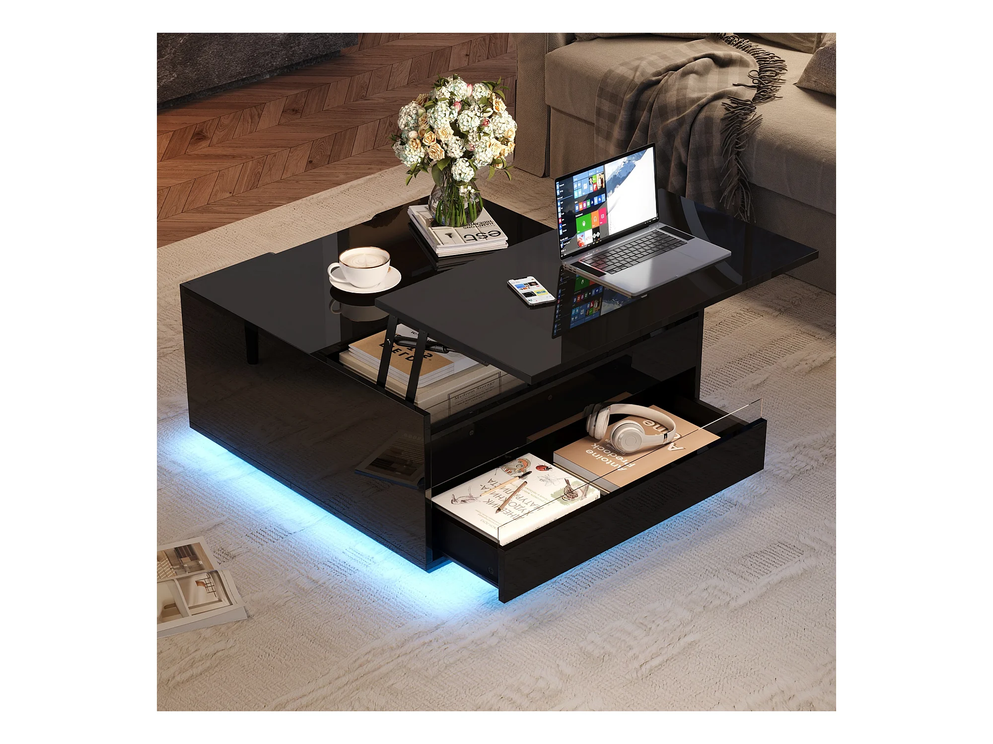Table basse relevable de salon - 70 x 70 x 38 cm - avec Leds + 1 tiroir + portes rabattables - aggloméré - noir