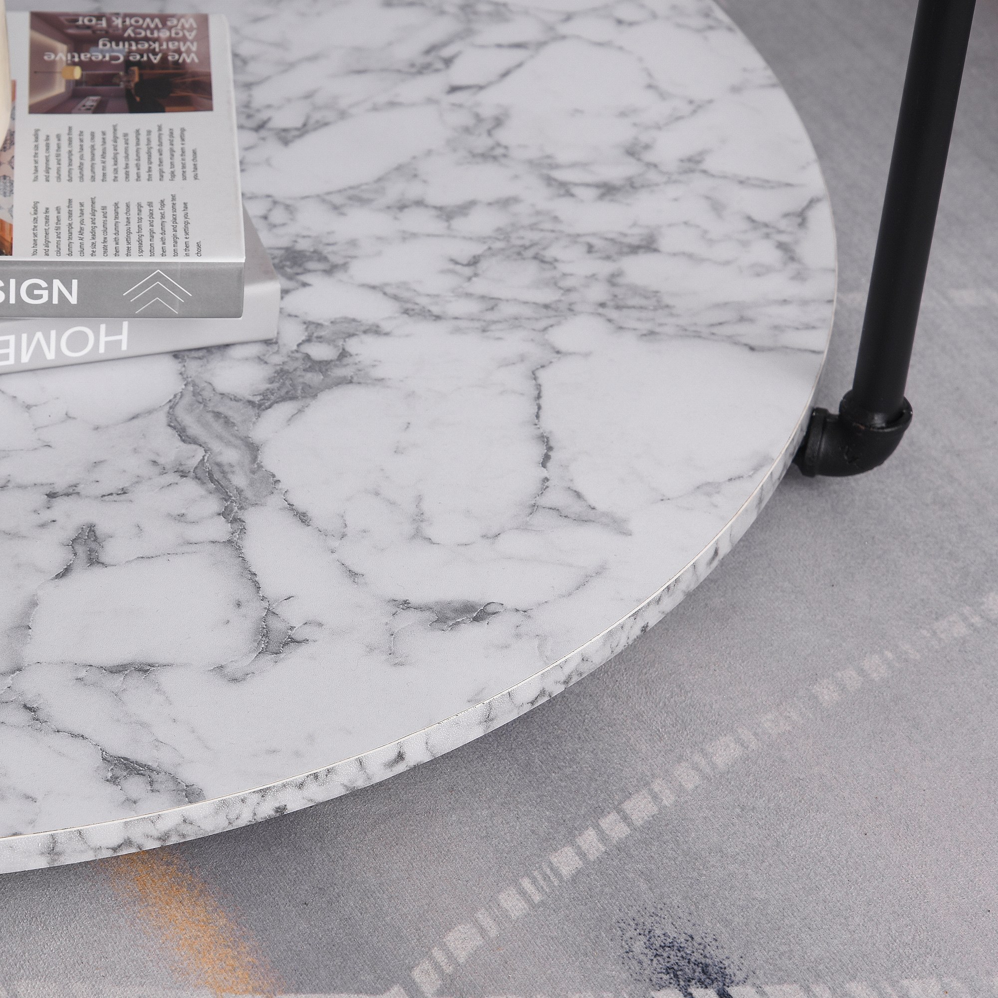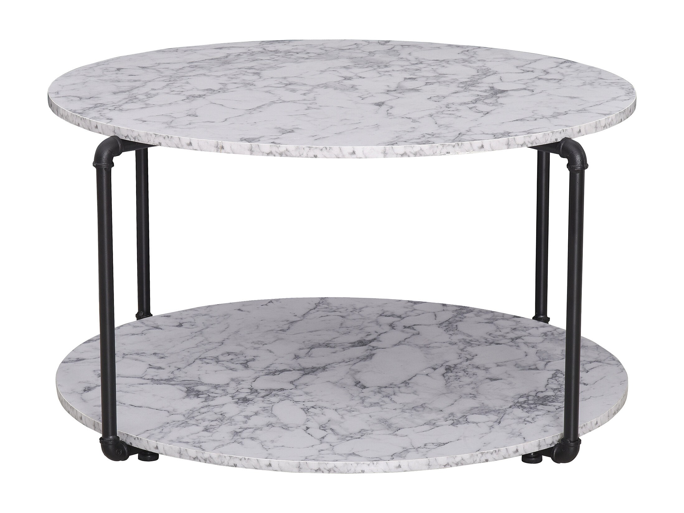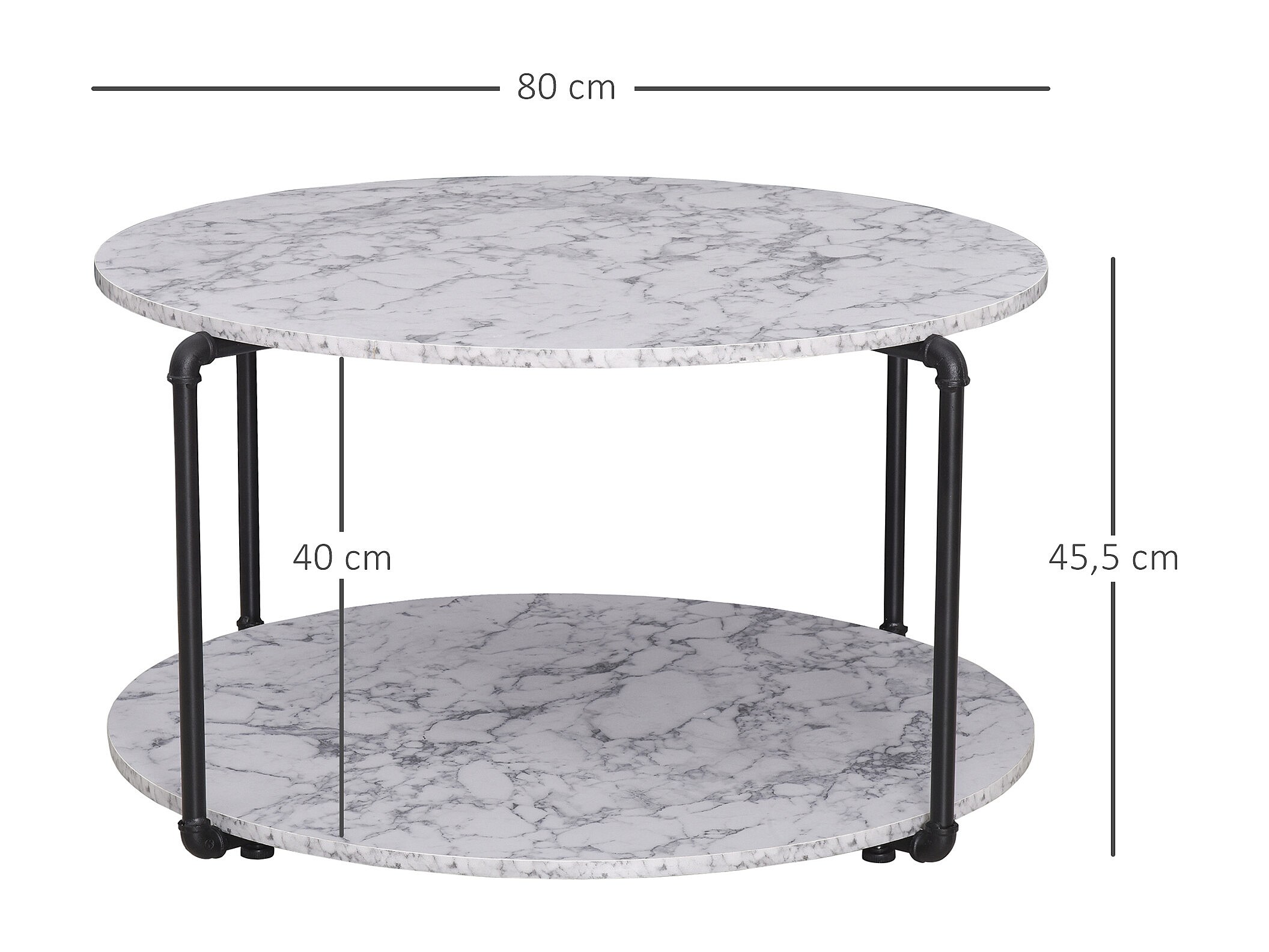 Table basse ronde avec étagère dim. Ø 80 x 45H cm panneaux particules imitation marbre blanc métal noir