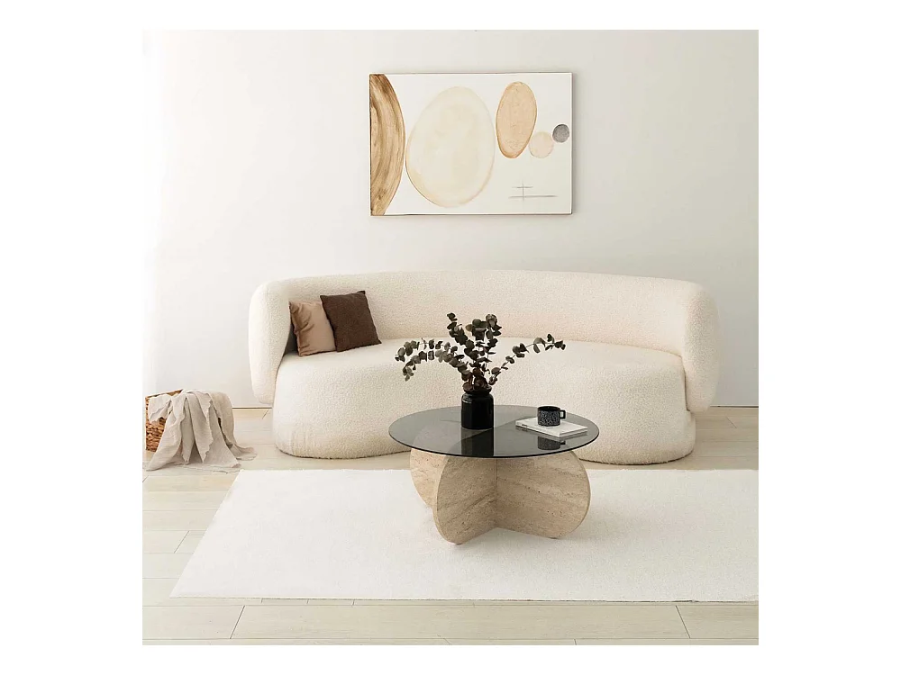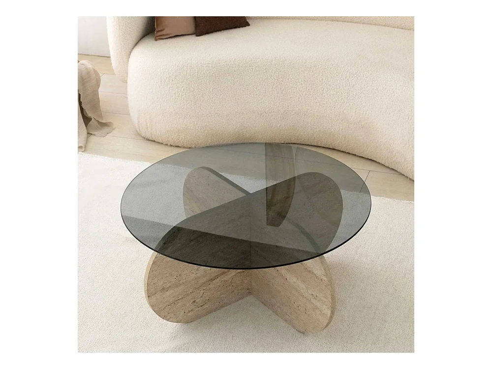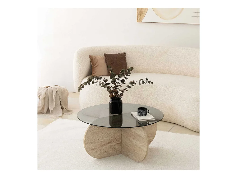 Table basse ronde design Helvya D75cm Verre fumé Gris et Effet travertin Beige