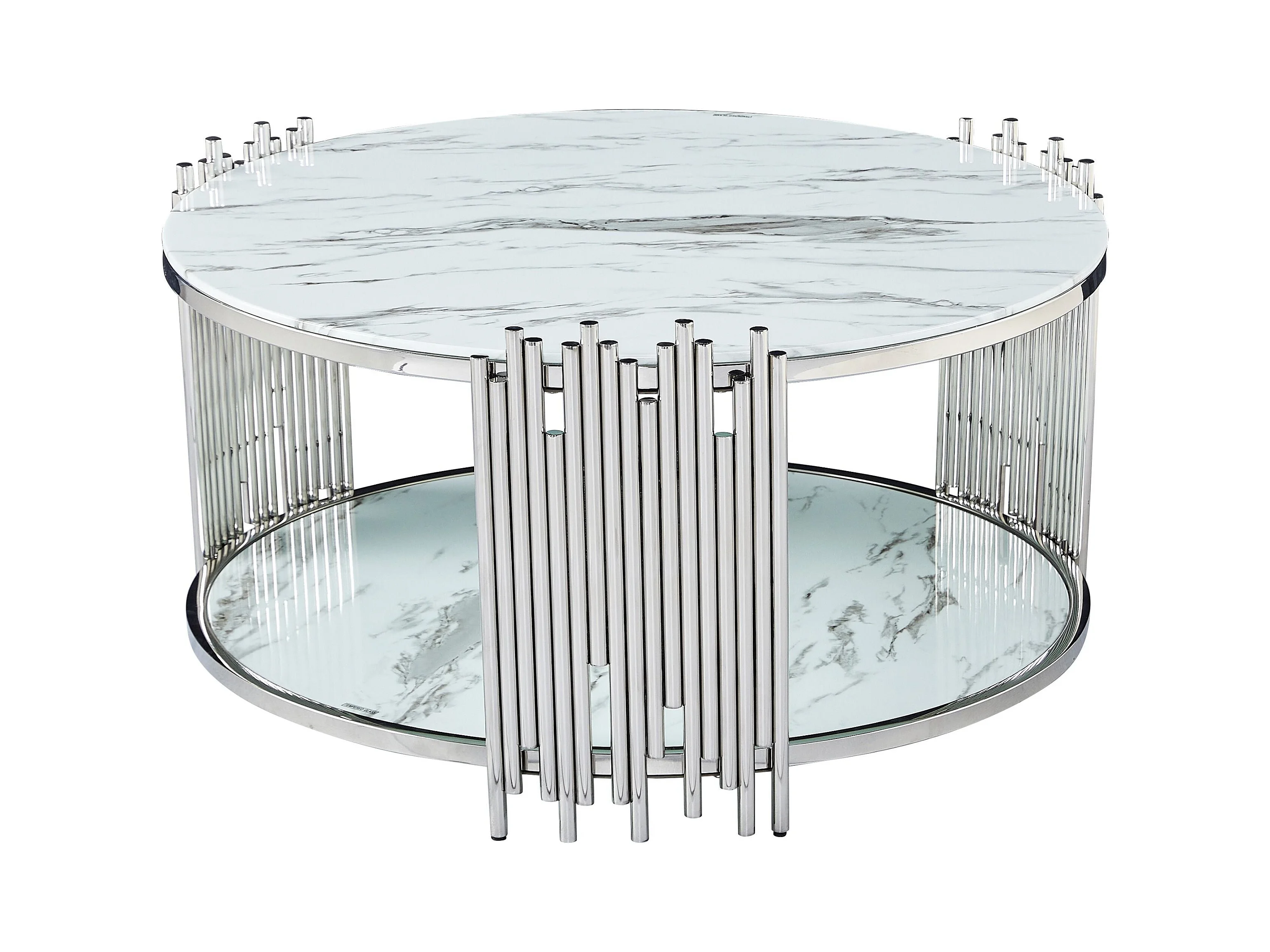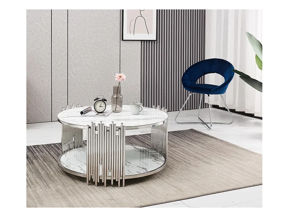Table Basse ronde STICK Chrome et plateau en verre MARBRE BLANC D90 H45 cm