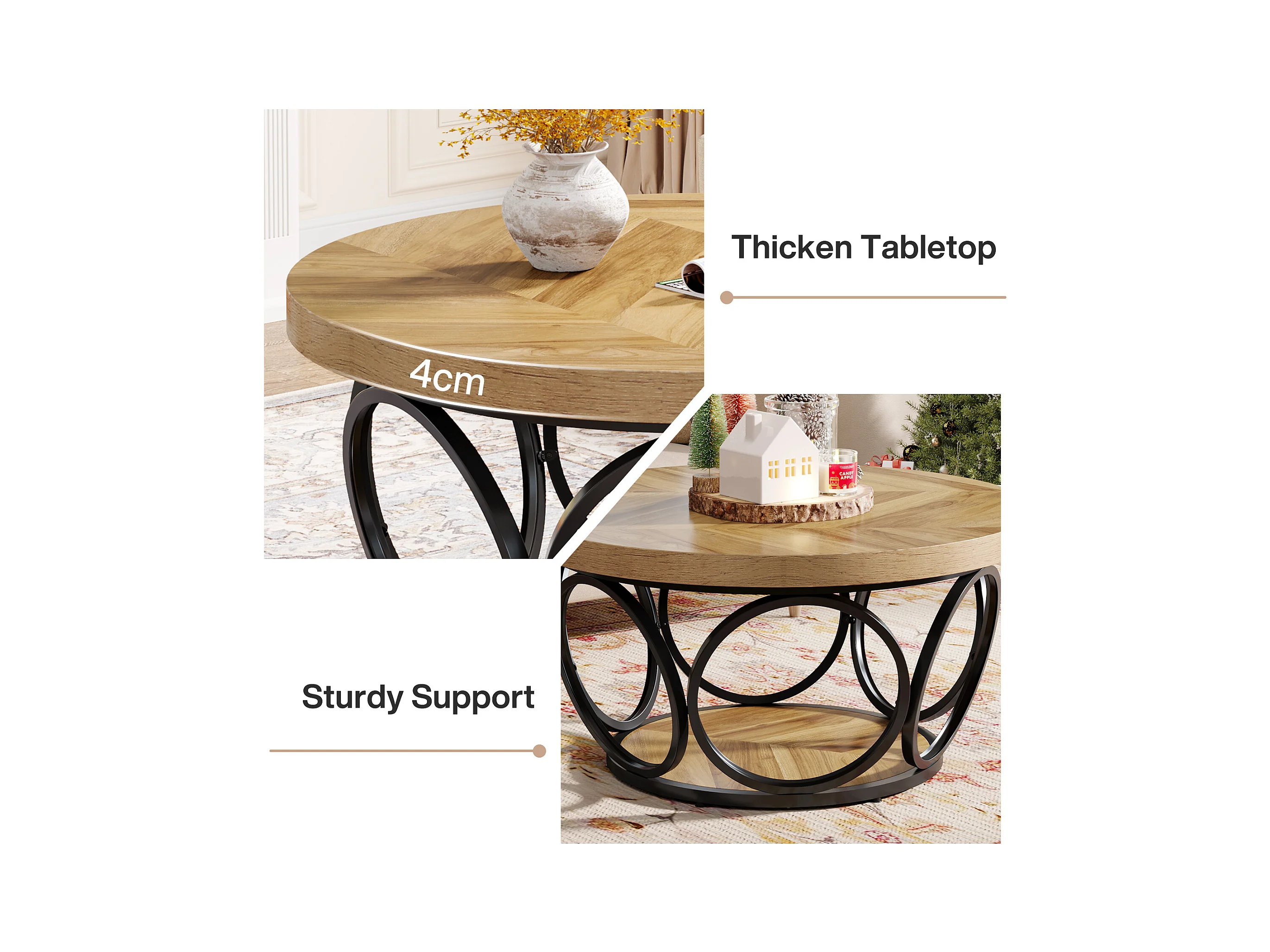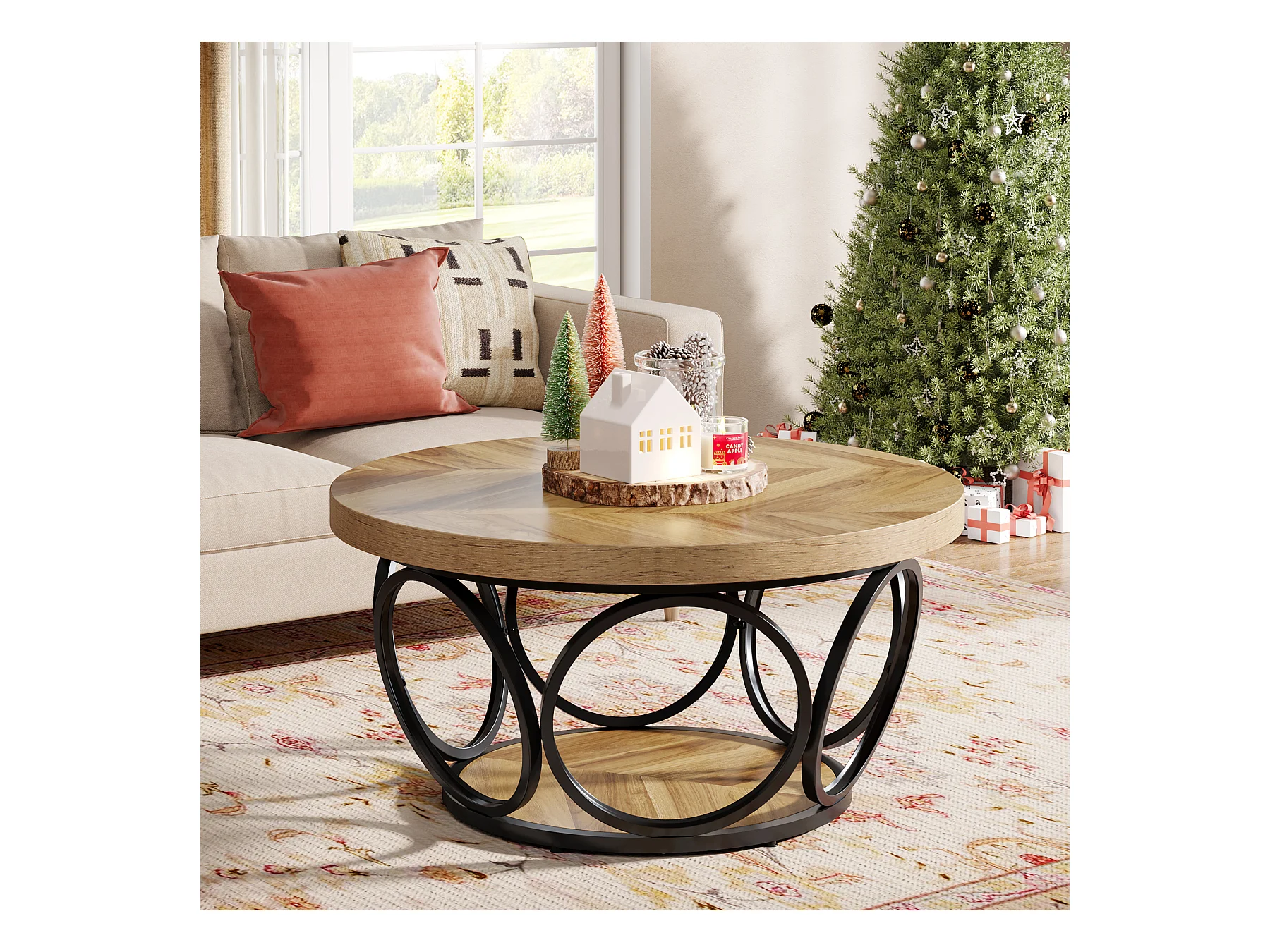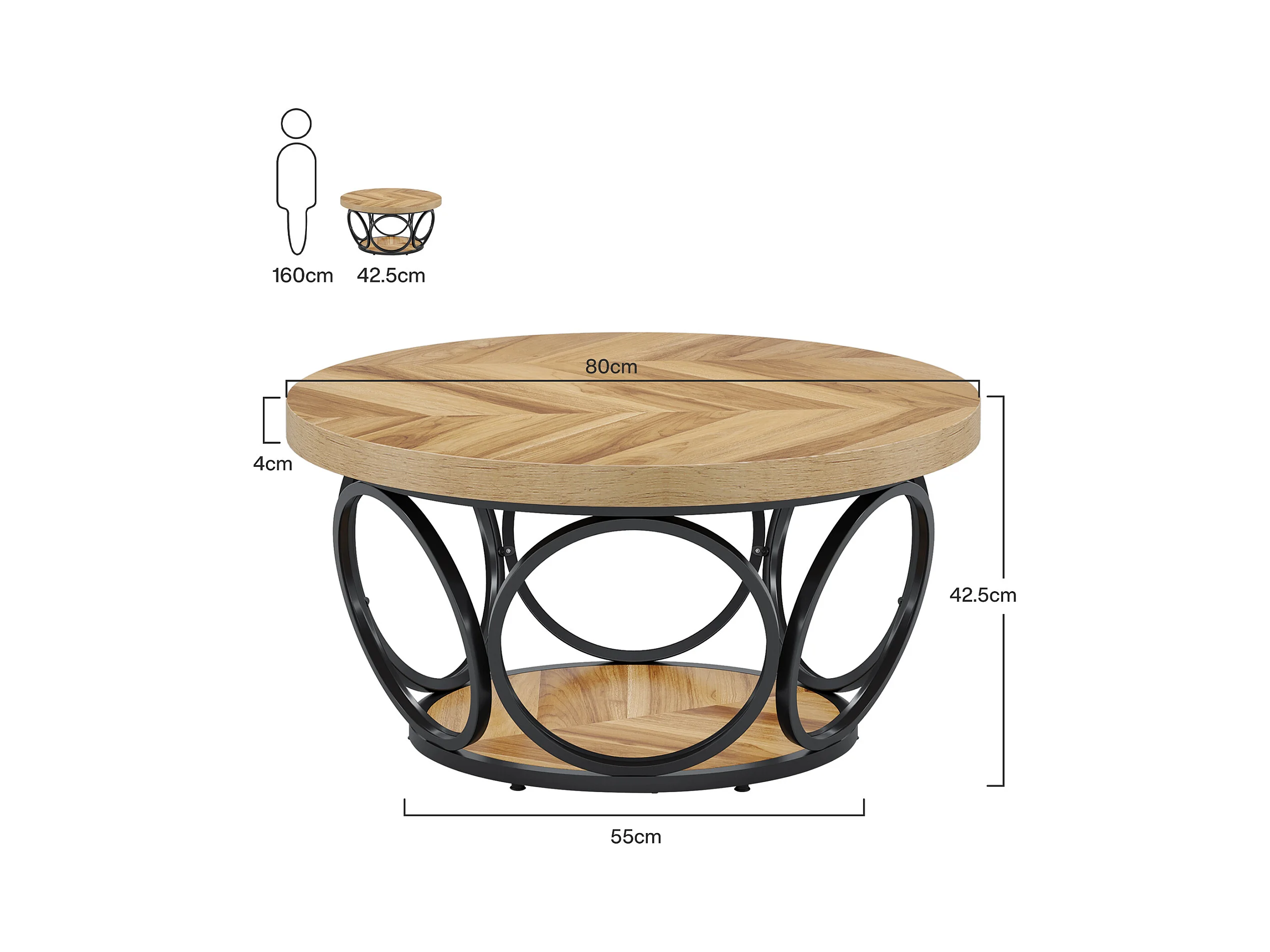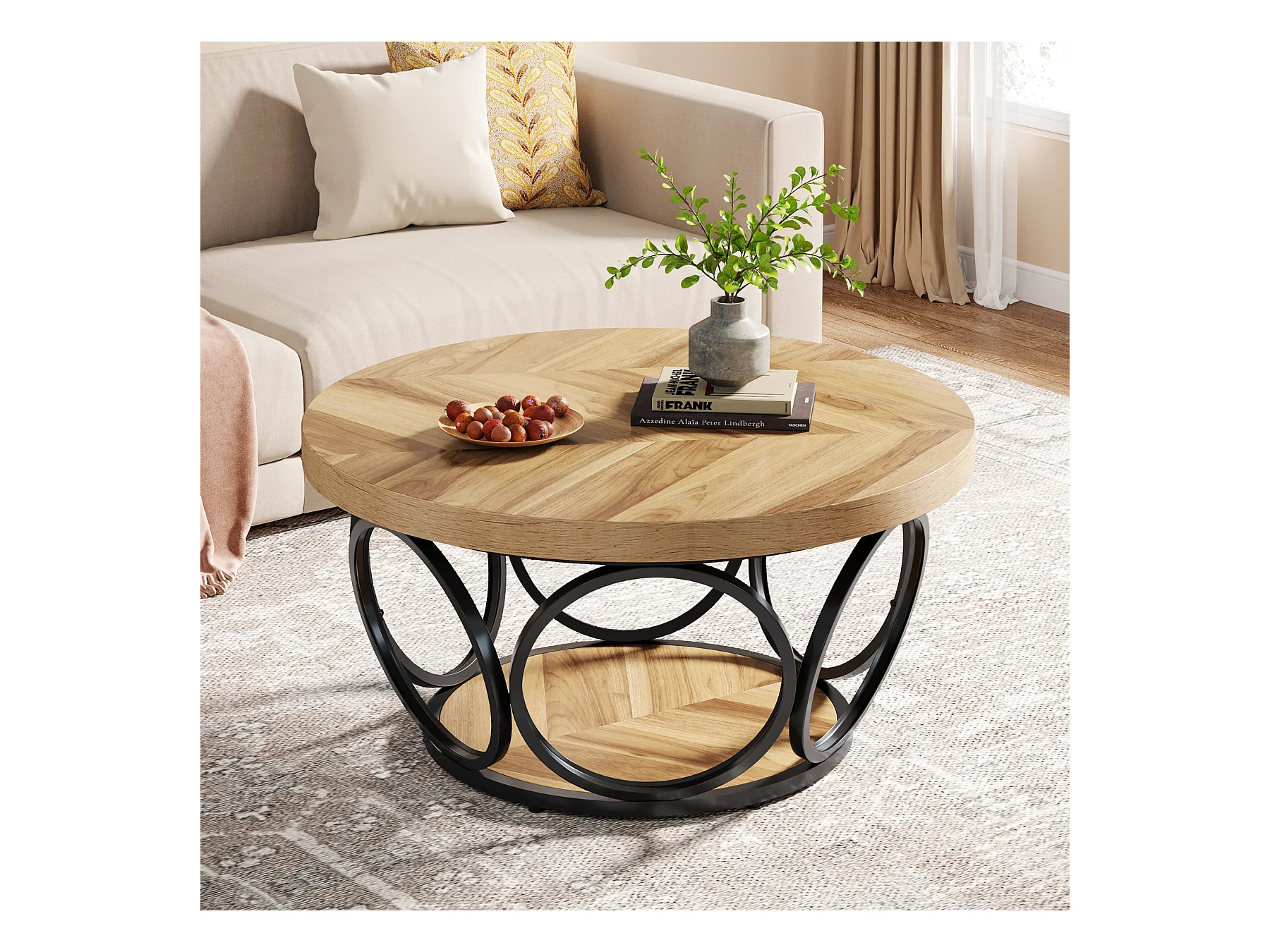 Table Basse Ronde, Table de Salon, Table de canapé, Structure en métal, Table Basse à 2 étages, Table Basse,Facile à Monter, Grain de Bois
