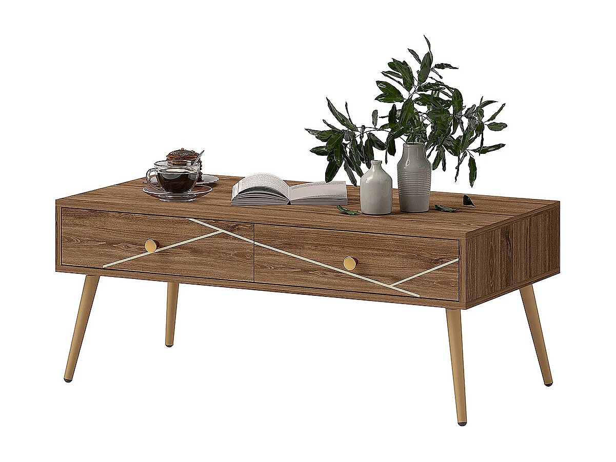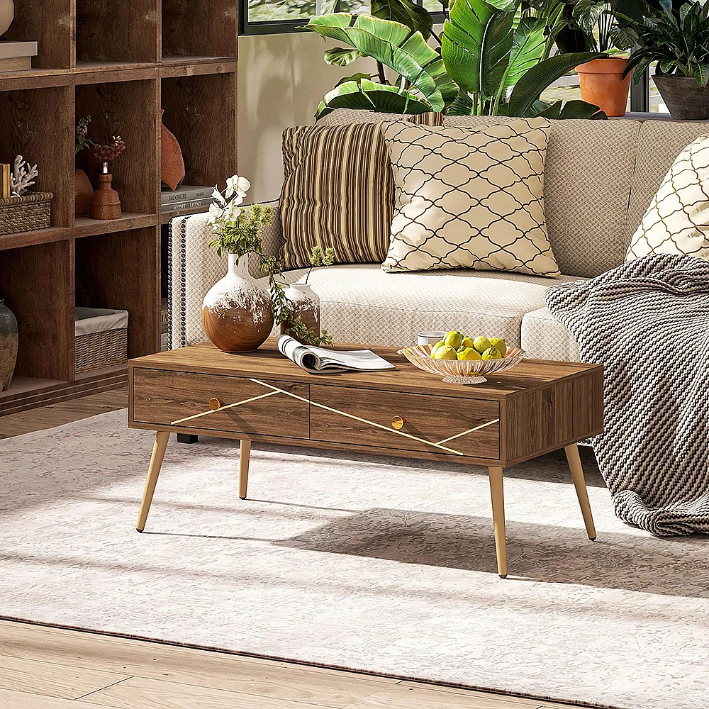 Table basse en bois grand plateau et 2 tiroirs design de luxe Élégant décoration avec lignes dorées peintes à la main brun