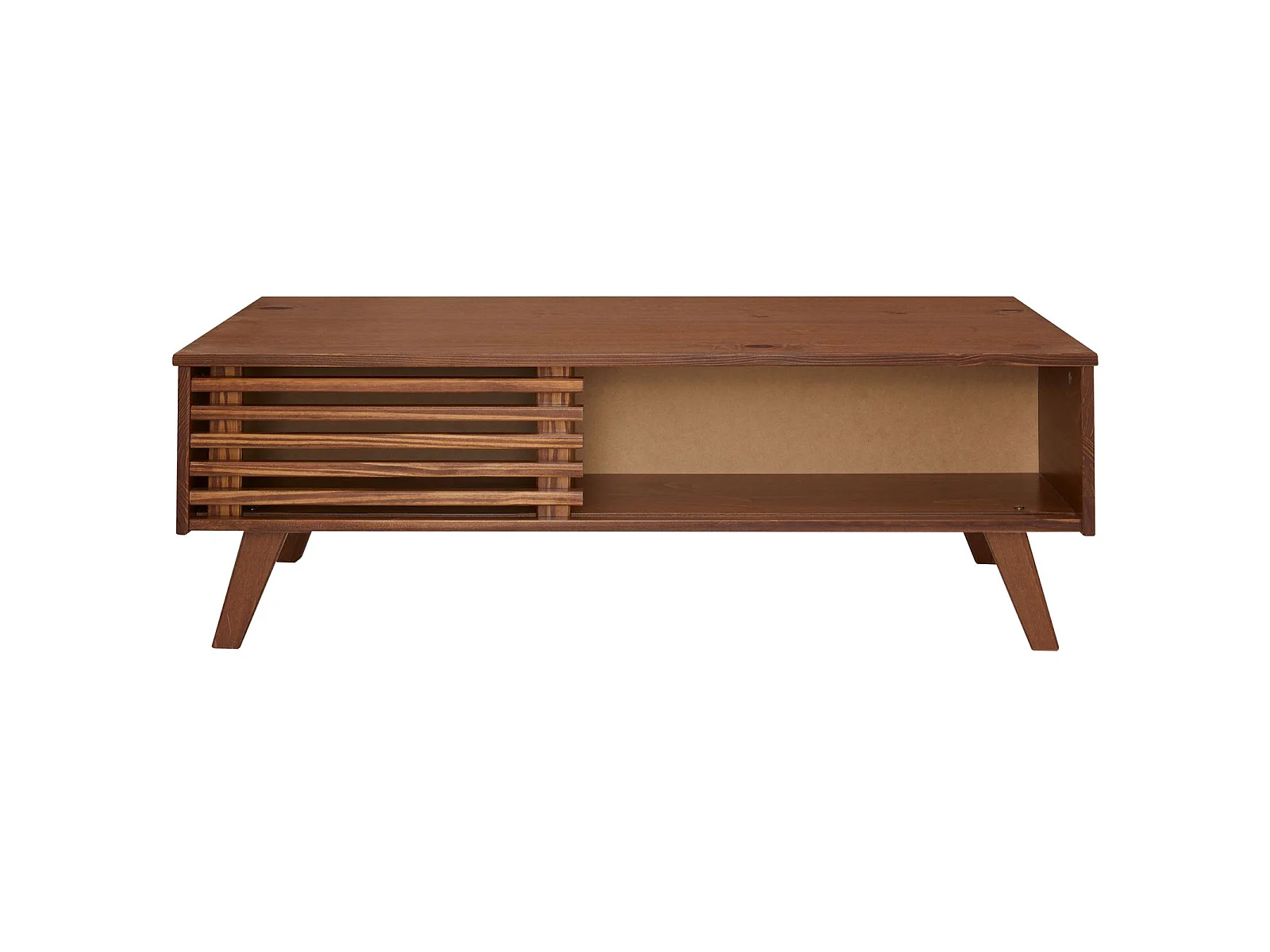 Table basse SEAN table de salon rectangulaire design vintage, 4 niches et des portes coulissantes ajourées, en pin lasuré brun foncé