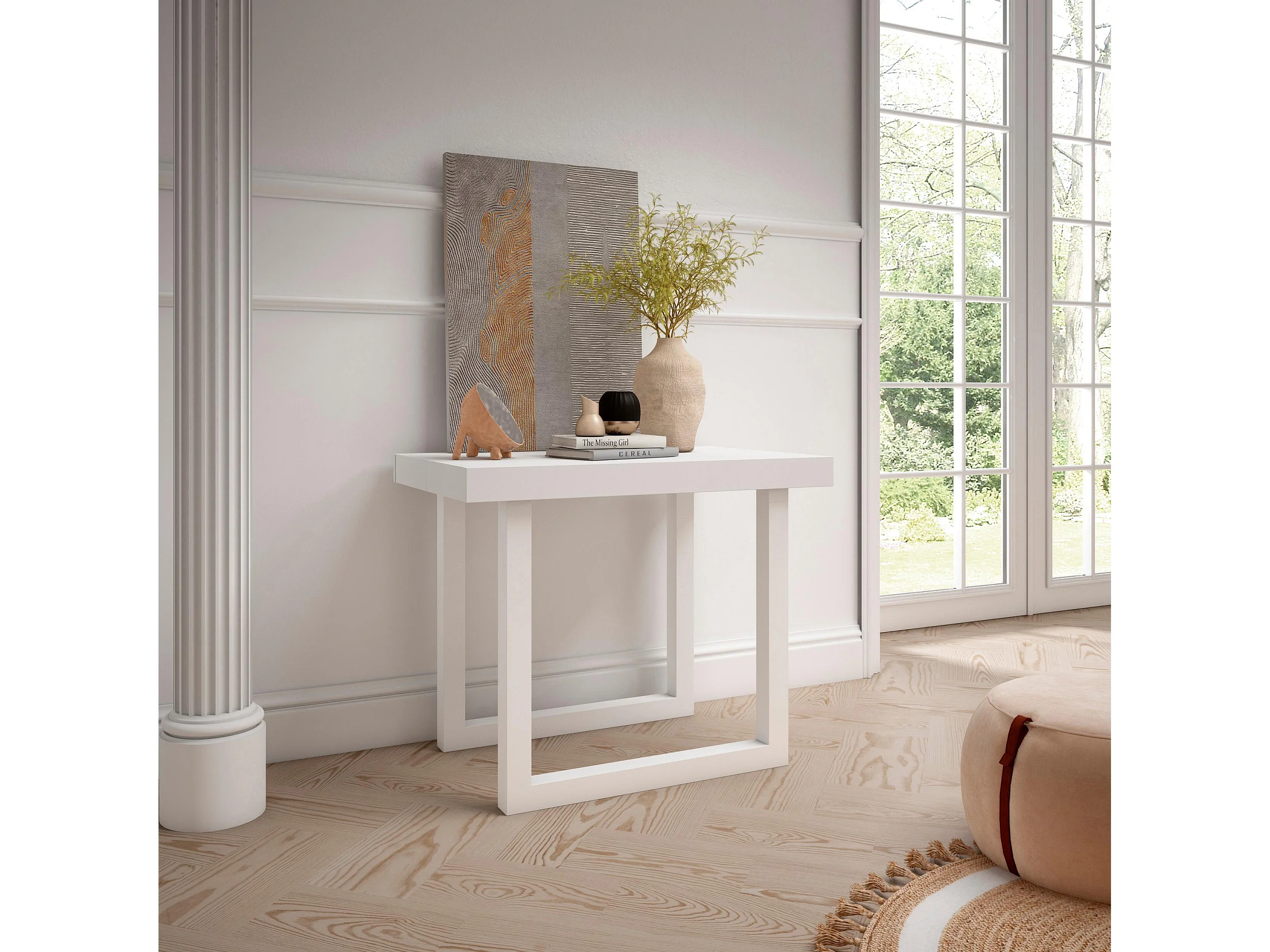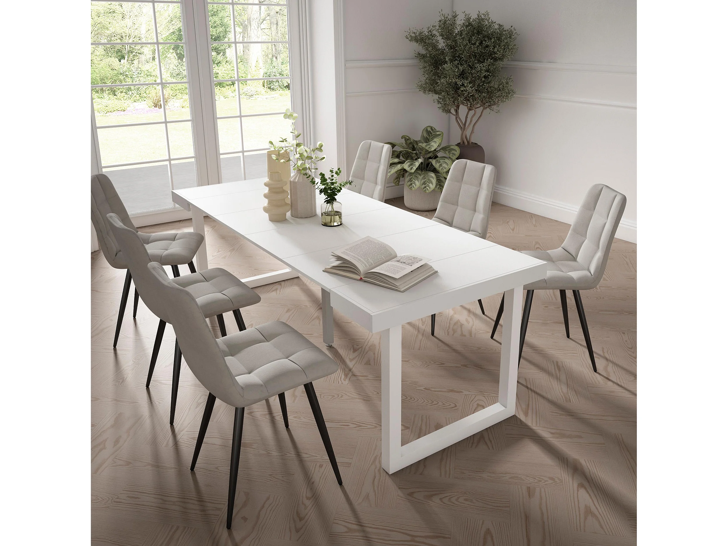 Table console extensible, 222x90x73cm, Pour 10 personnes, Pieds bois massif, Blanc