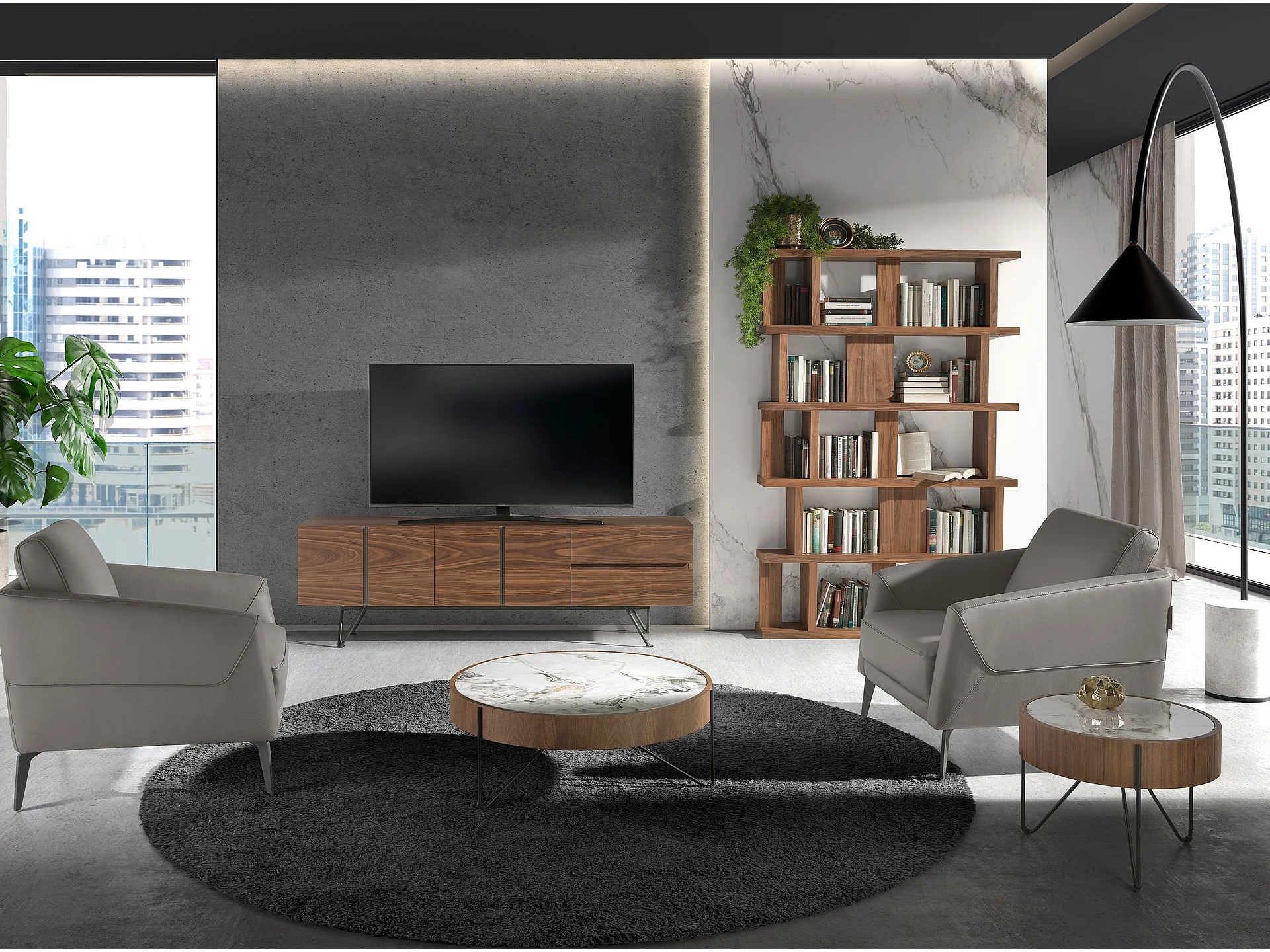 Table d'angle ronde en marbre porcelaine, noyer et acier noir 2139 ANGEL CERDA