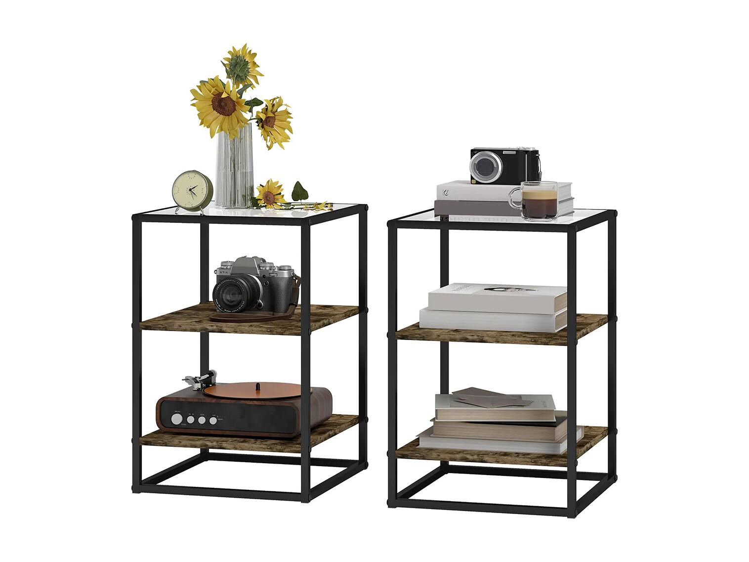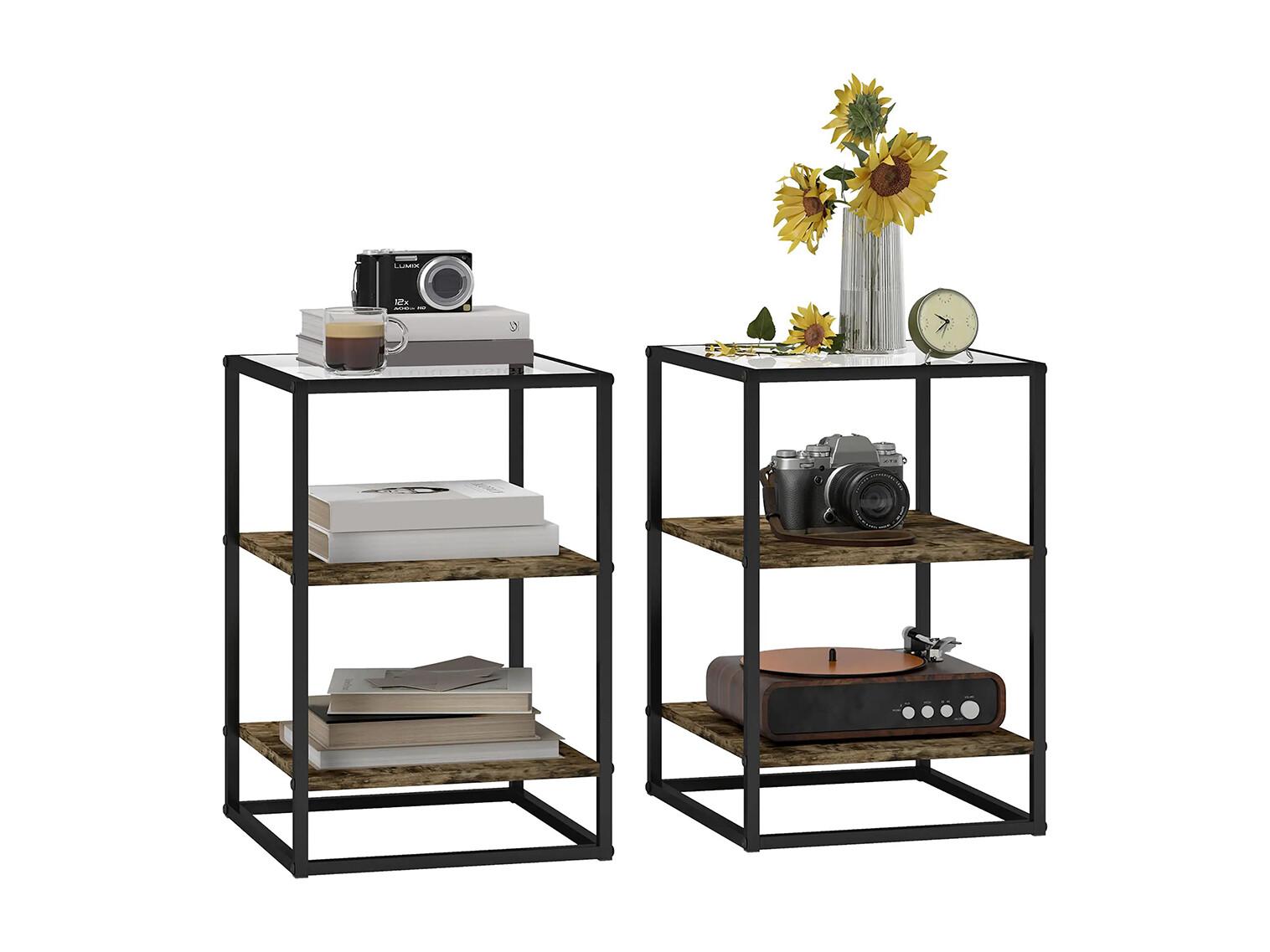 Table d'appoint 37 x 40 x 55,5 cm, comprenant 2 tables de chevet à trois niveaux, plateau en verre trempé, couleur brun vintage.