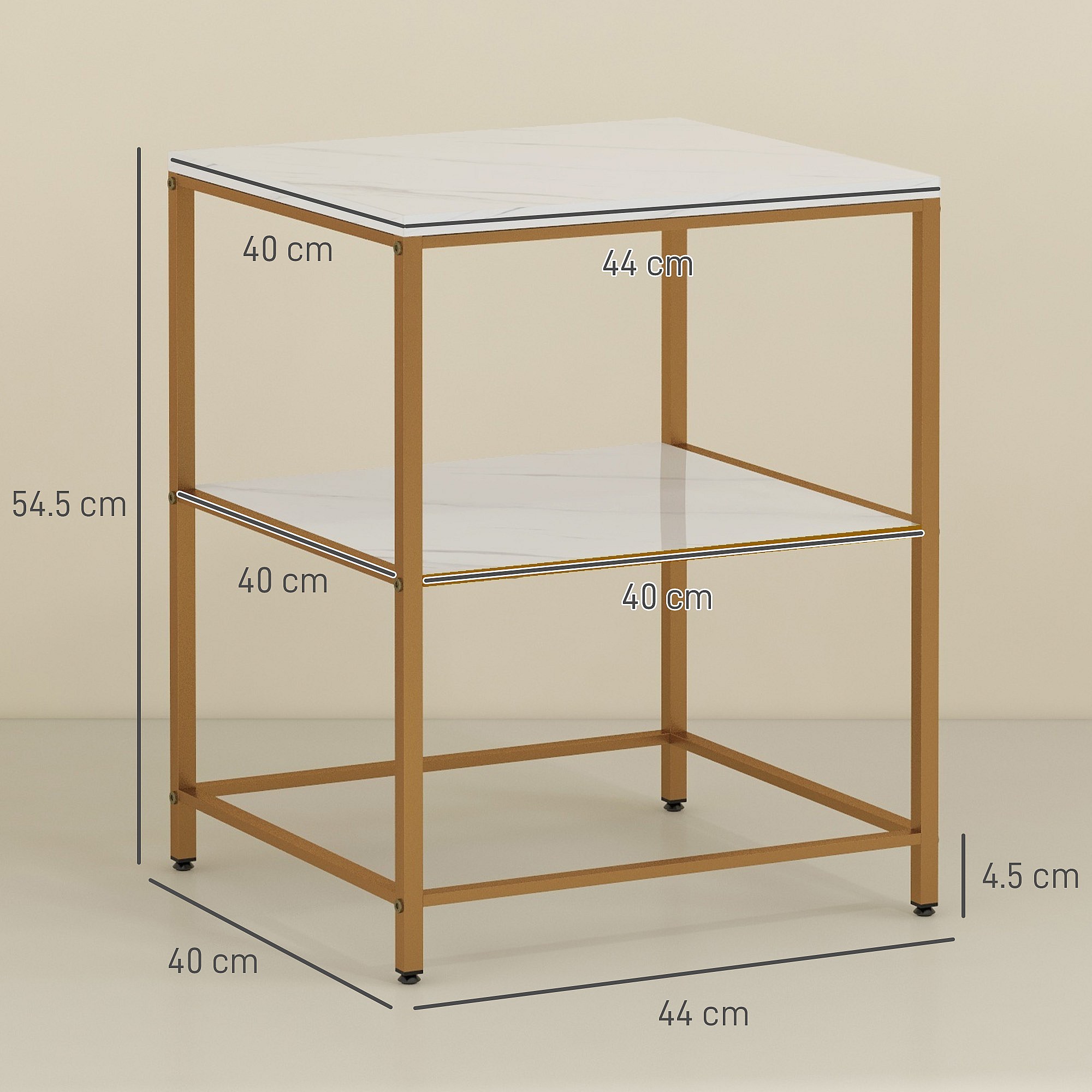 Table d'appoint bout de canapé 2 étagères style art déco métal doré aspect marbre blanc