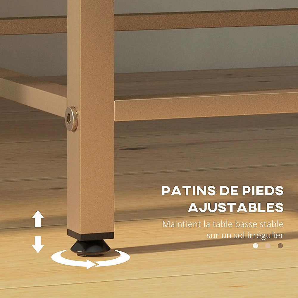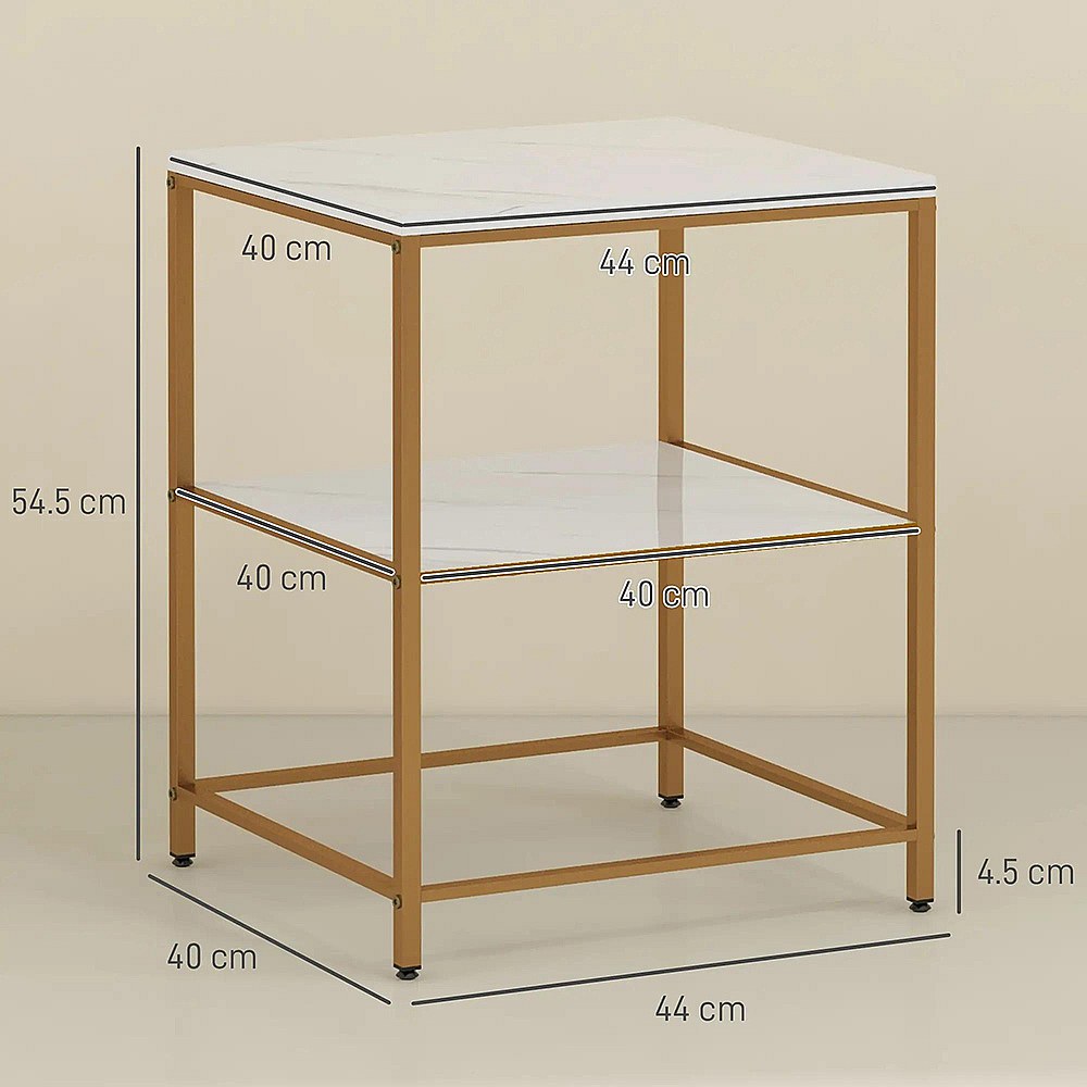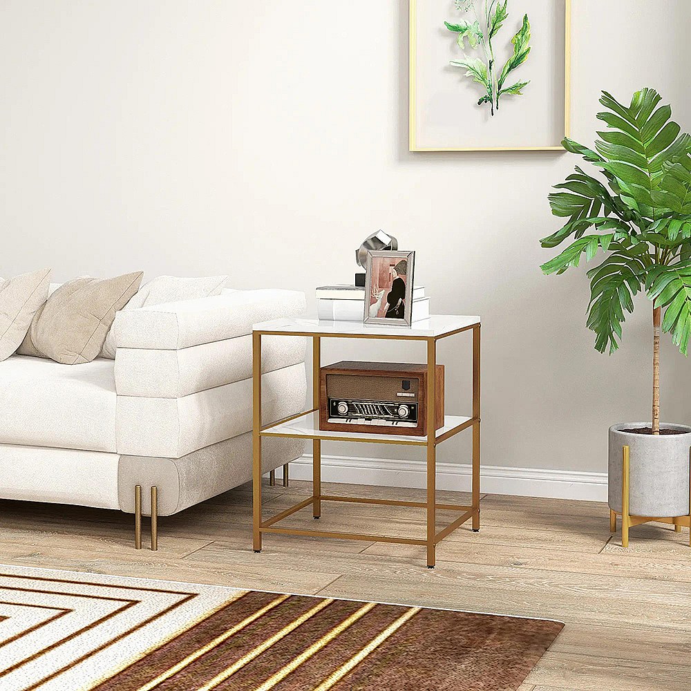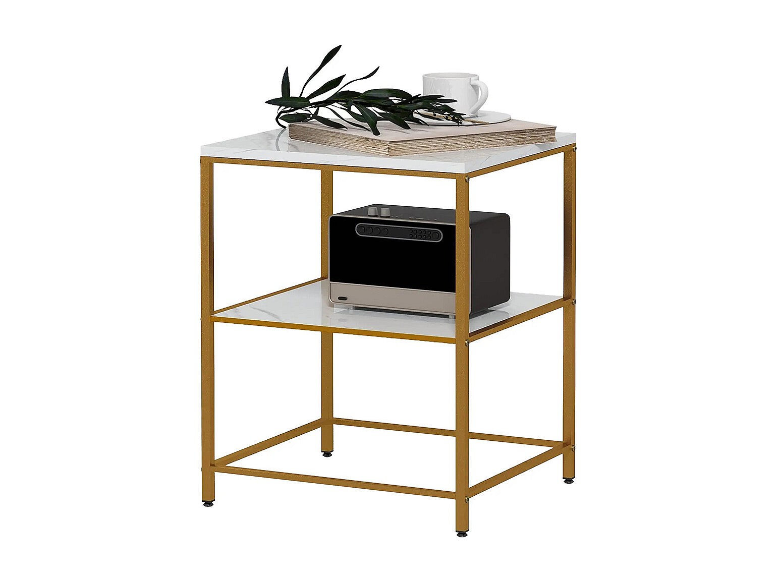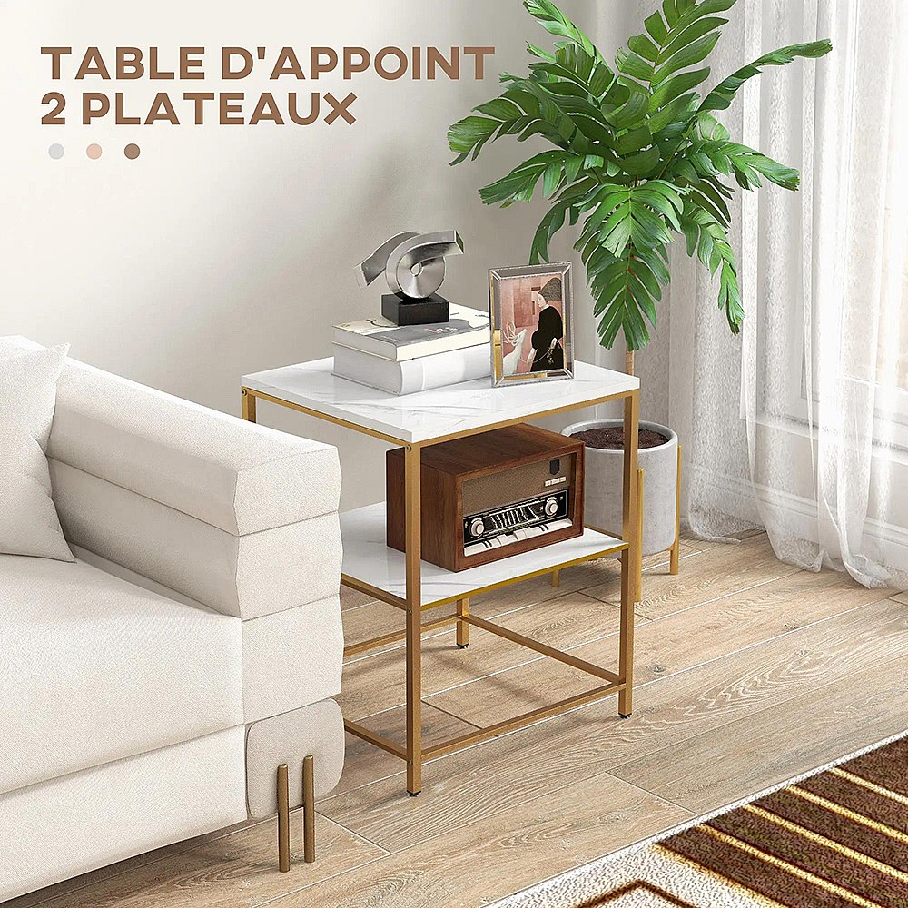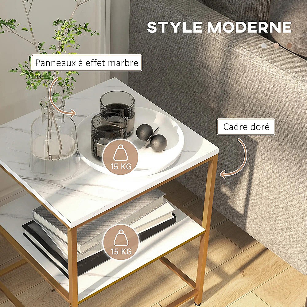 Table d'appoint bout de canapé avec 2 étagères effet marbre et structure en métal doré