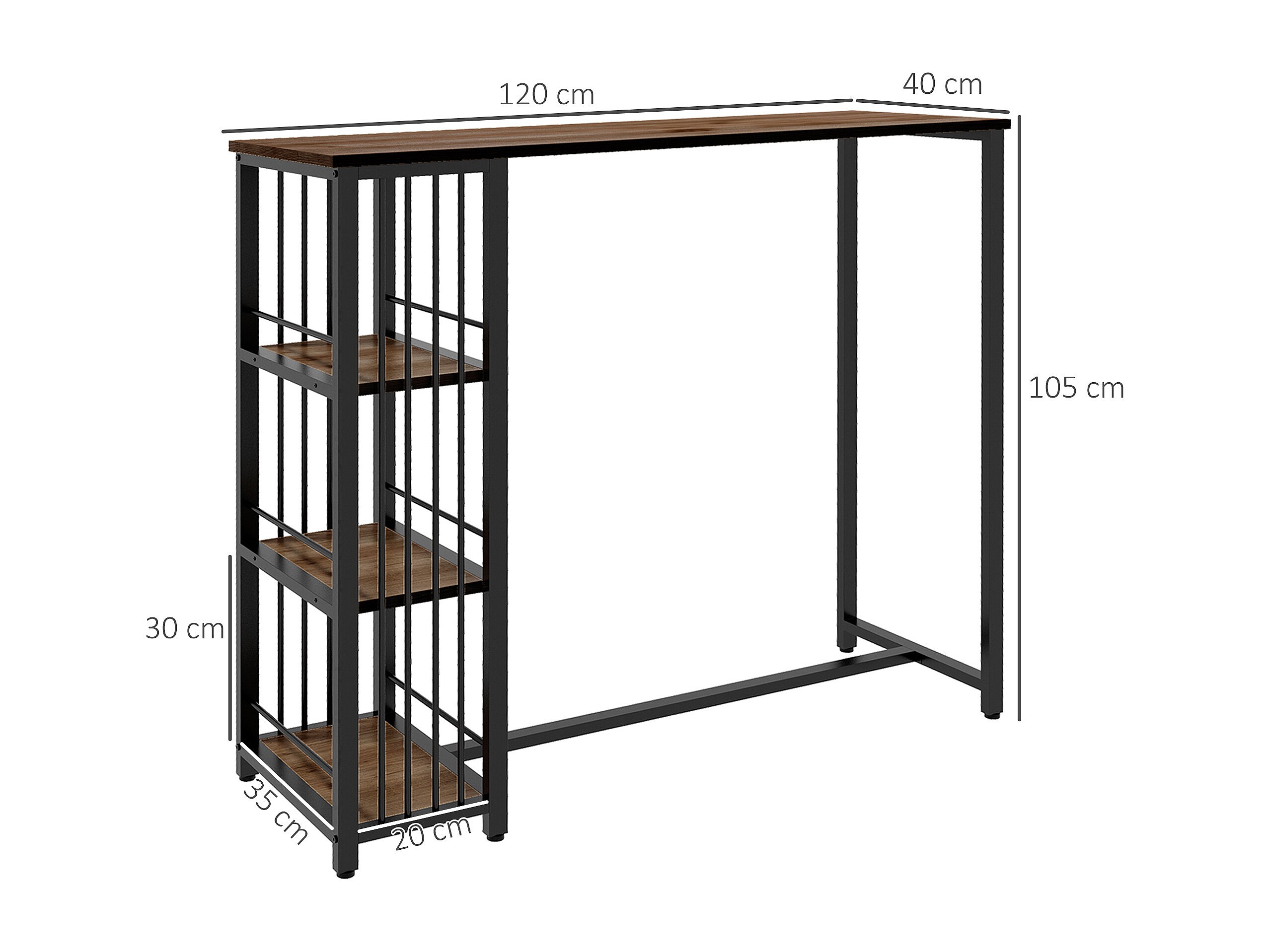 Table de bar extensible design industriel - 3 étagères intégrées - châssis métal noir aspect bois de noyer