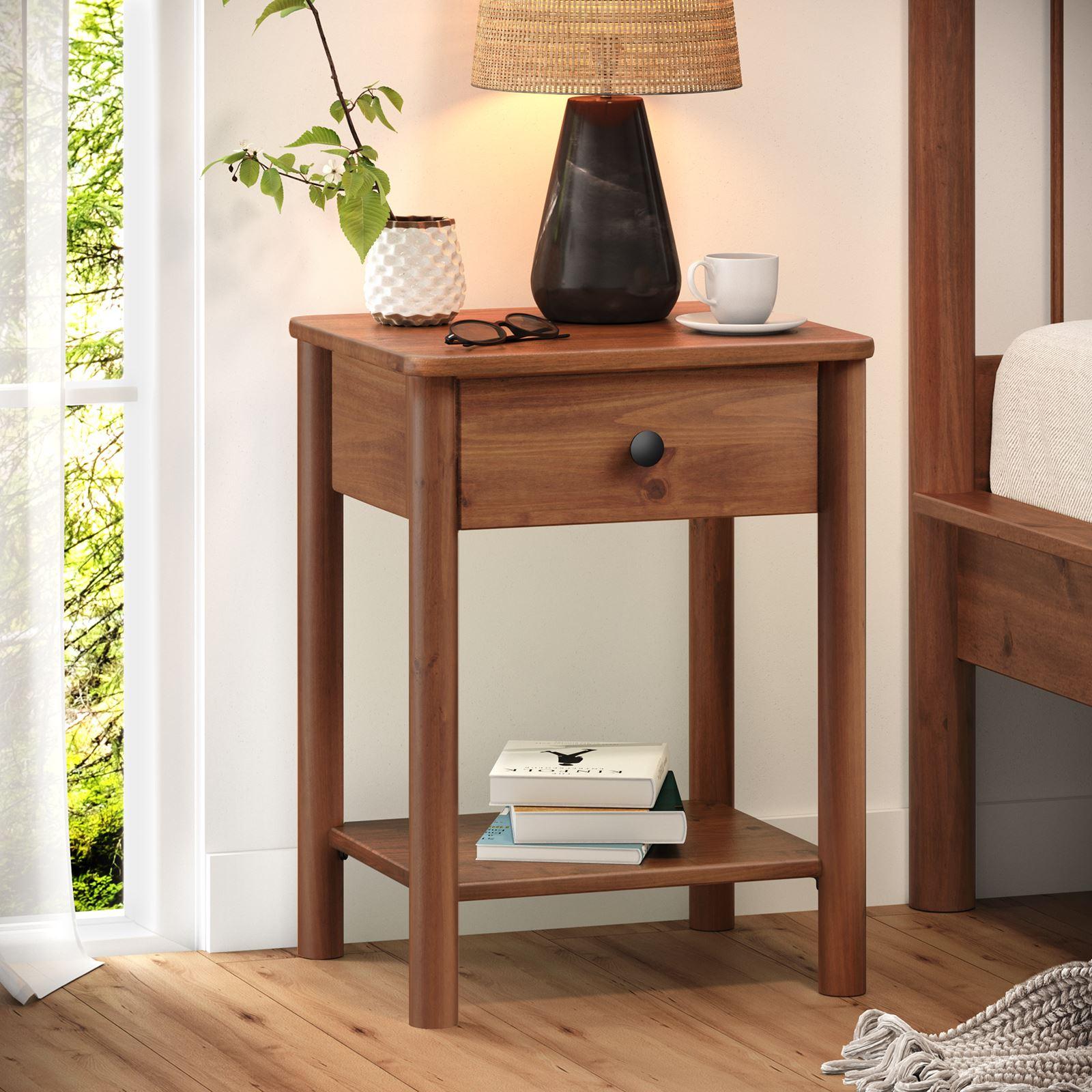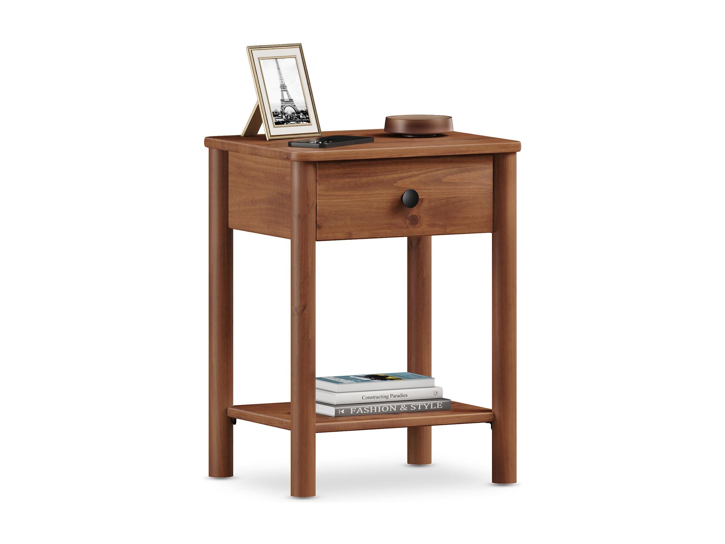 Table de chevet APOANA avec 1 tiroir et 1 tablette, dimensions montées 45 x 55 x 35 cm, pin massif brun foncé, style naturel