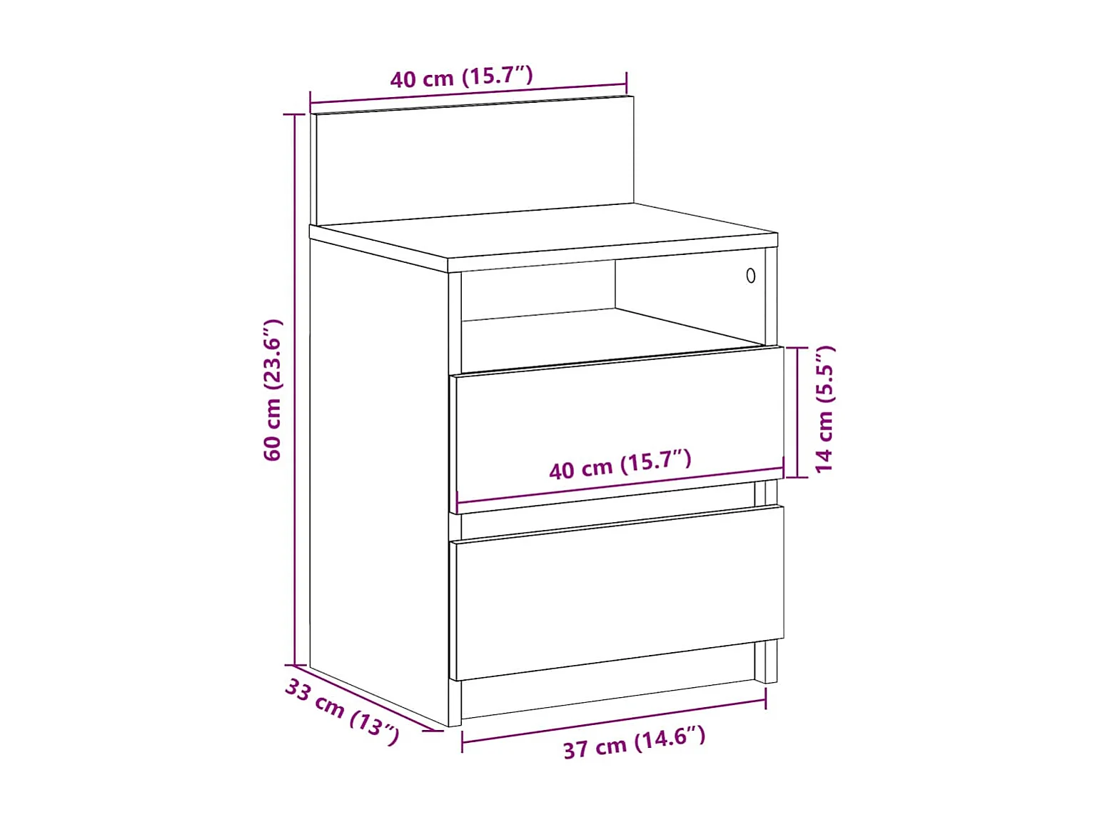 Table de chevet avec 2 tiroirs vieux bois 40x33x60 cm