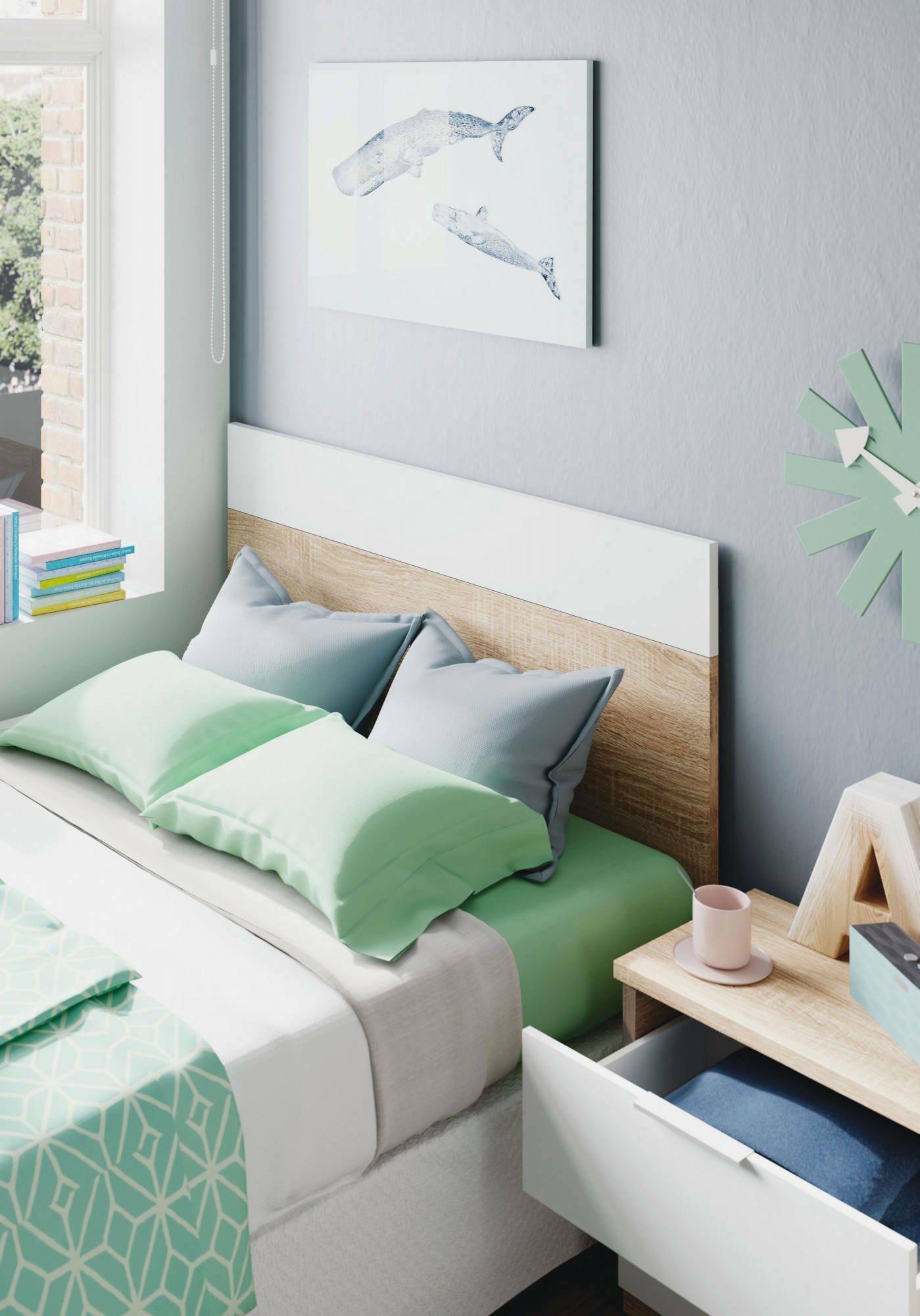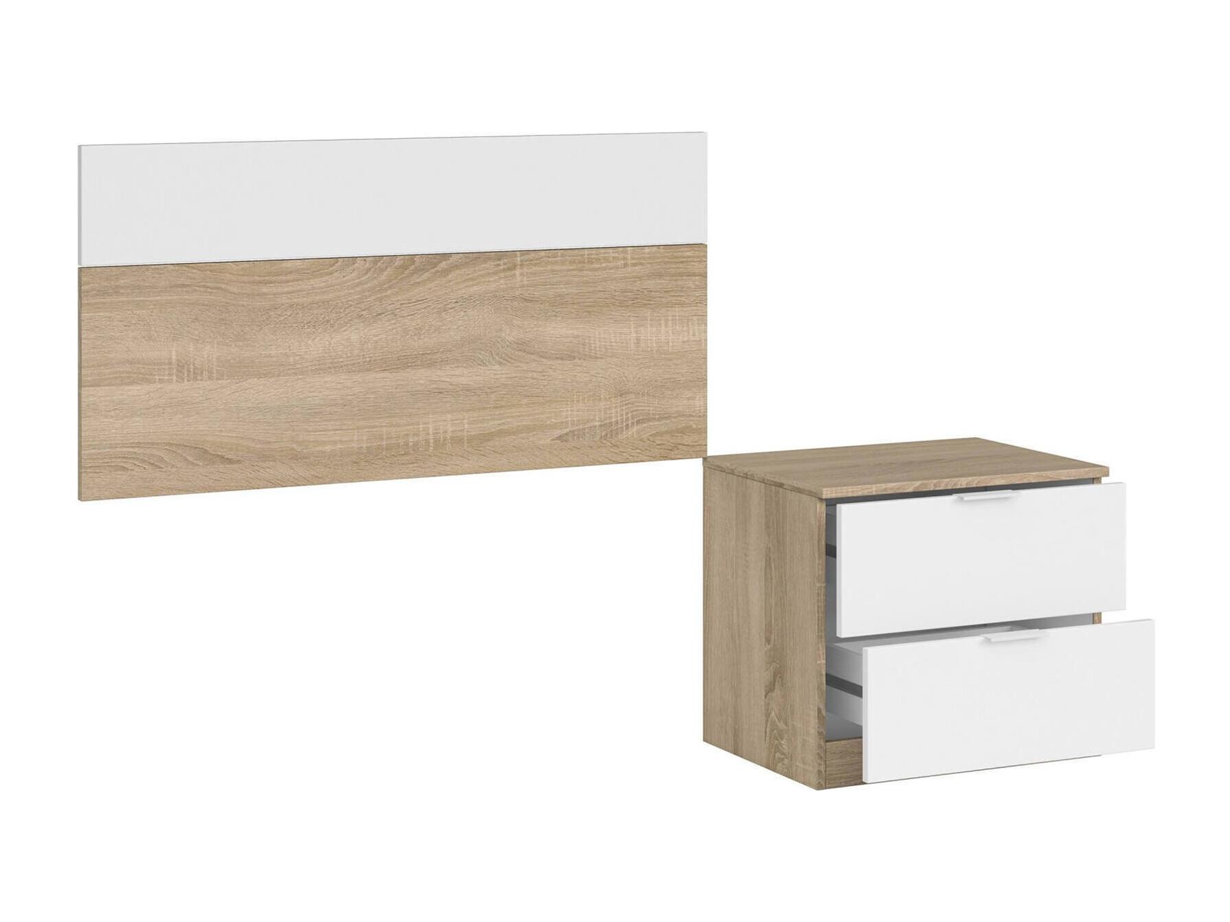 Tête de lit Honolulu, Table de chevet à deux tiroirs avec tête de lit pour lit simple de 90 cm, 100h50 cm, Chêne et Blanc