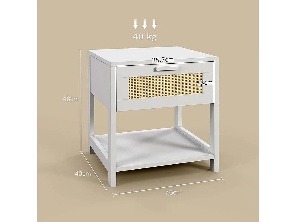 Table de chevet table de nuit avec tiroir et étagère, cannage en rotin, dim. 40L x 40l x 48H cm, blanc