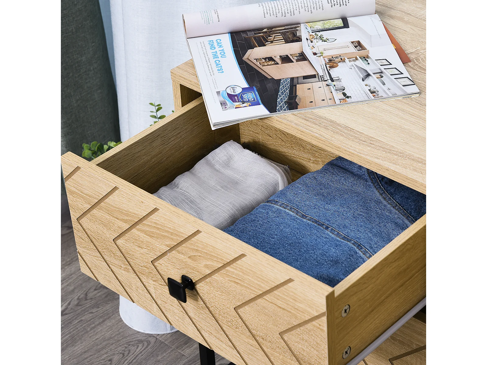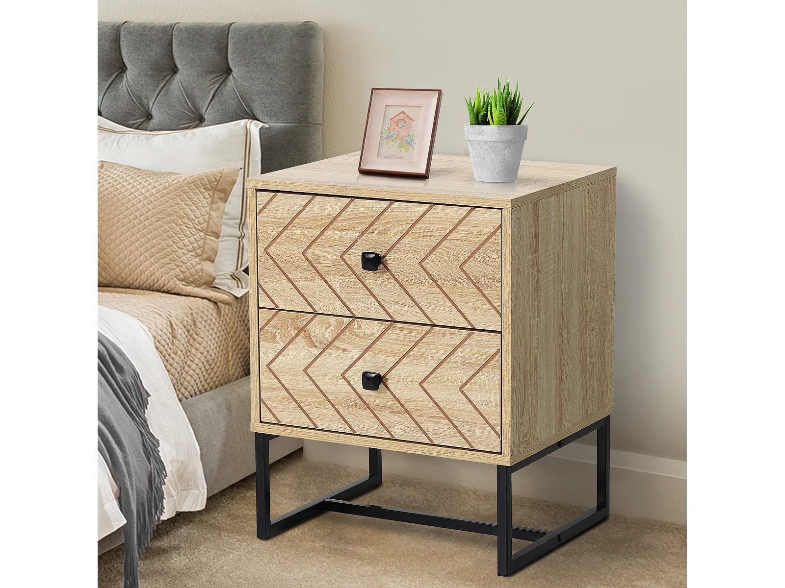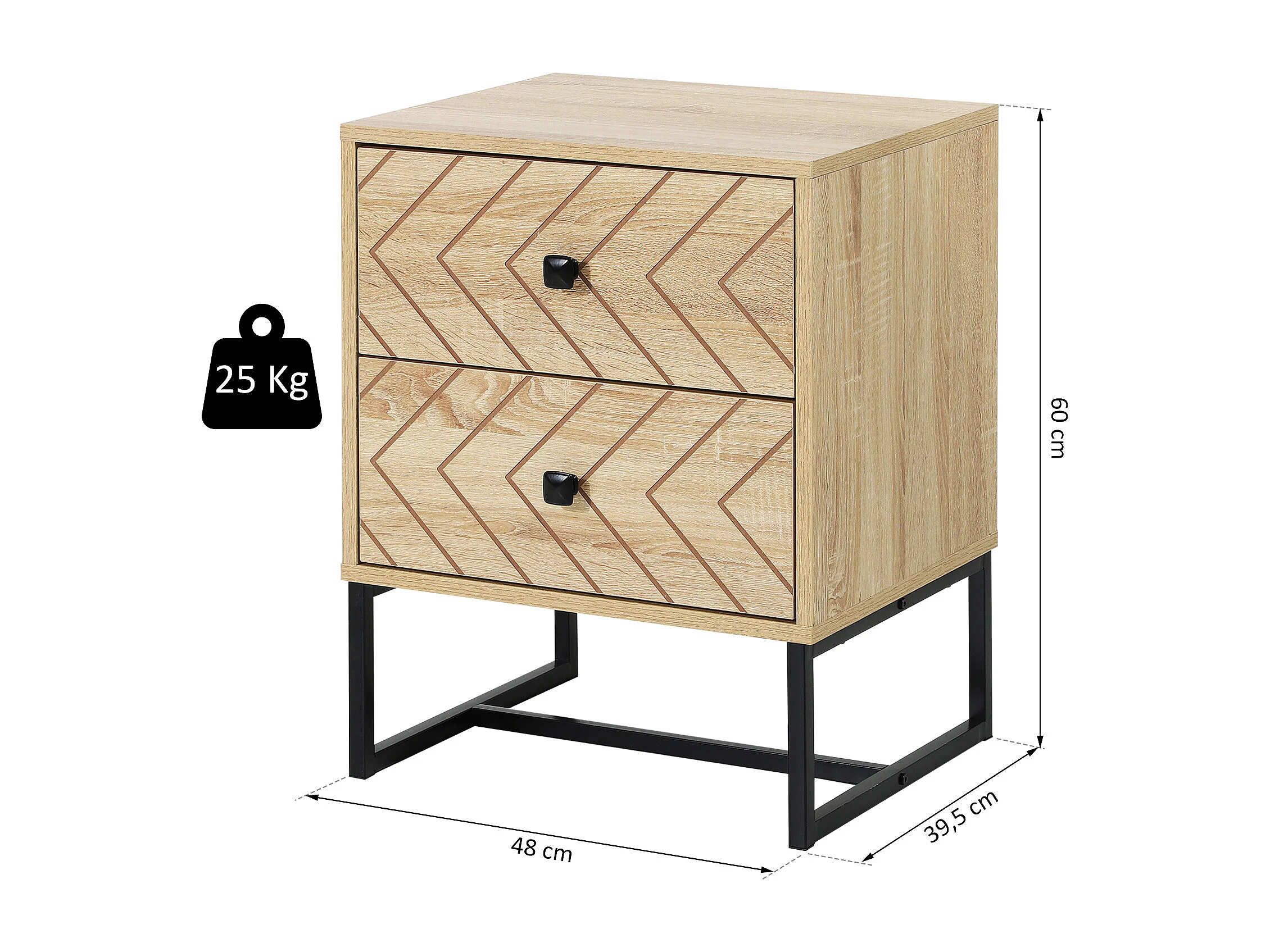 Table de chevet table de nuit style graphique 48L x 39,5l x 60H cm 2 tiroirs métal noir panneaux particules MDF imitation bois clair