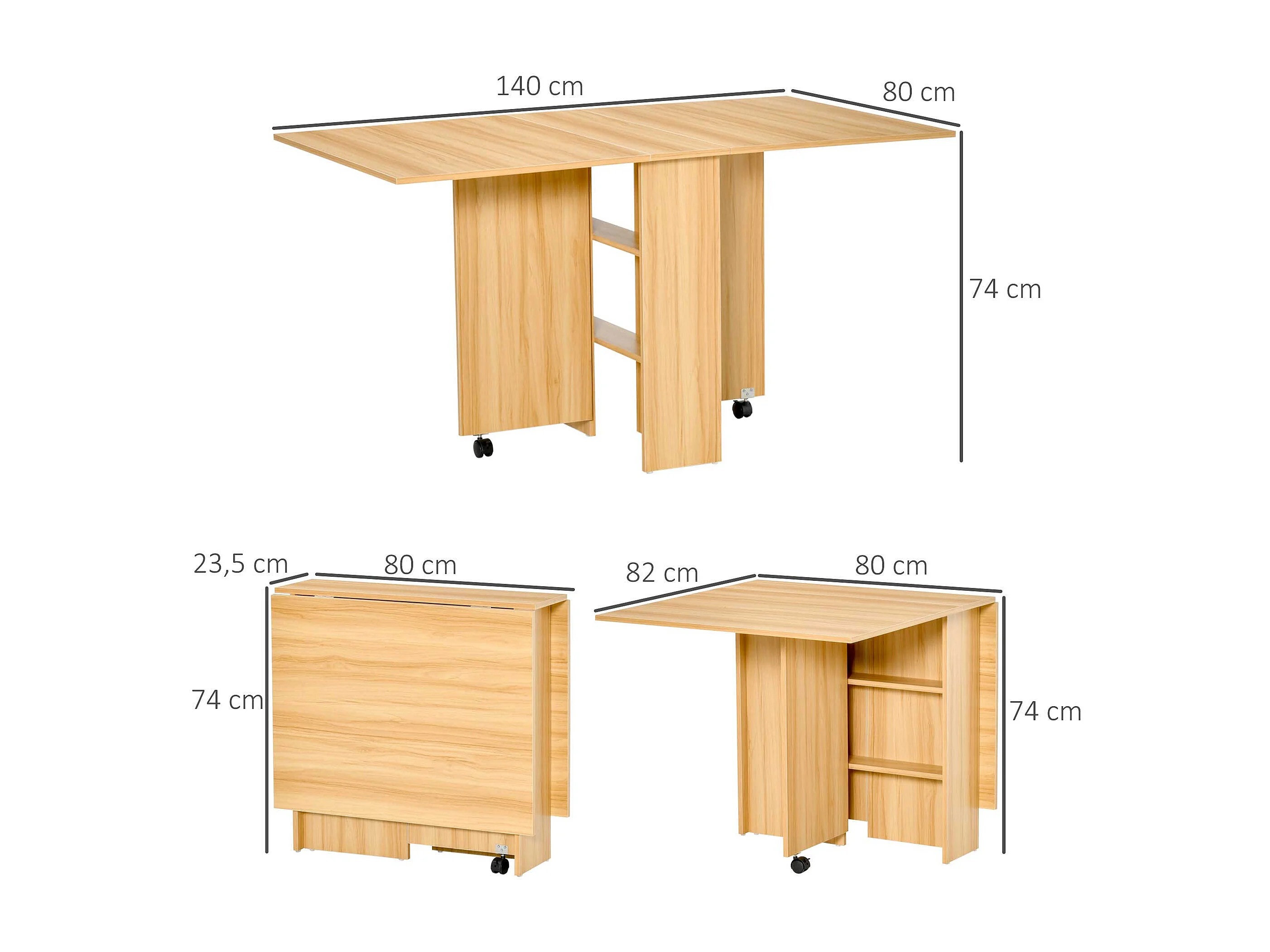 Table de cuisine salon pliable mobile sur roulettes 140L x 80l x 74H cm 2 étagères intégrées coloris chêne