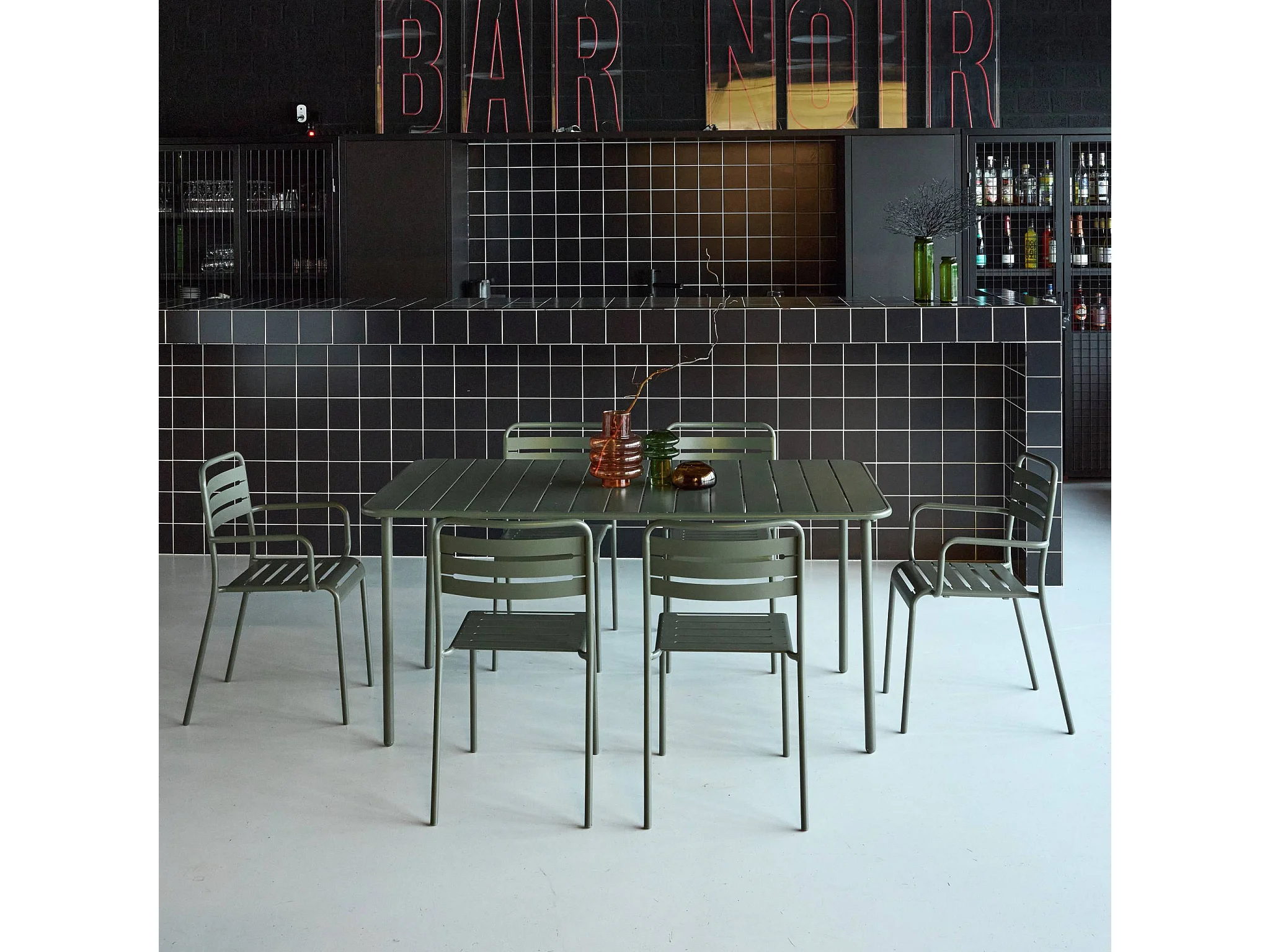 Table de jardin métal + 6 assises kaki. acier traitement anti rouille