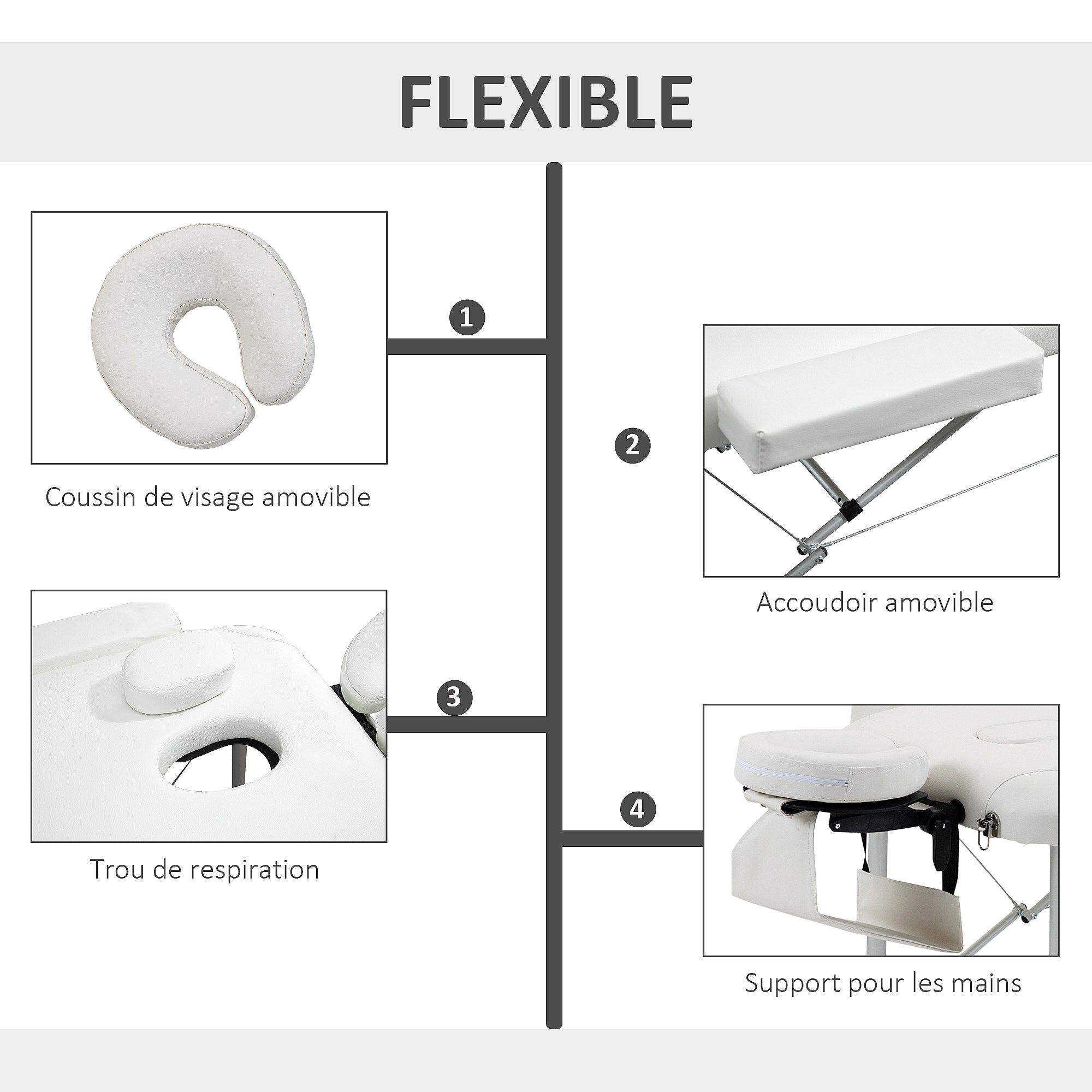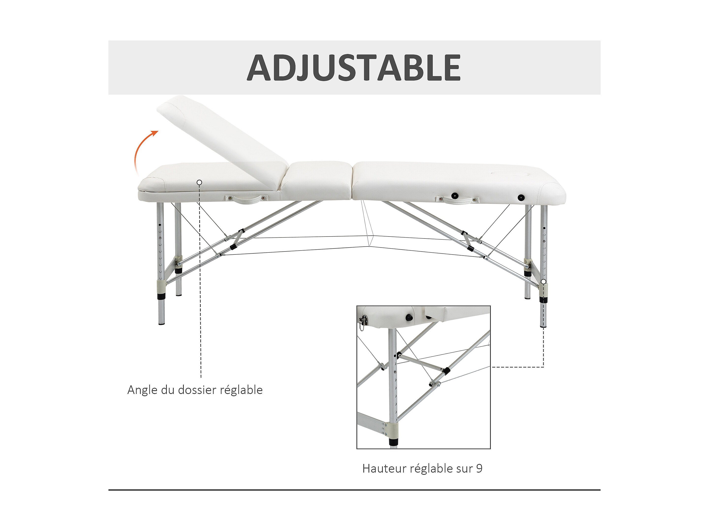 Table de massage pliable 3 zones hauteur réglable dim. 215L x 60l x 61-84H cm alu. synthétique PVC blanc