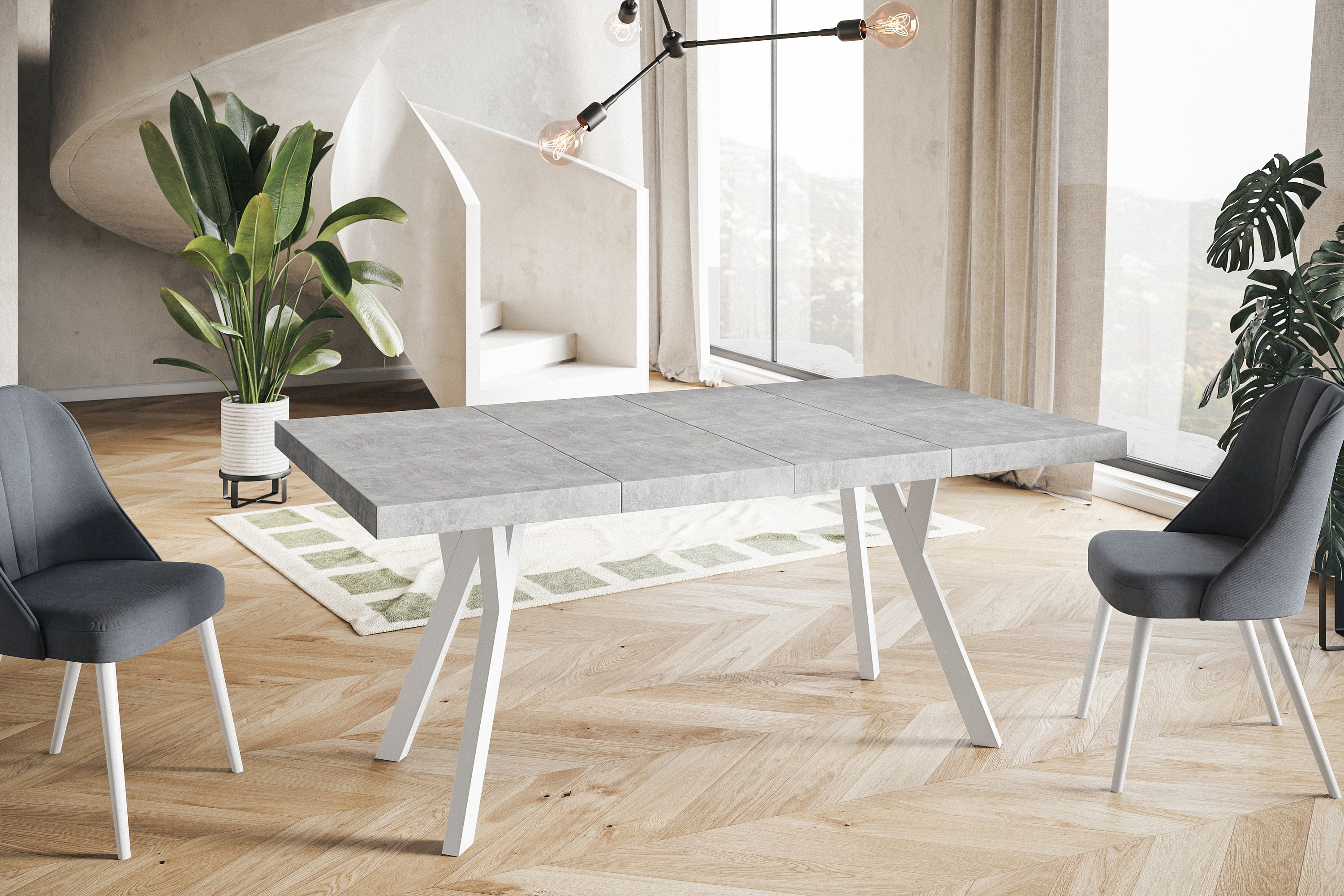 Table de salle à manger carrée RICO, table à rallonges, dimensions: 120-220X120X77 cm, couleur: graphite, avec pieds en bois de couleur blanche