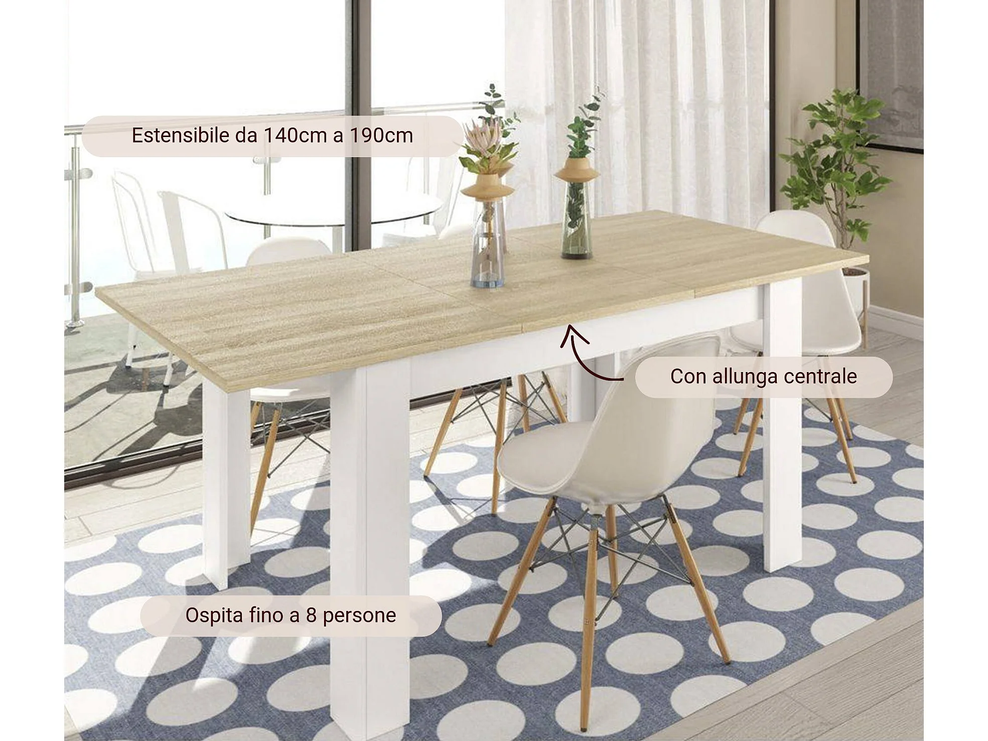 Table extensible Dalice, Console extensible pour salle à manger, Table de cuisine ouvrant avec rallonge, 140/190x90h78 cm, Chêne et Blanc