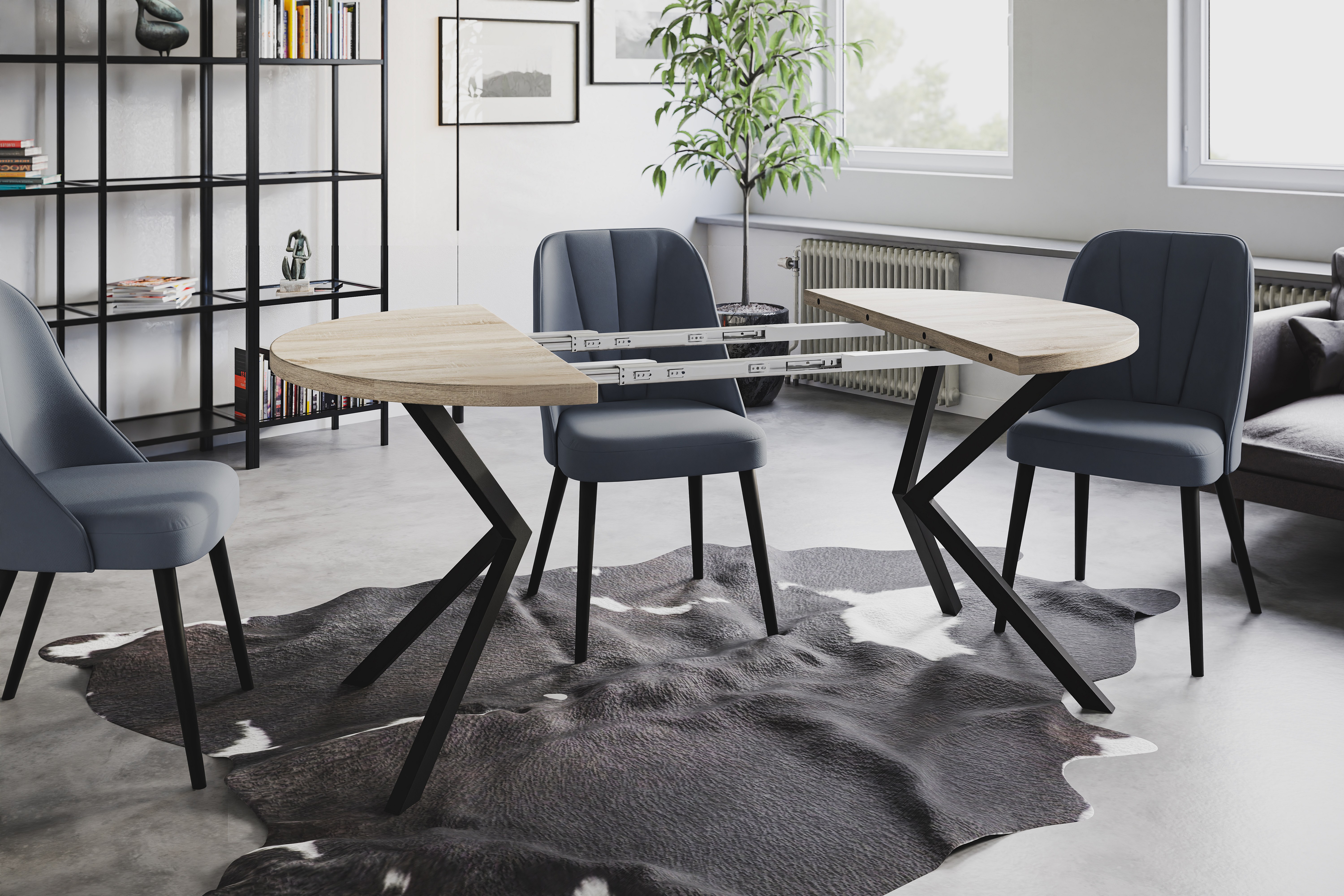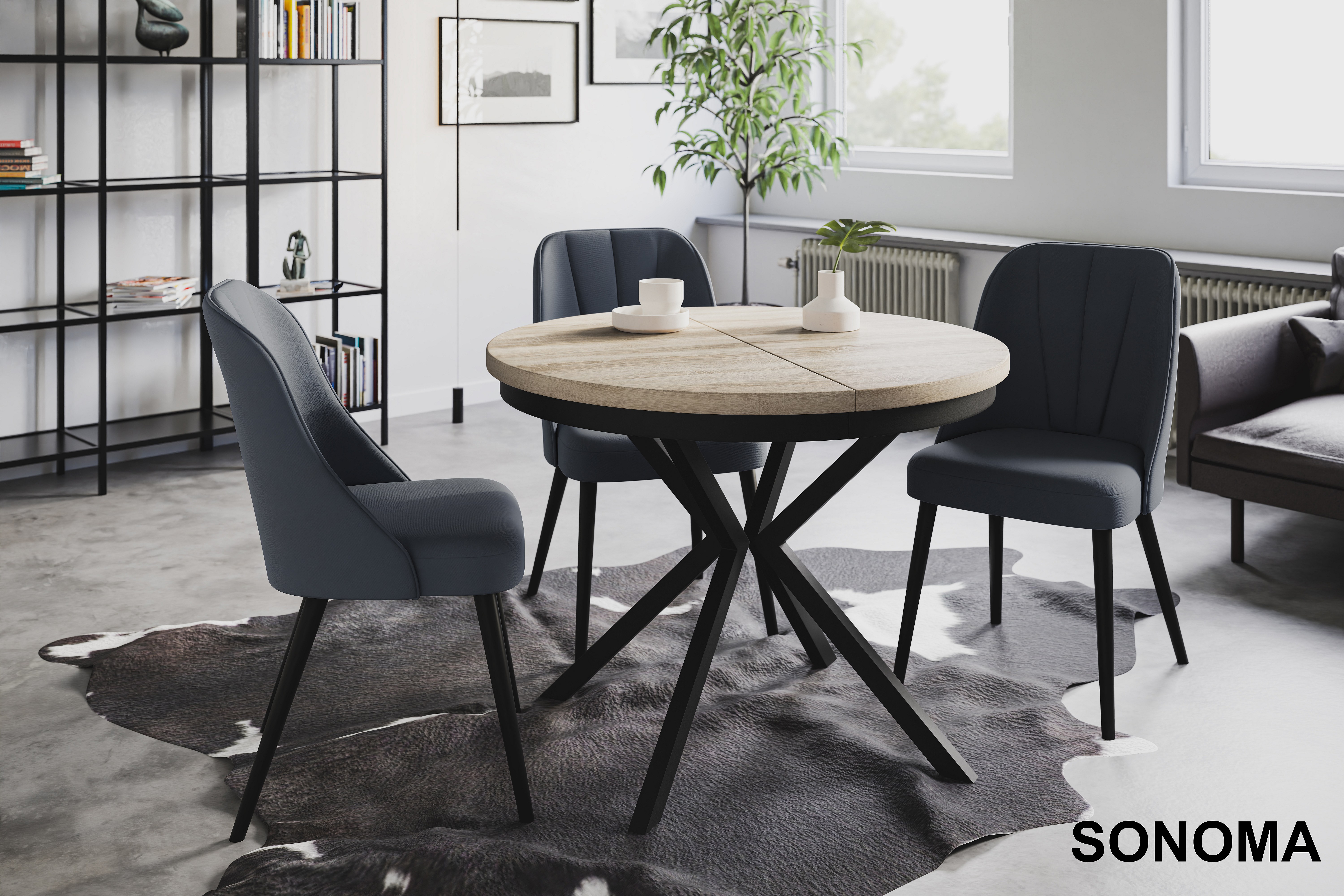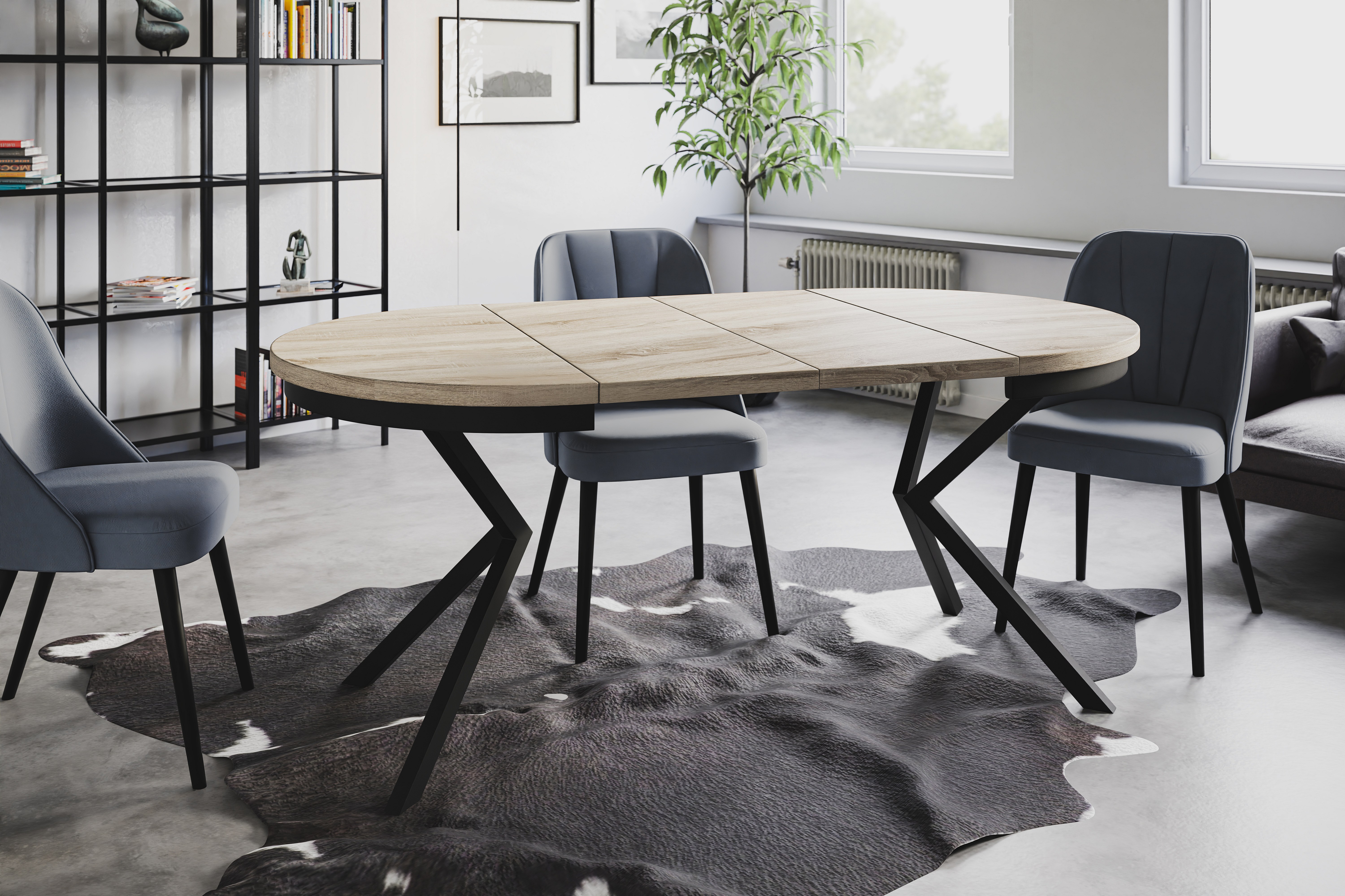 Table de salle à manger ronde BERGO, table à rallonges Diamètre : 120 cm/200 cm, couleur de la table basse : beige, avec pieds métalliques de couleur noire
