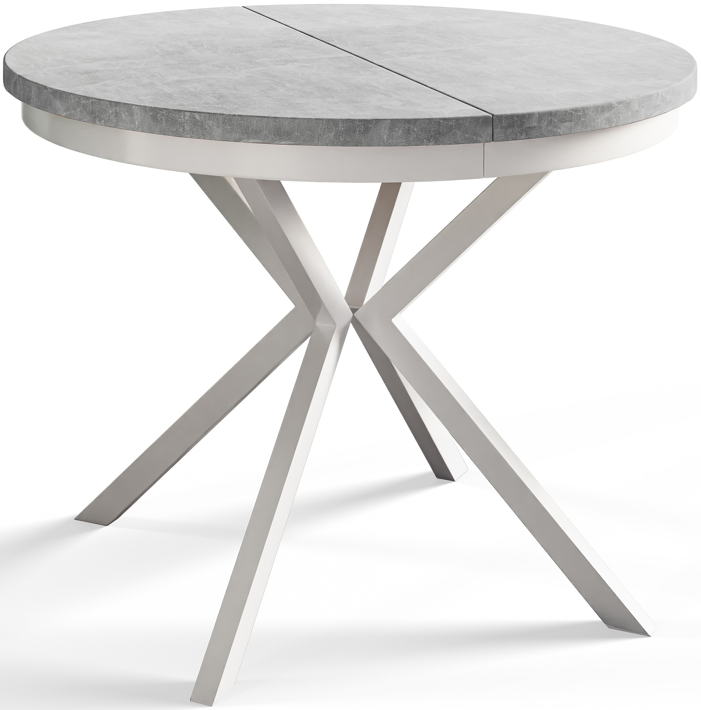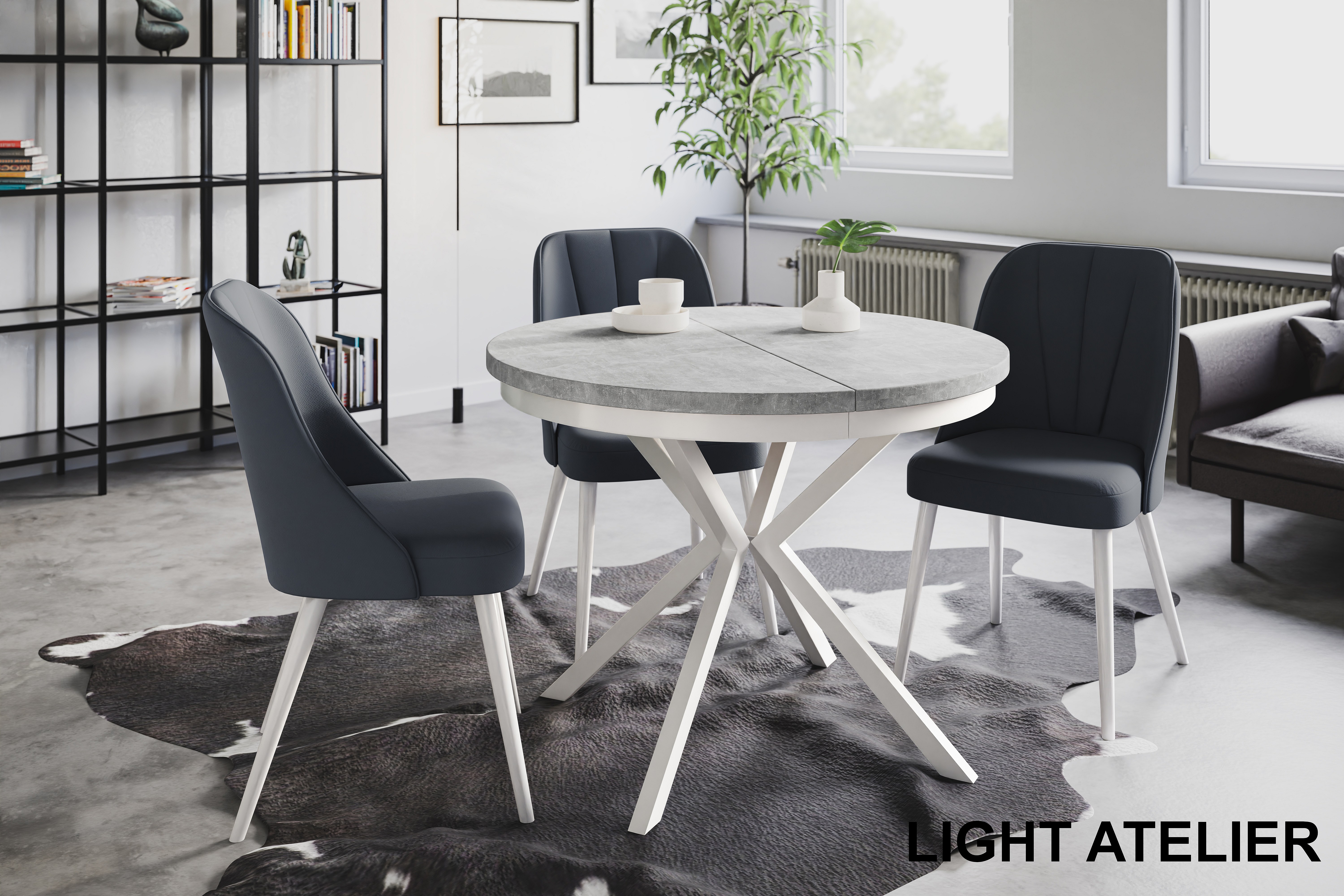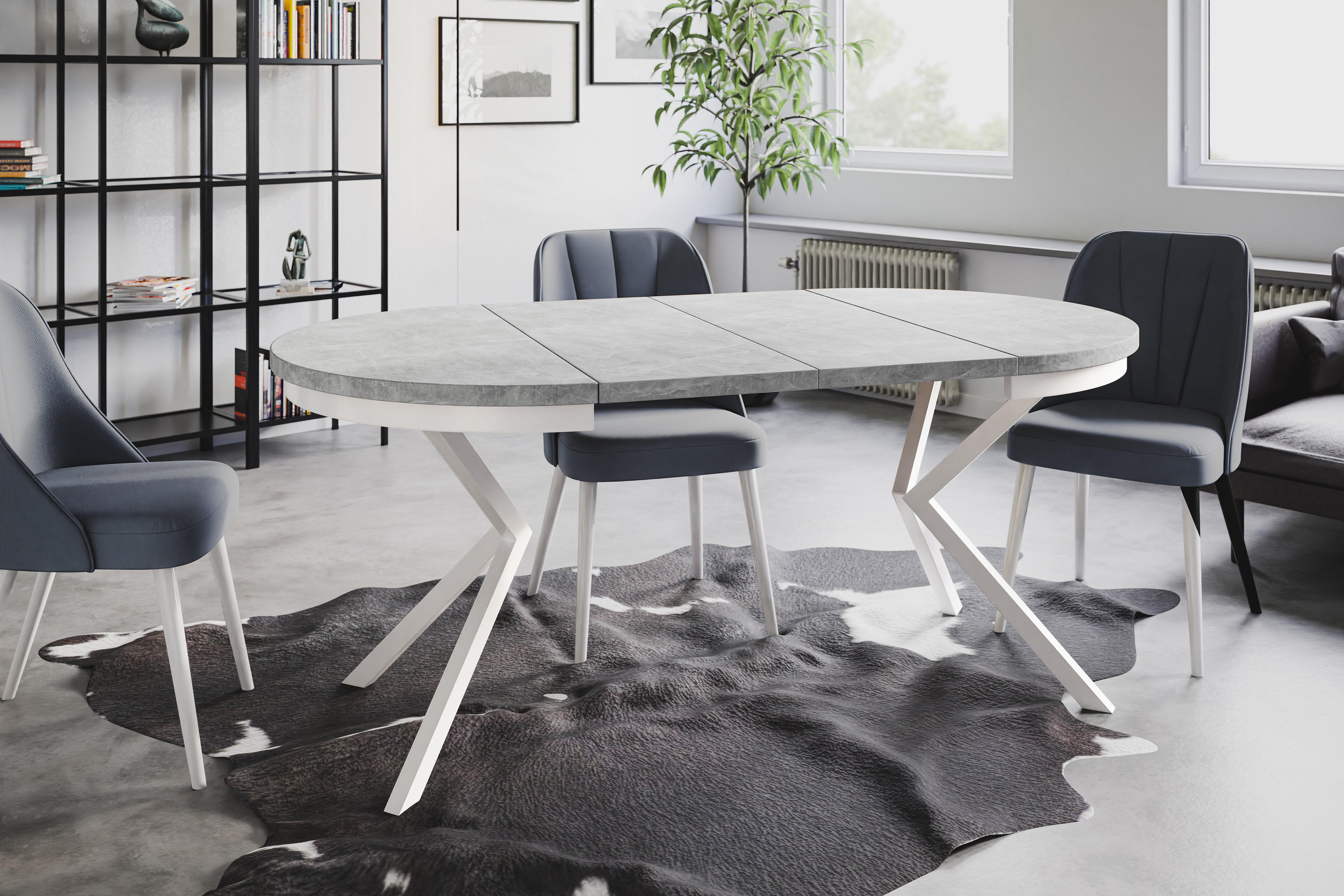 Table de salle à manger ronde BERGO, table à rallonges Diamètre : 120 cm/200 cm, couleur de la table basse : gris clair, avec pieds métalliques de couleur blanche