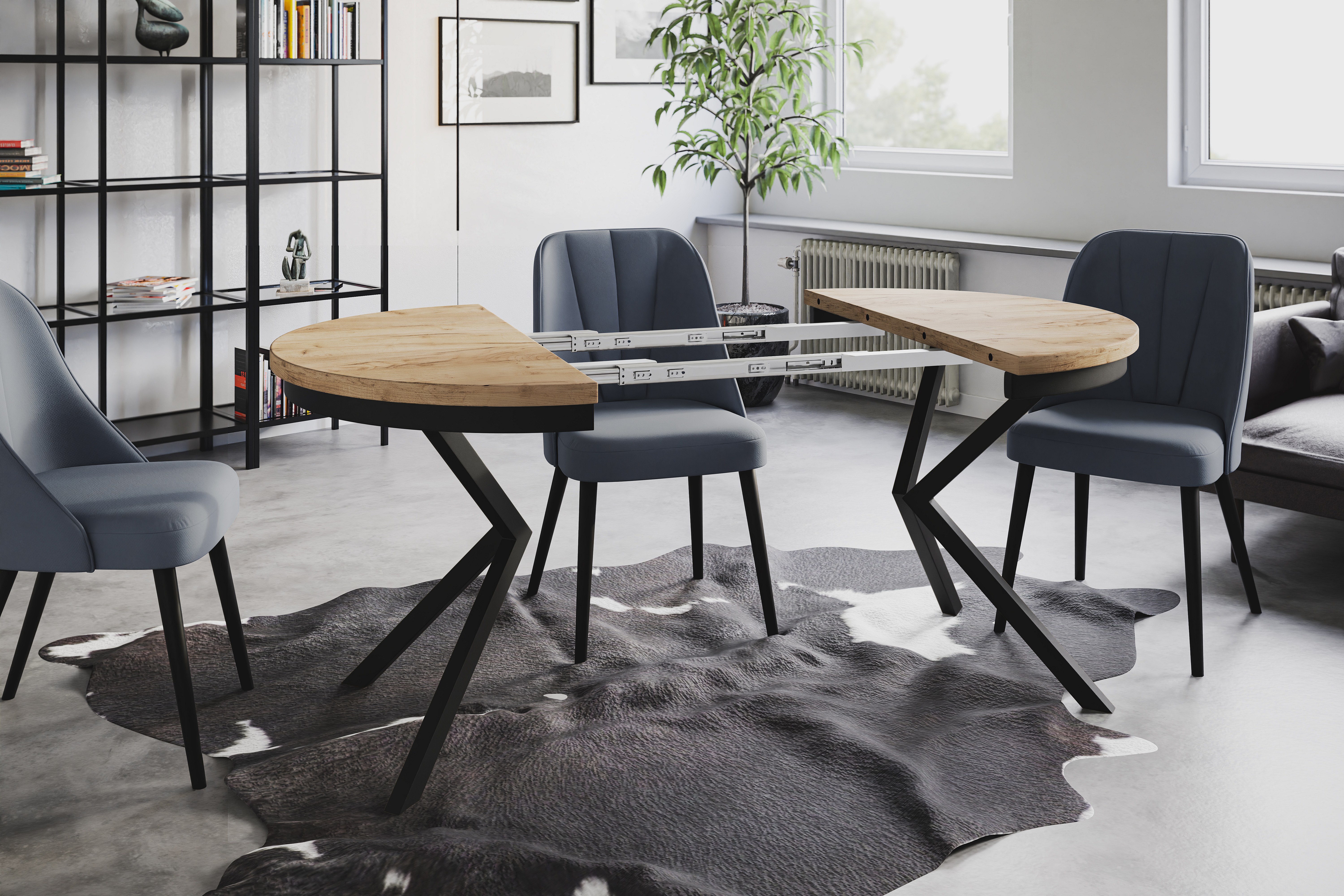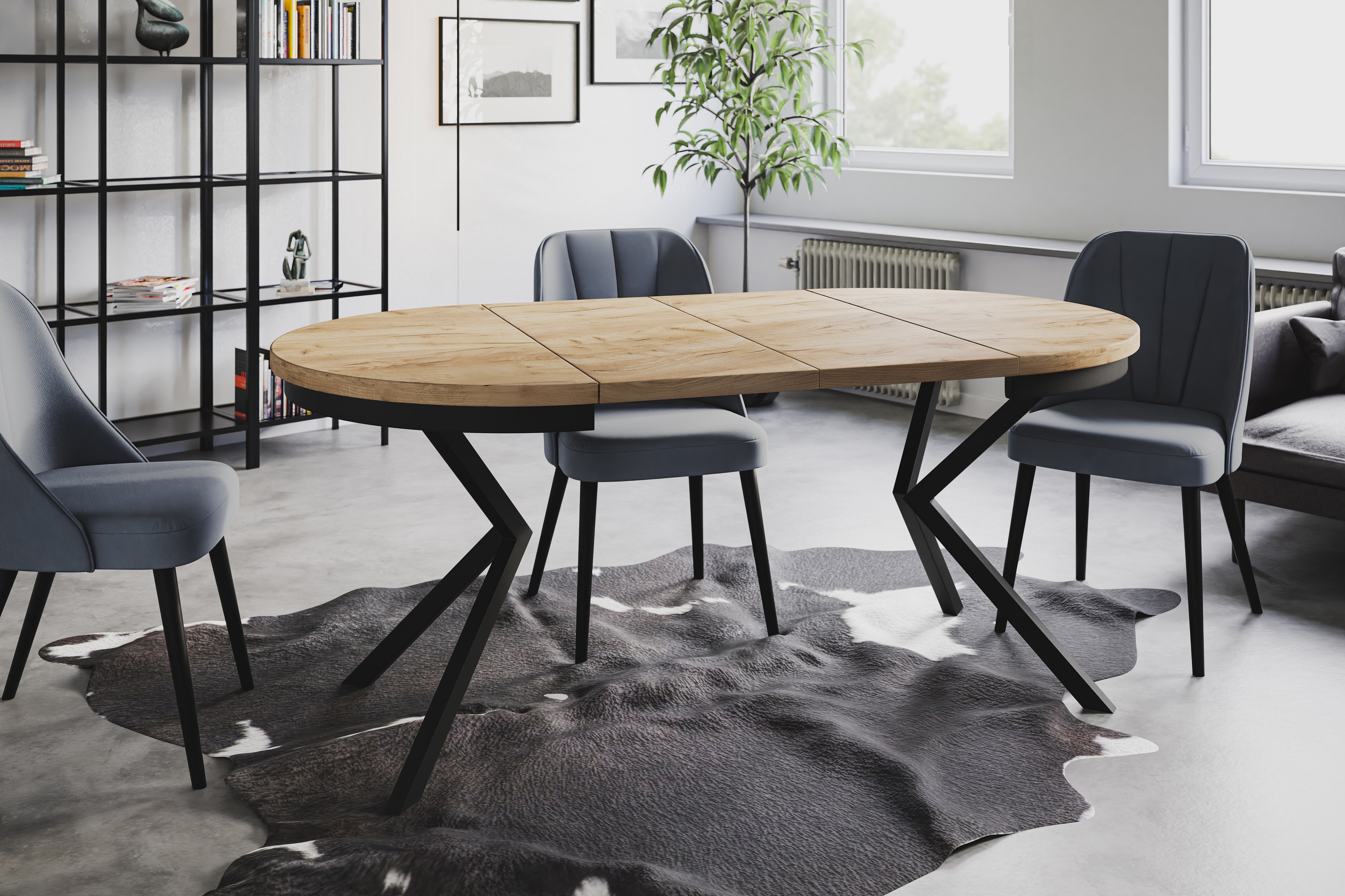 Table de salle à manger ronde BERGO, table à rallonges Diamètre : 120 cm/200 cm, couleur de la table basse : marron, avec pieds métalliques de couleur noire