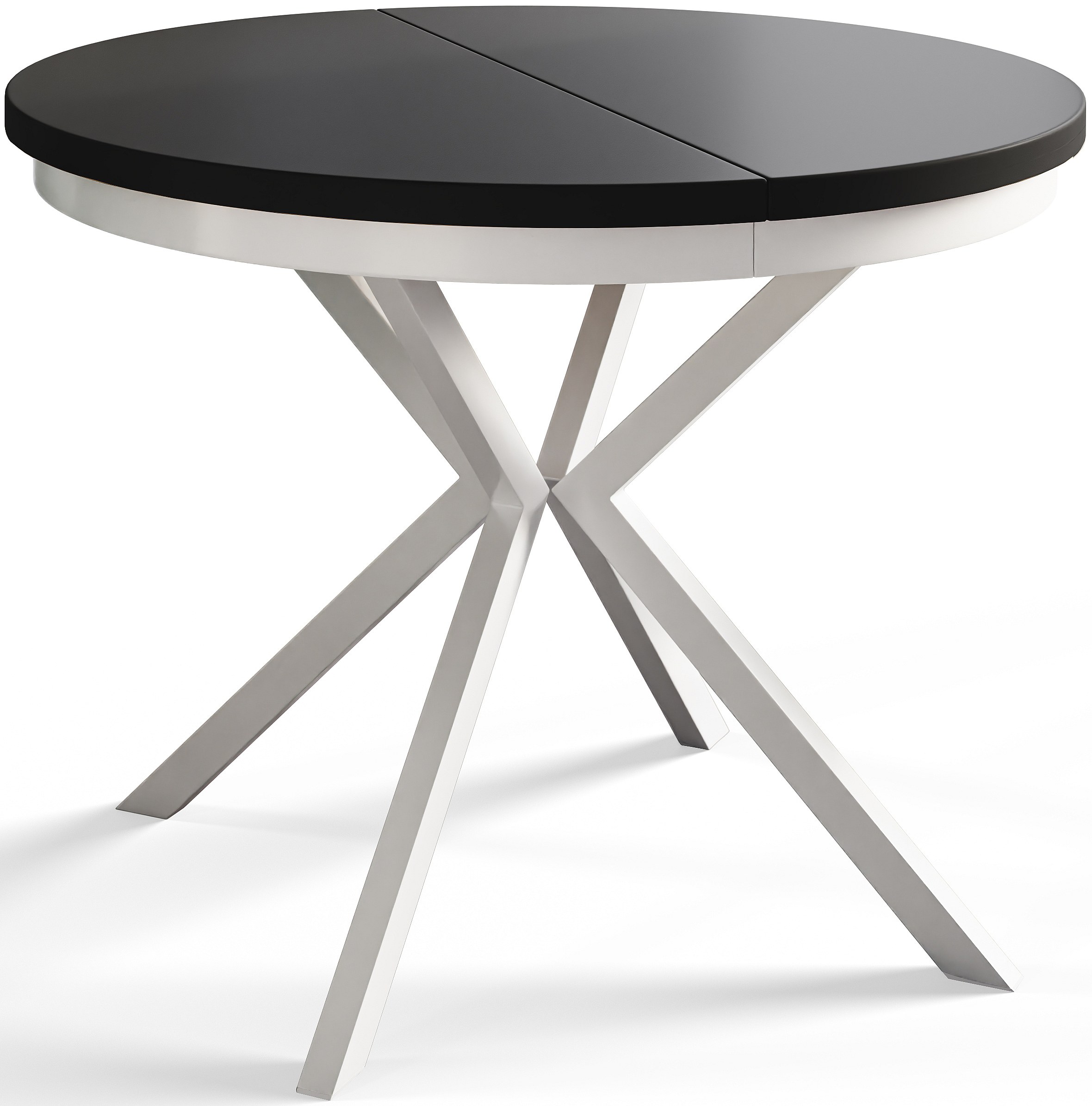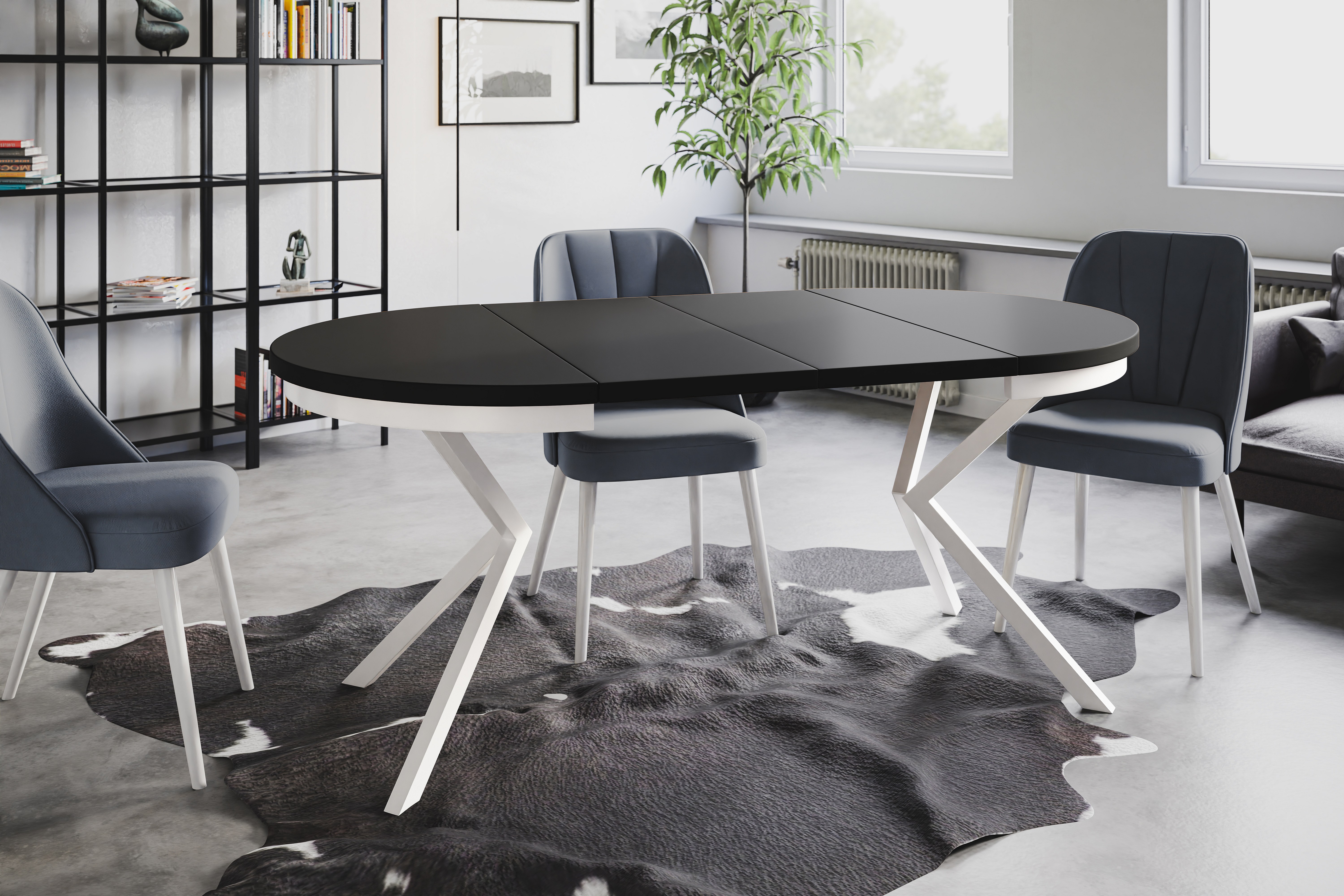 Table de salle à manger ronde BERGO, table à rallonges Diamètre : 120 cm/200 cm, couleur de la table basse : noir, avec pieds métalliques de couleur blanche