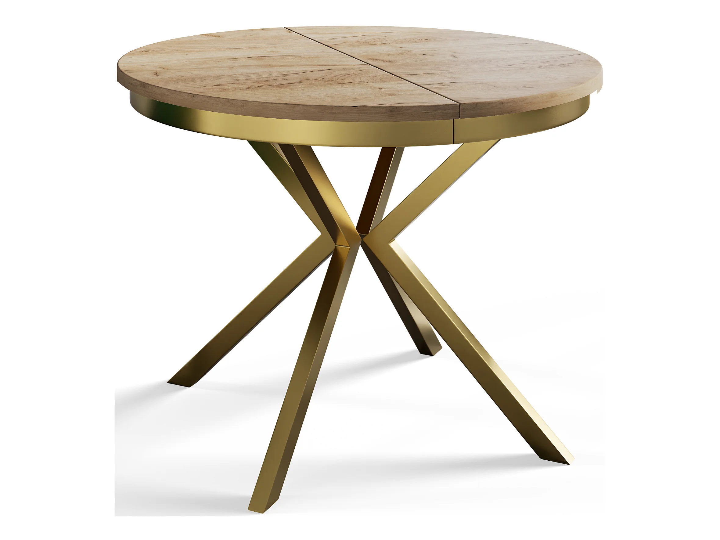 Table de salle à manger ronde BERGO, table à rallonges Diamètre : 90 cm/170 cm, couleur de la table basse : marron, avec pieds métalliques couleur or