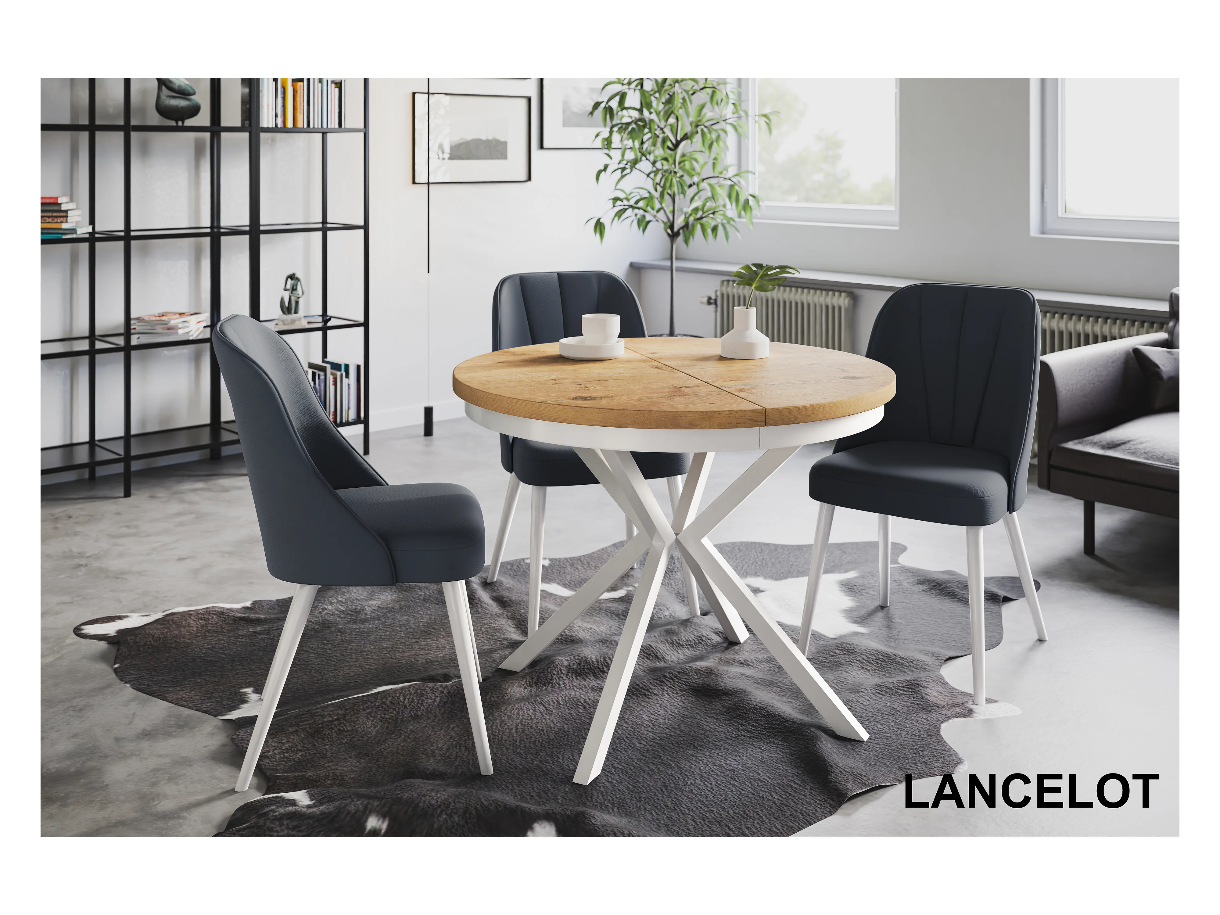Table de salle à manger ronde BERGO, table à rallonges Diamètre : 90 cm/170 cm, couleur de la table basse : marron clair, avec pieds métalliques blancs