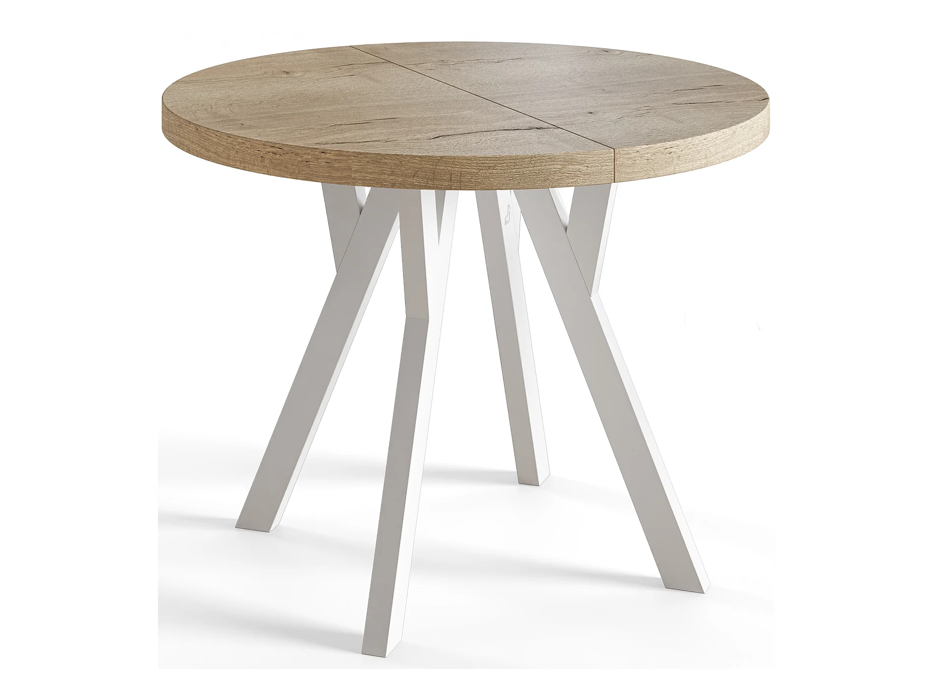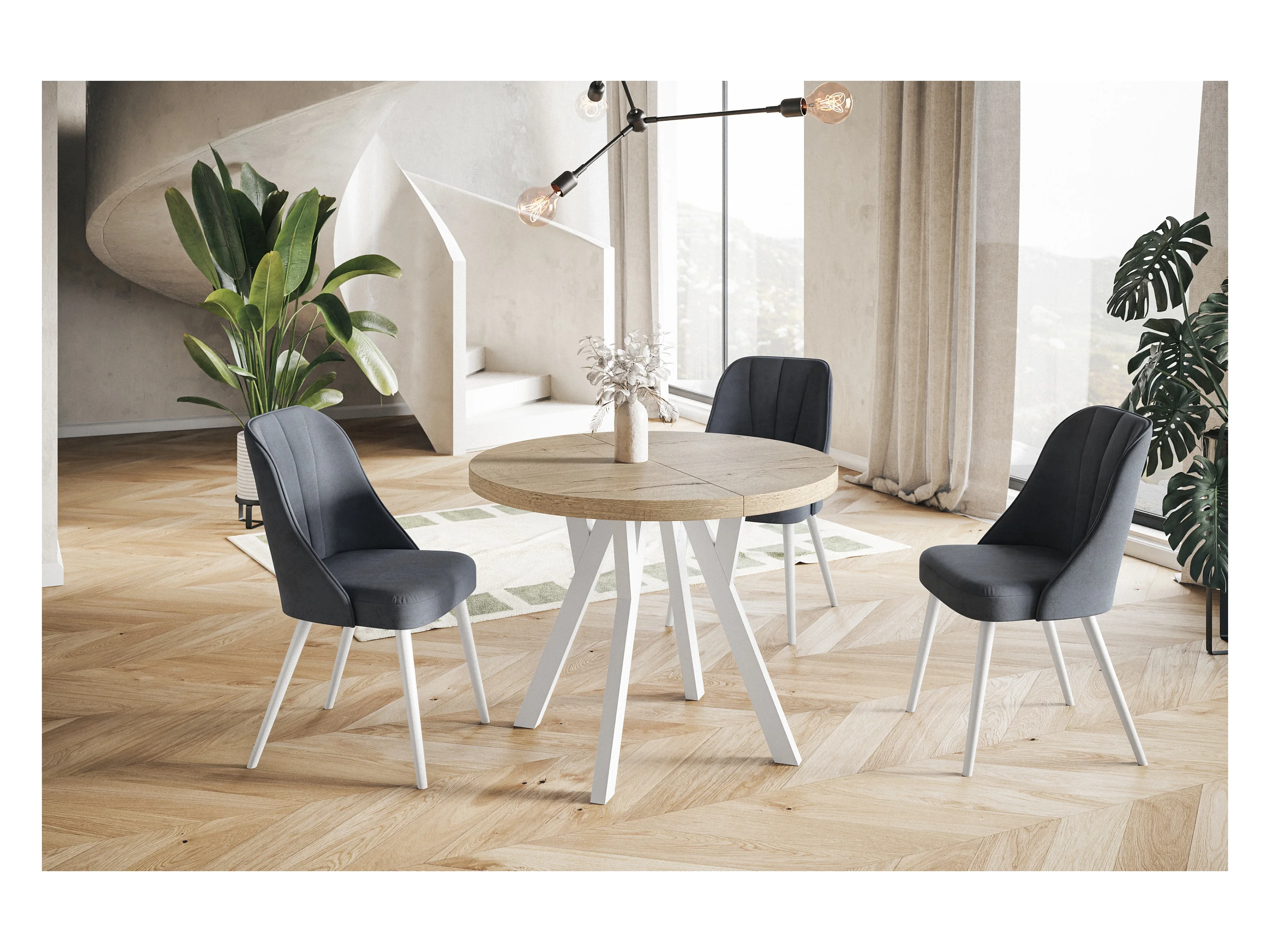 Table de salle à manger ronde OVO, table à rallonges Diamètre : 100 cm à 200 cm, couleur de la table basse : HALIFAX, avec pieds en bois de couleur blanche