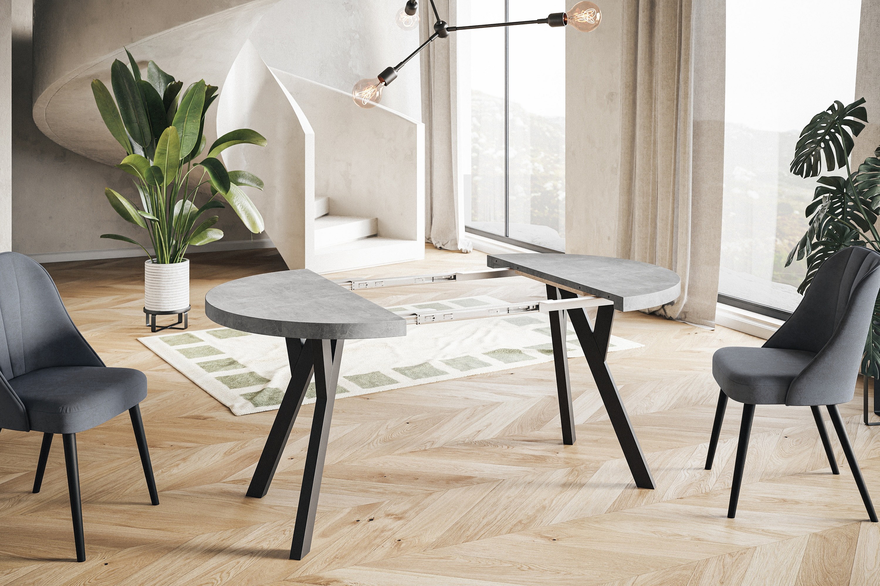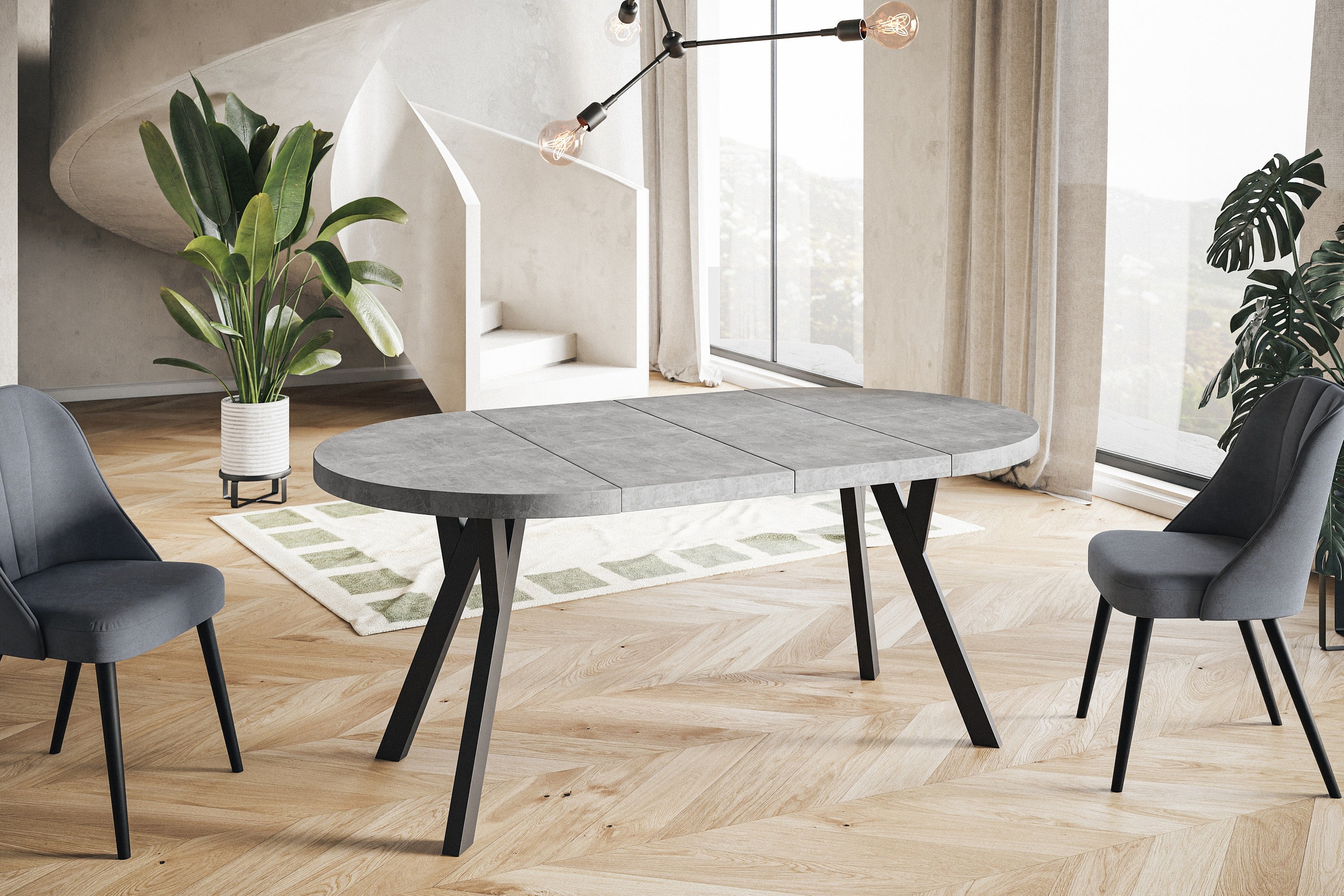Table de salle à manger ronde OVO, table à rallonges Diamètre : 110 cm à 210 cm, couleur de la table basse : graphite, avec pieds en bois de couleur noire