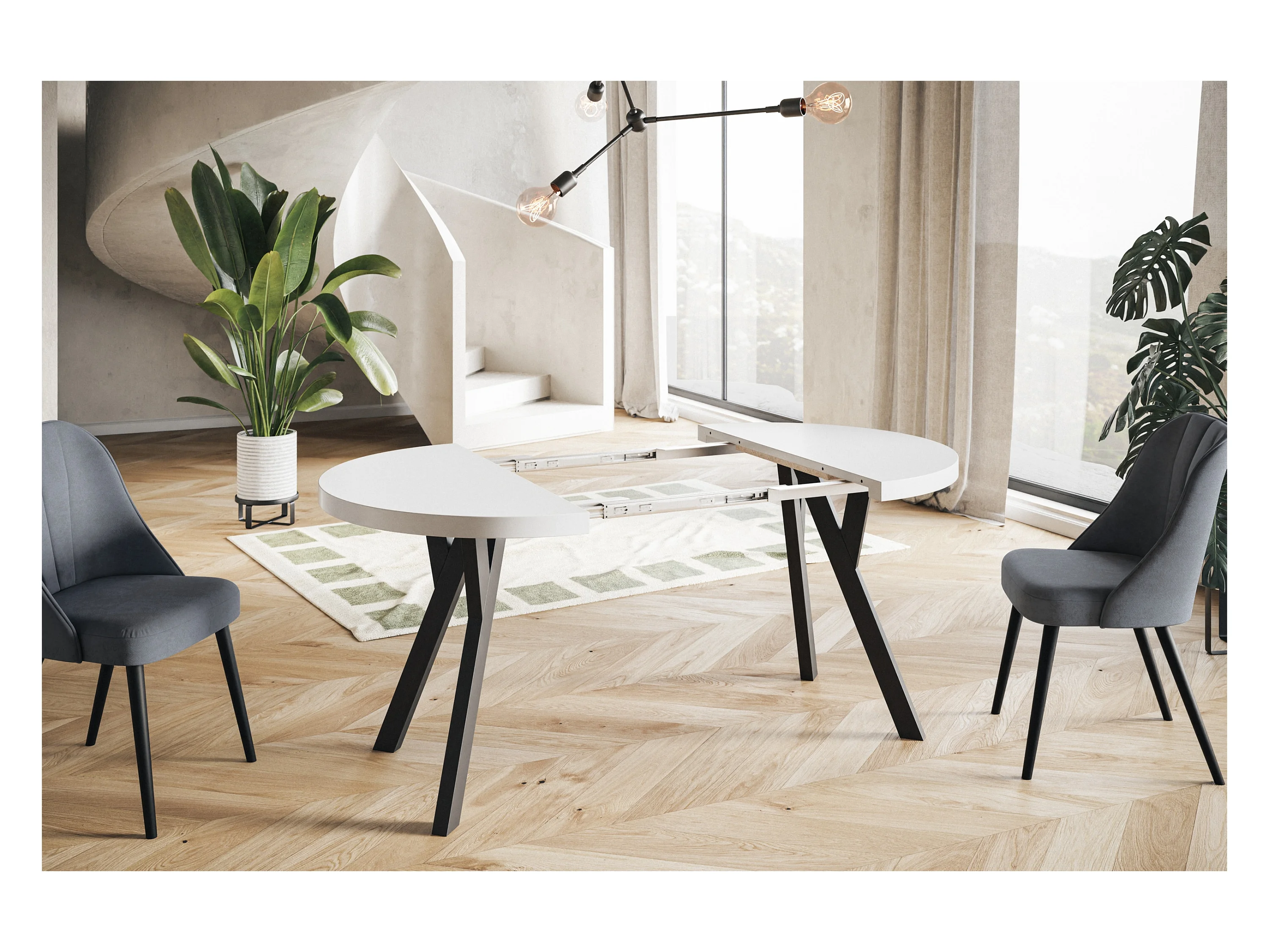 Table de salle à manger ronde OVO, table à rallonges Diamètre : 120 cm à 220 cm, couleur de la table basse : blanc, avec pieds en bois couleur noir