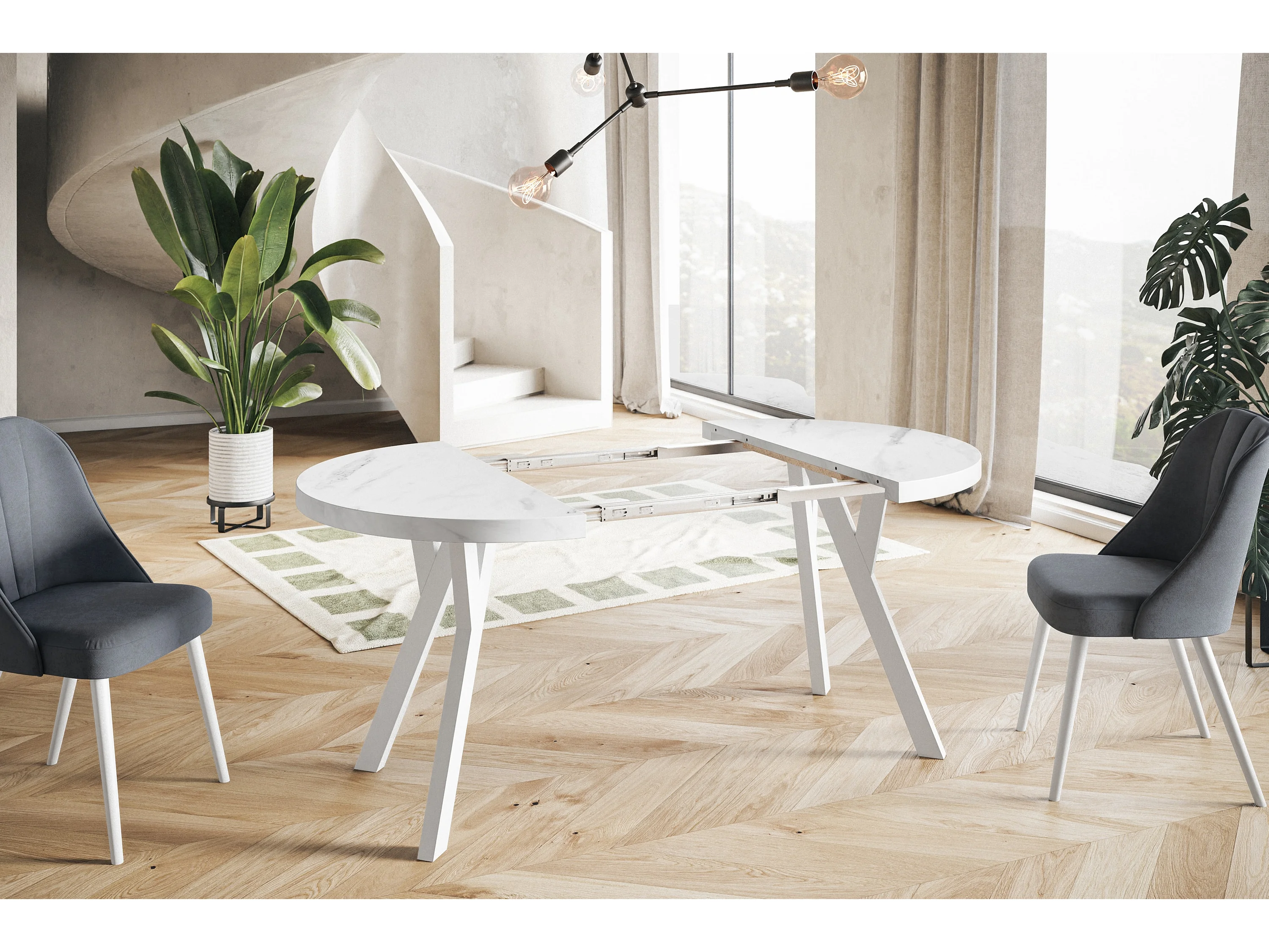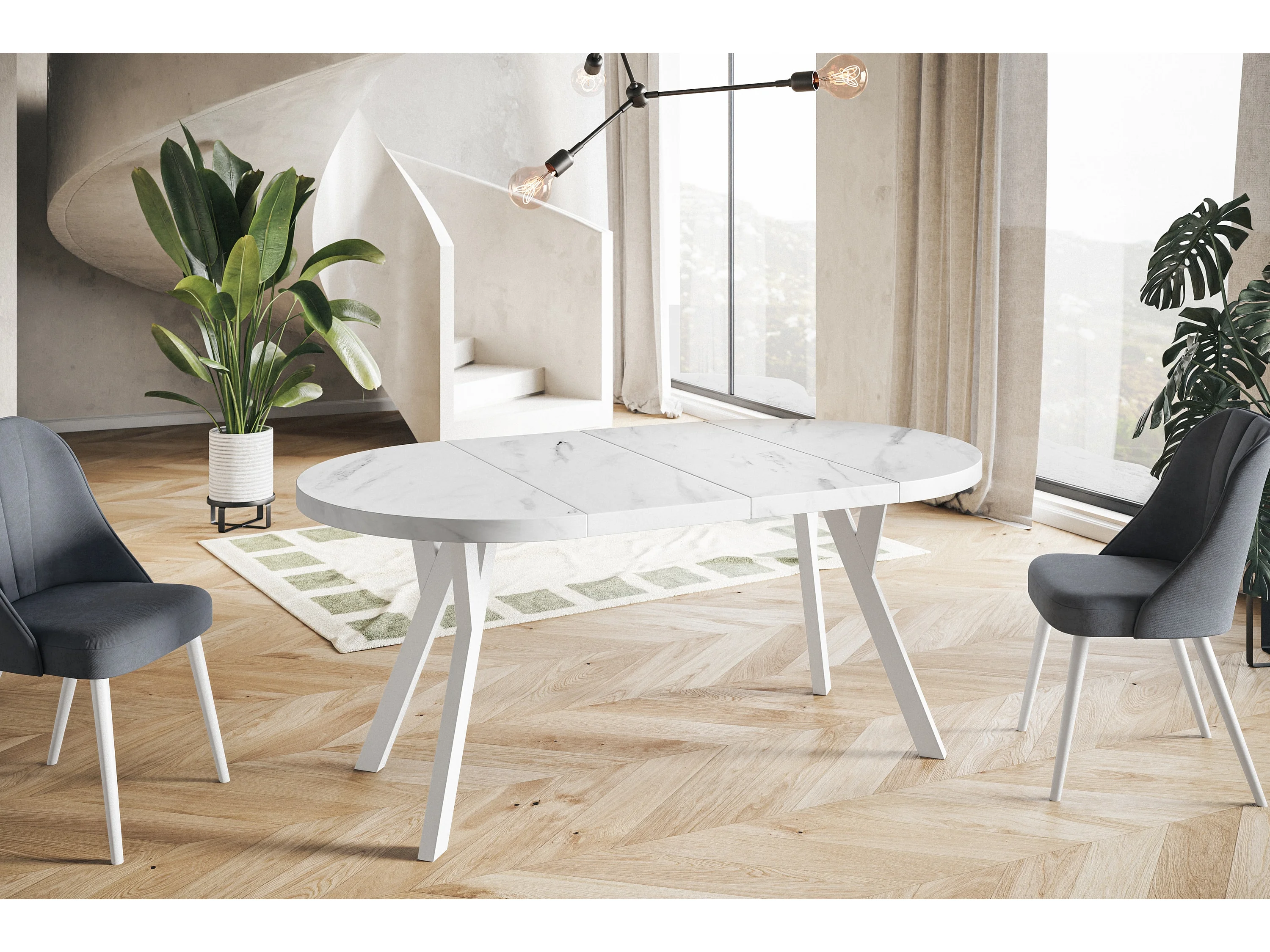 Table de salle à manger ronde OVO, table à rallonges Diamètre : 90 cm à 190 cm, couleur de la table basse : MARMUR, avec pieds en bois blanc
