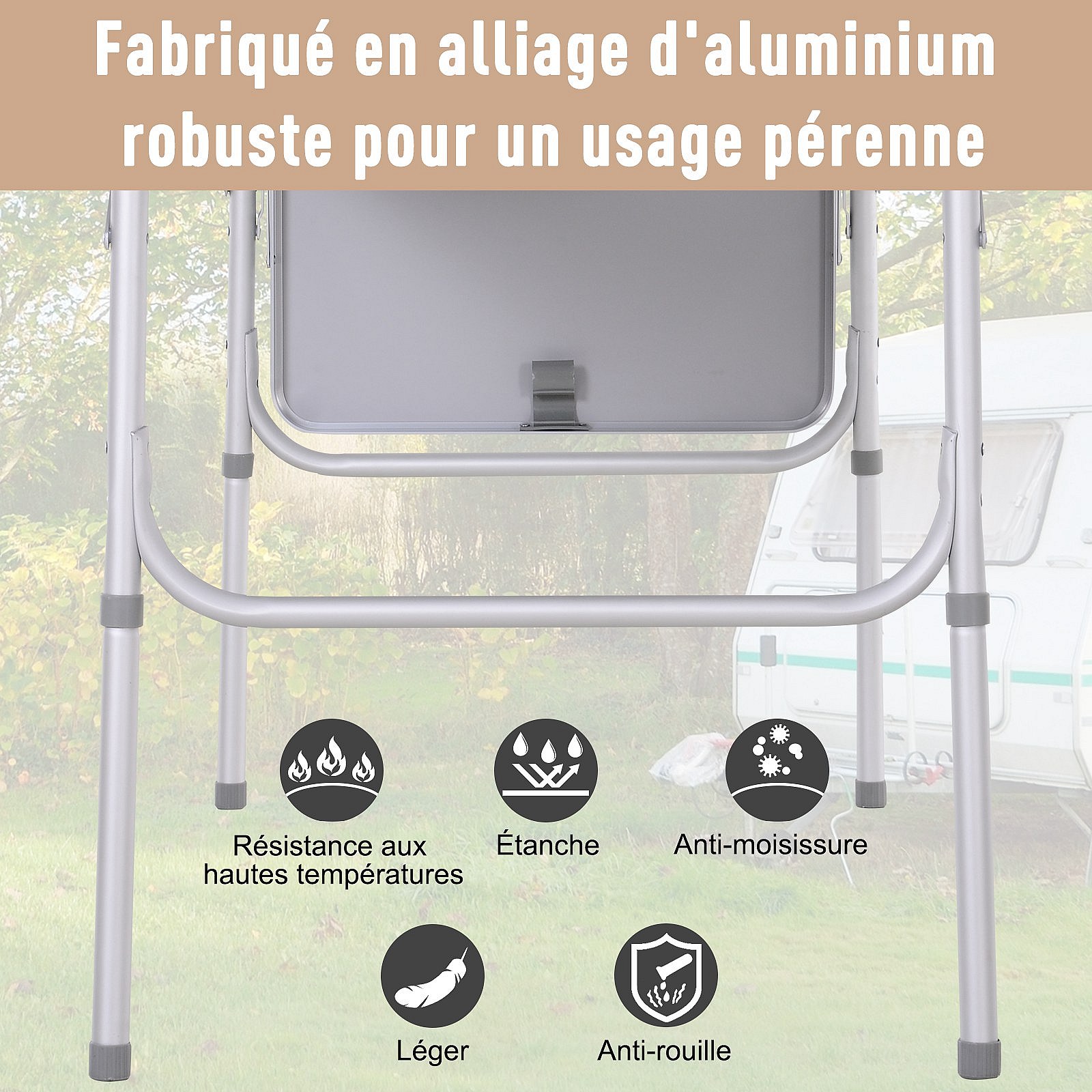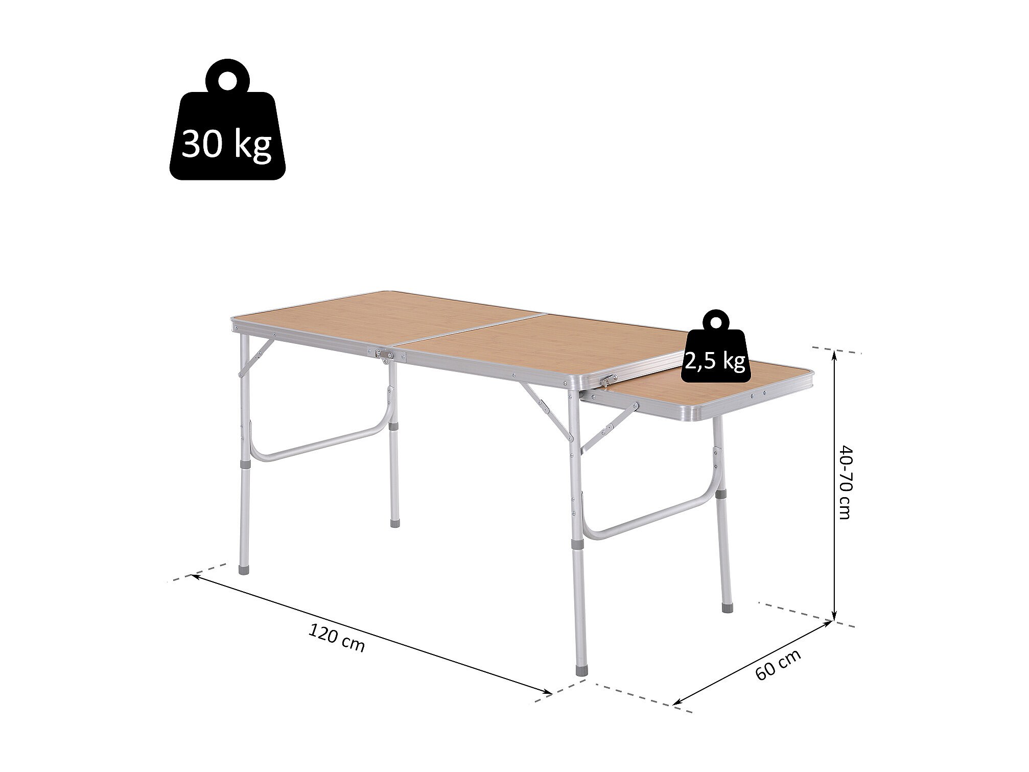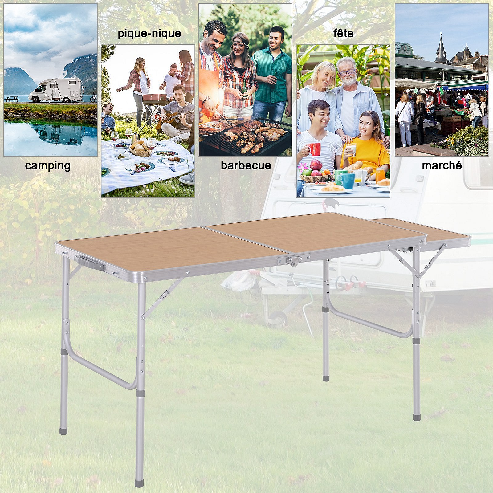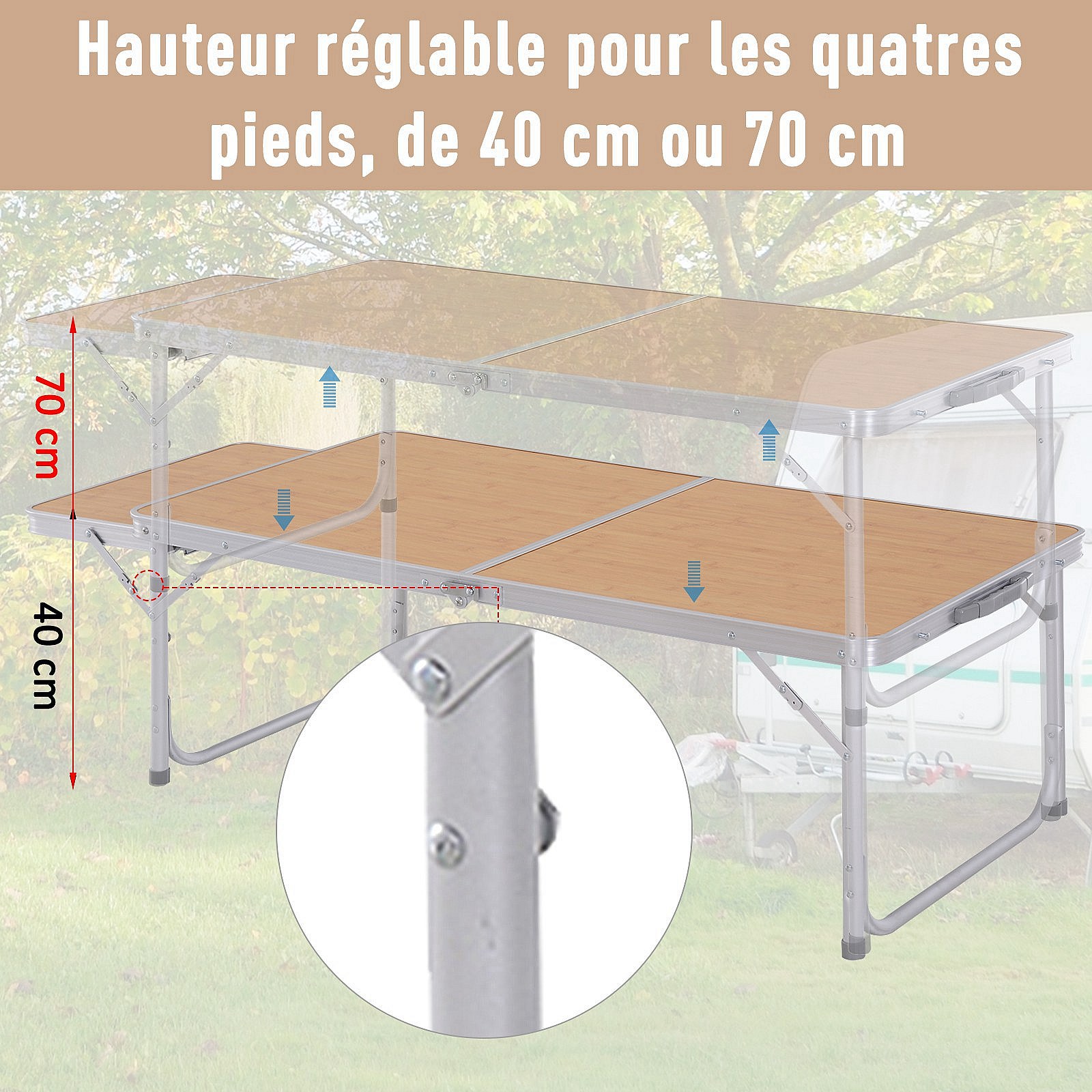 Table pliante table de camping table de jardin avec rallonge hauteur réglable aluminium MDF imitation bambou