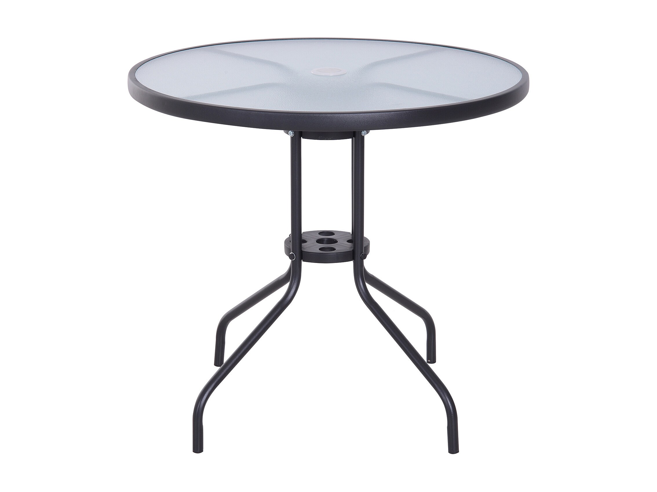 Table ronde bistro de jardin dim. Ø 80 x 72H cm espace installation parasol acier époxy noir plateau verre trempé