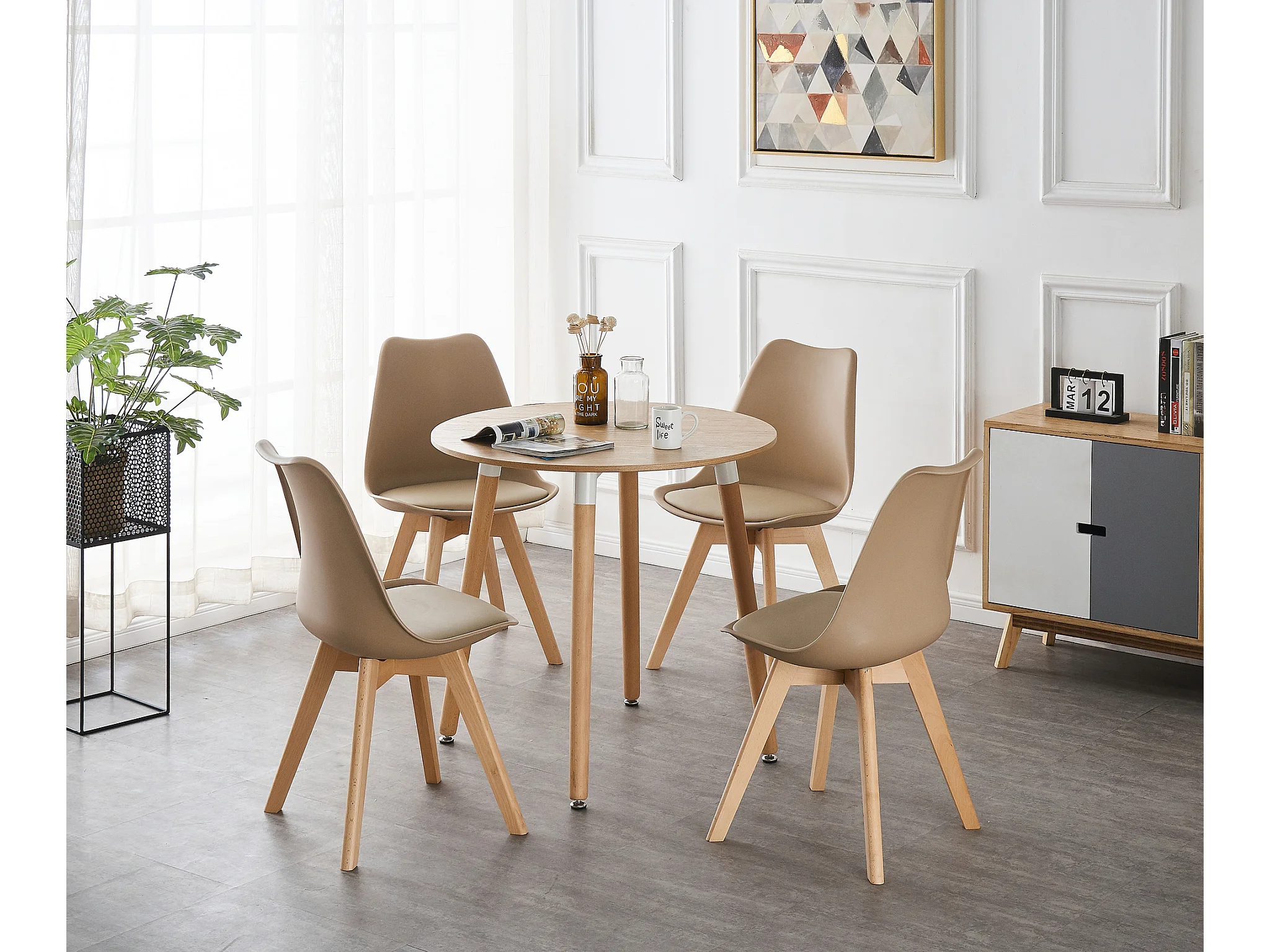 LORENZO HALO - Ensemble Salle à Manger - Table Ronde Effet Chêne + 4 Chaises Scandinaves Beiges