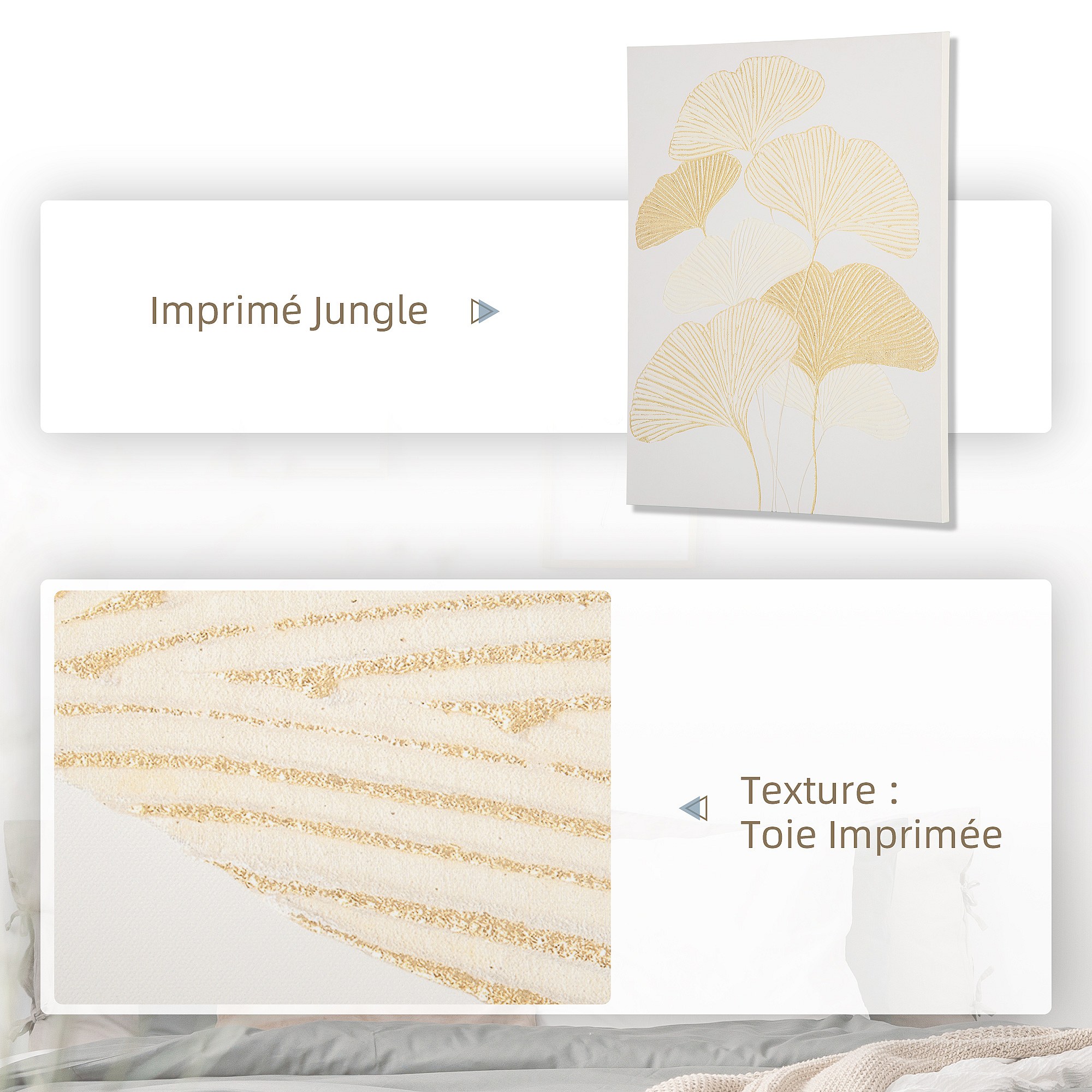 Tableau imprimé et peint feuilles ginkgo biloba - dim. 100L x 80l cm - décoration murale - toile 100% polyester structure bois de pin encre dorée blanc