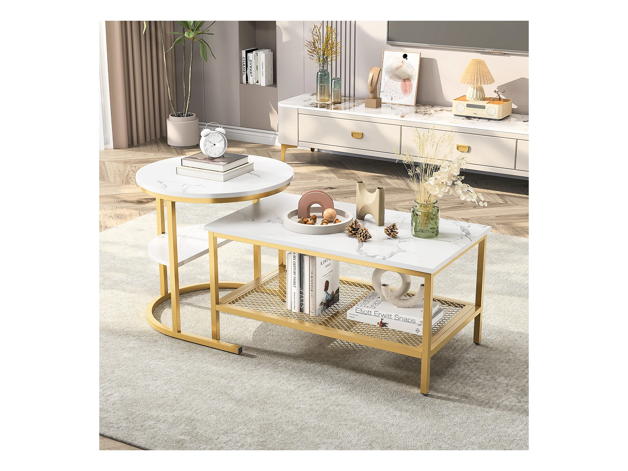 Lot de 2 Tables Basses gigognes, avec marbré brillant, Or et Blanc