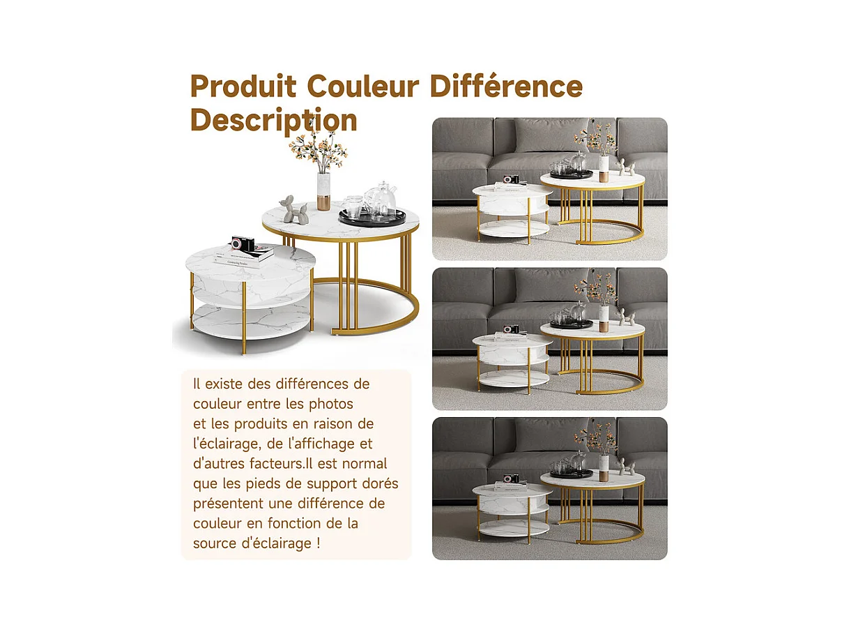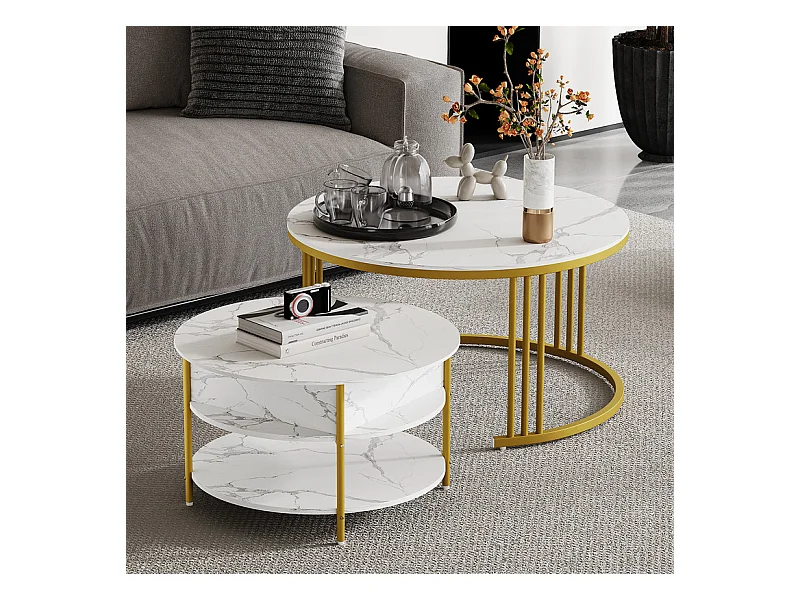 Lot de 2 table basse gigogne, table ronde, aspect marbre, structure en métal doré, D71,5x44+P51,5x37cm Blanc