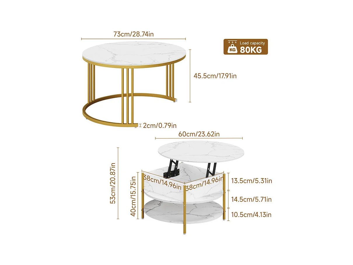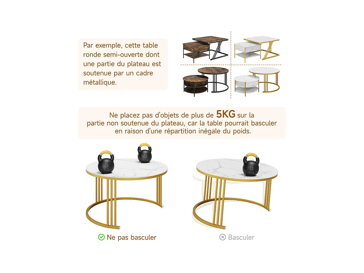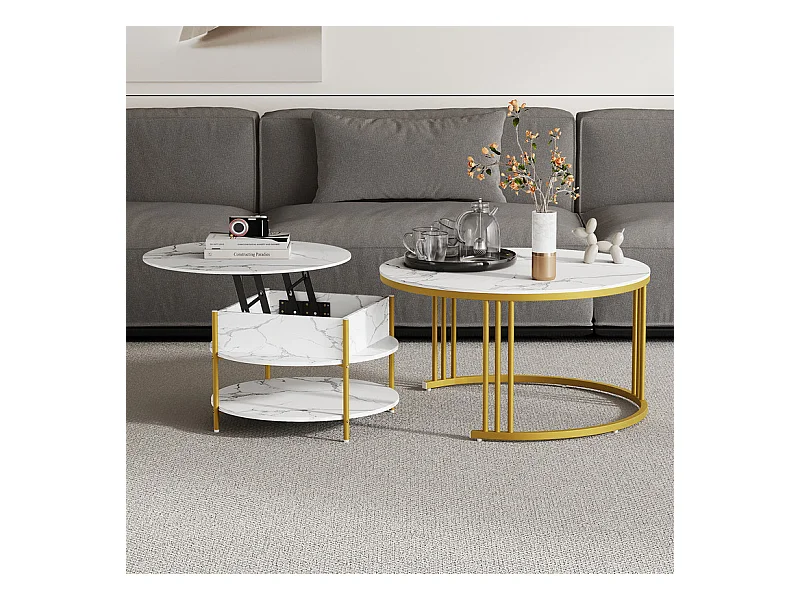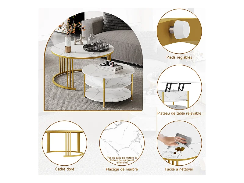 Tables basses gigognes ronde, avec plateau relevable, pieds de métal doré, charge max 80kg, Blanc et doré