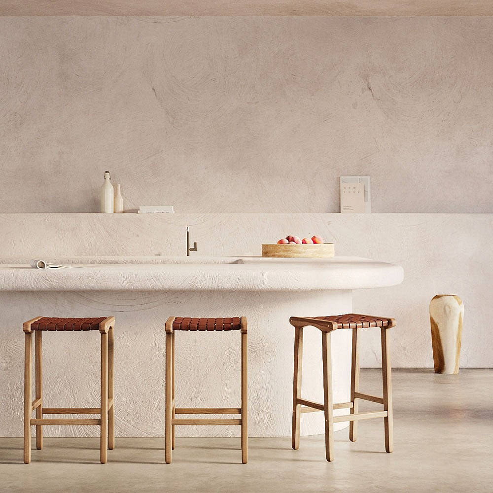 Tabouret pour îlot central 68 cm en teck et cuir tressé marron - Kuna