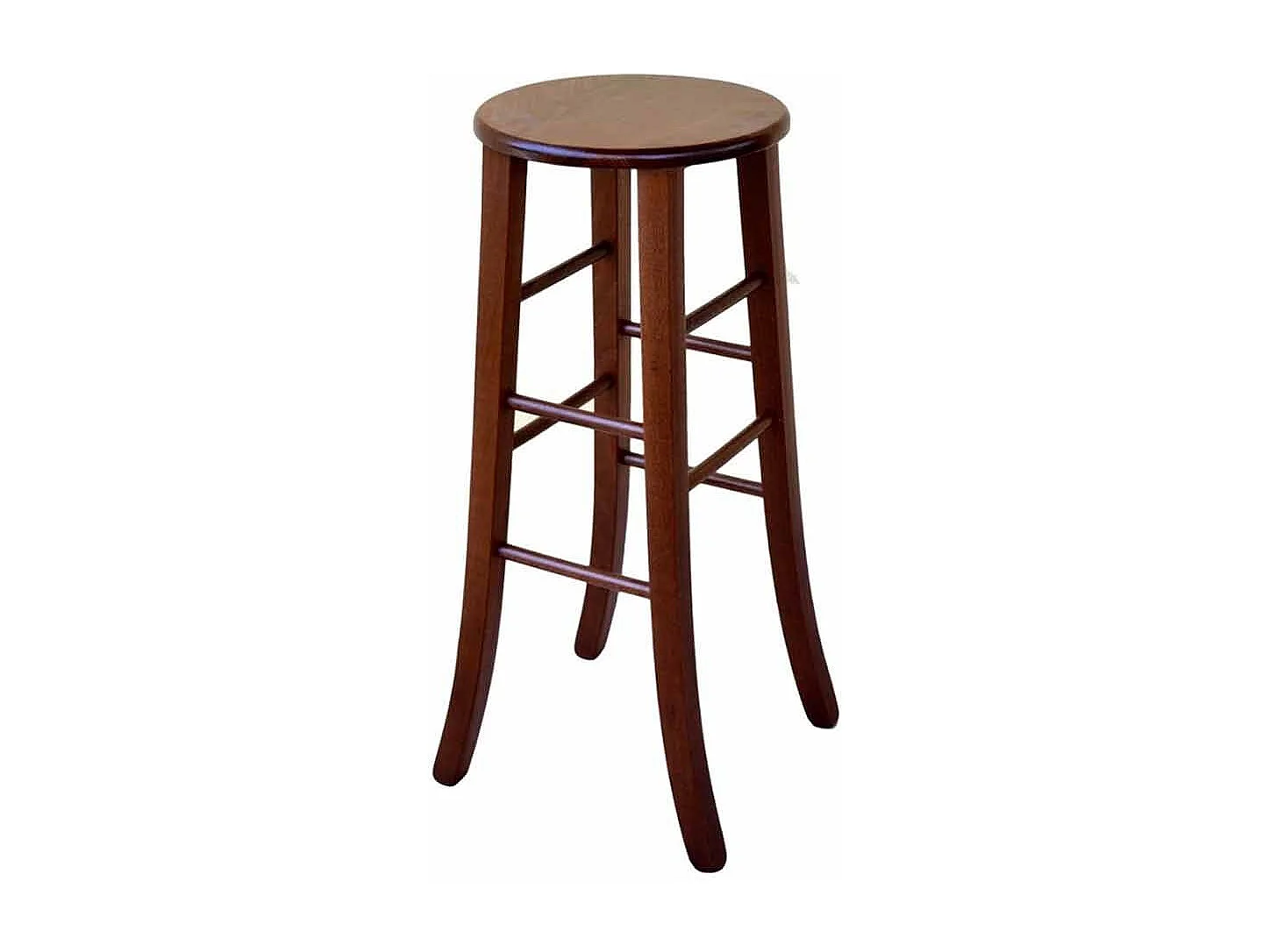 Tabouret en bois massif de noyer foncé h 80 avec assise ronde et pieds sabre