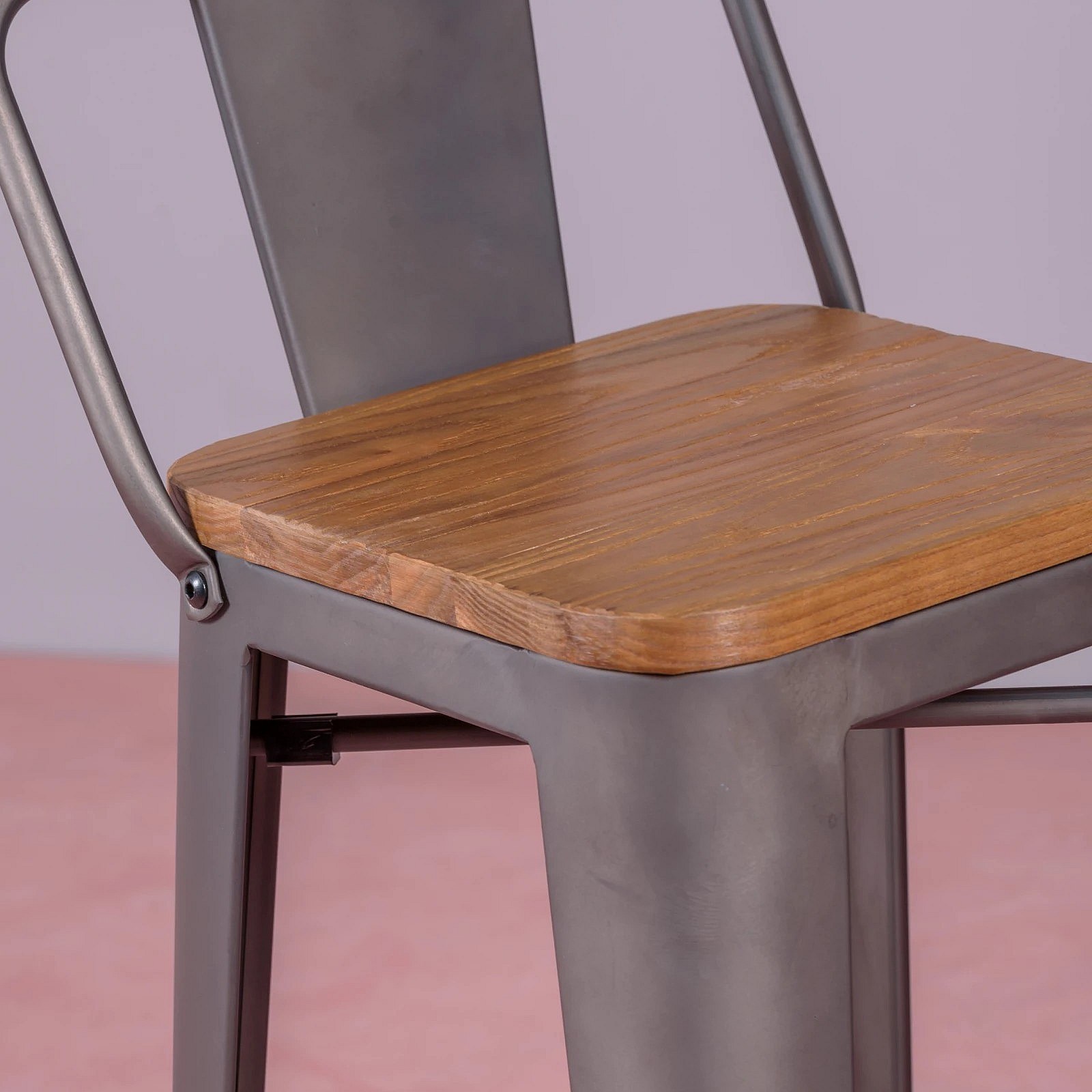 Tabouret de bar style industriel avec dossier en métal silver et assise en bois clair - Hauteur 76 cm