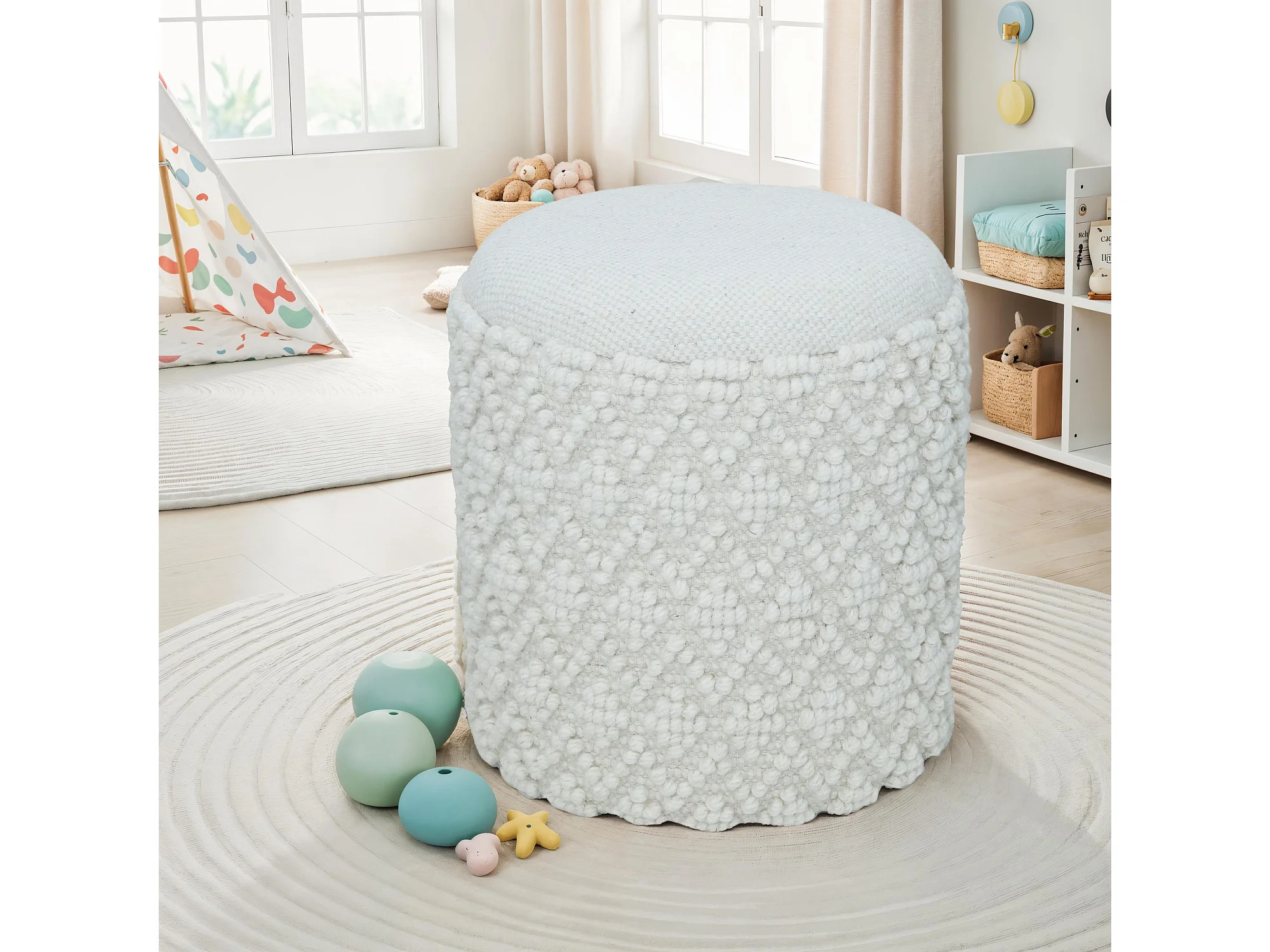 Tabouret scandinave rond en bouclettes blanches structure bois de sapin Ø40 x H 45cm