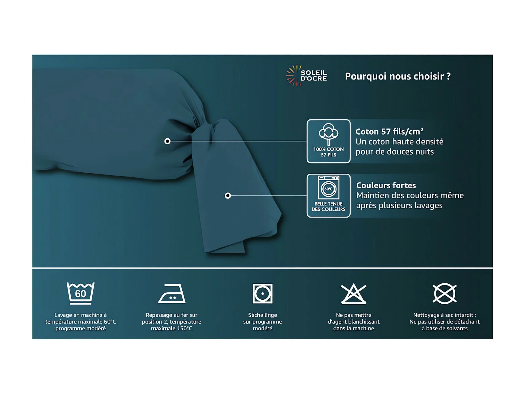 Taie de traversin en coton 57 fils 45x185 cm UNI gris, par Soleil d'ocre