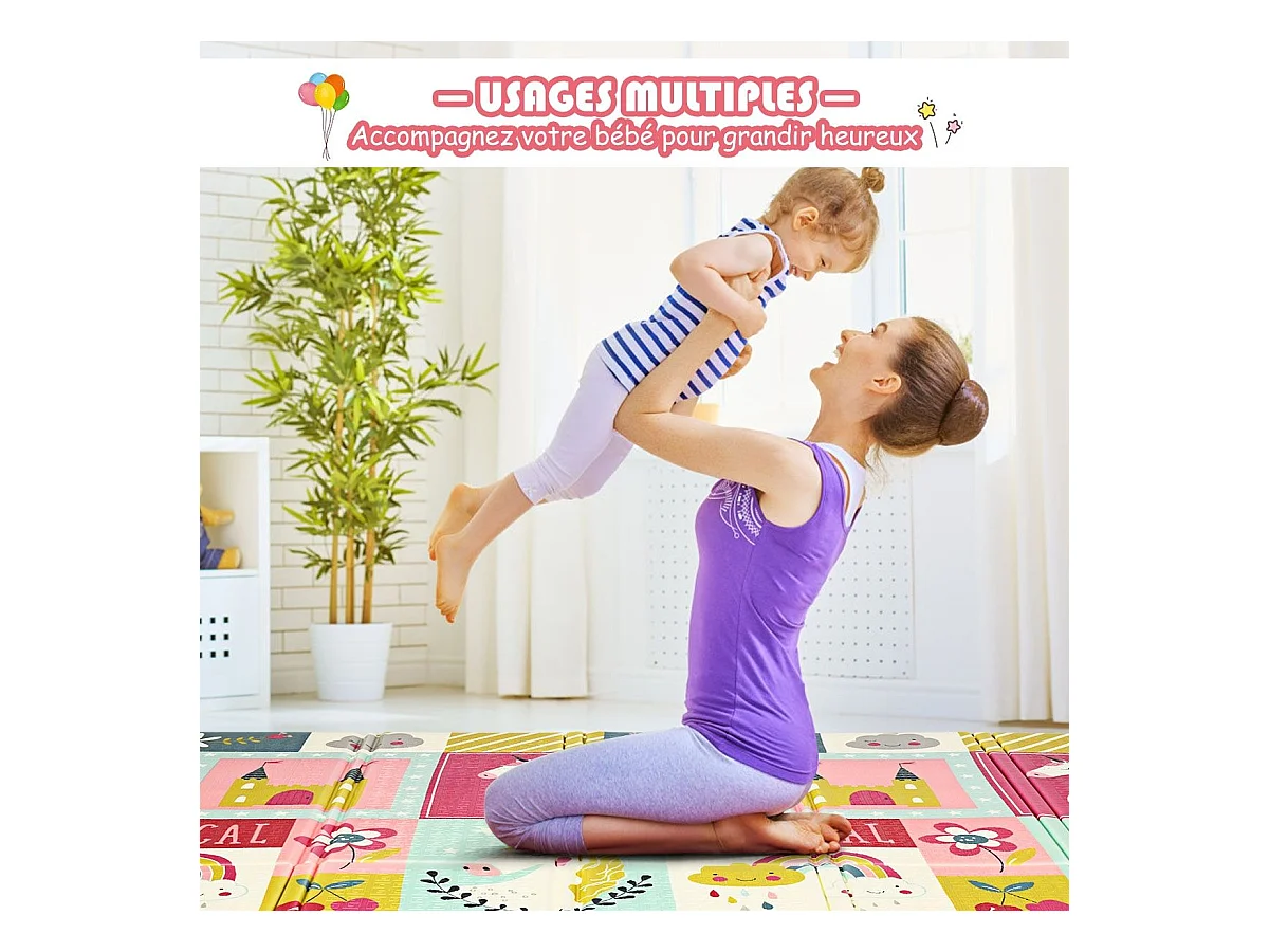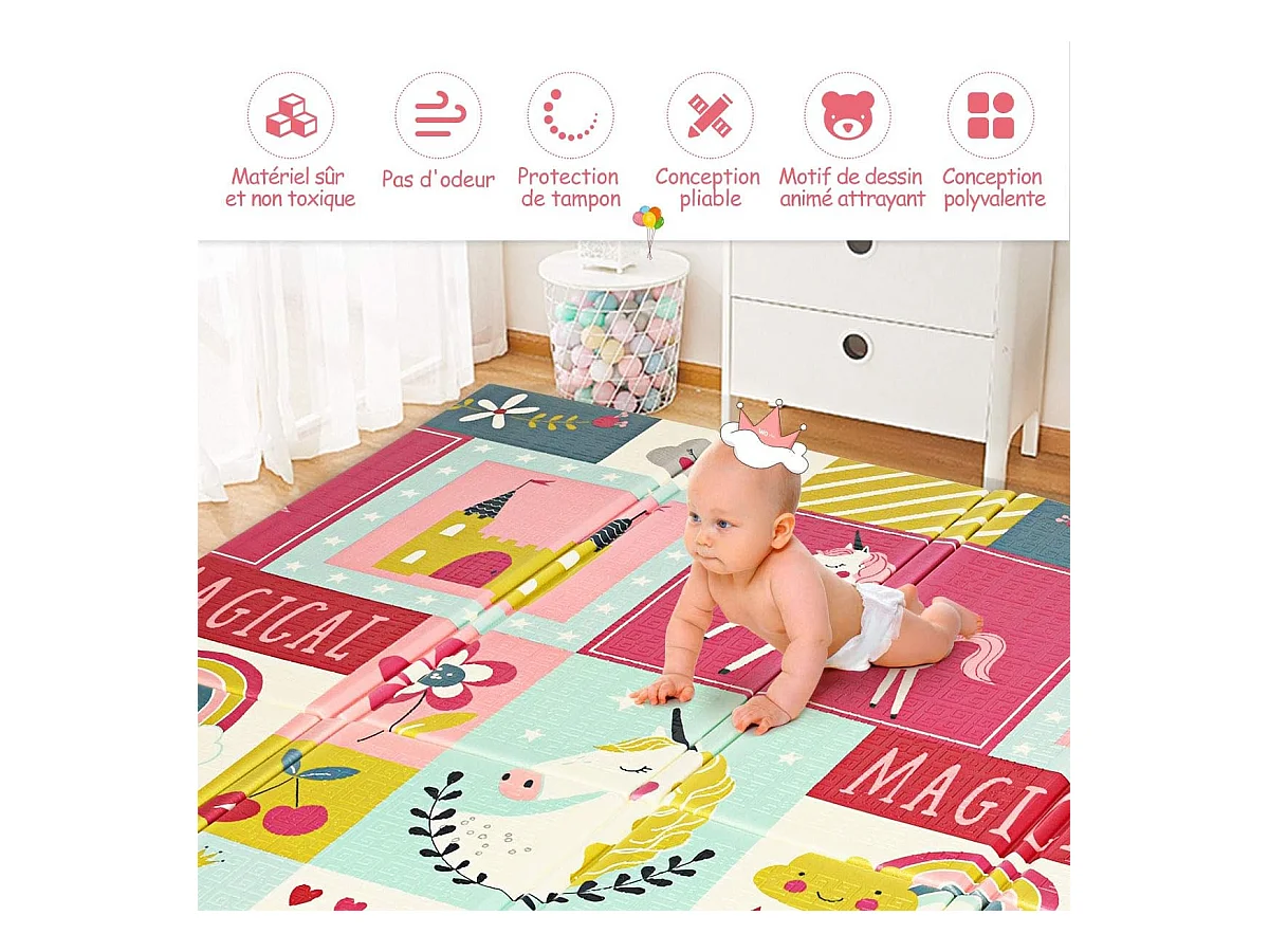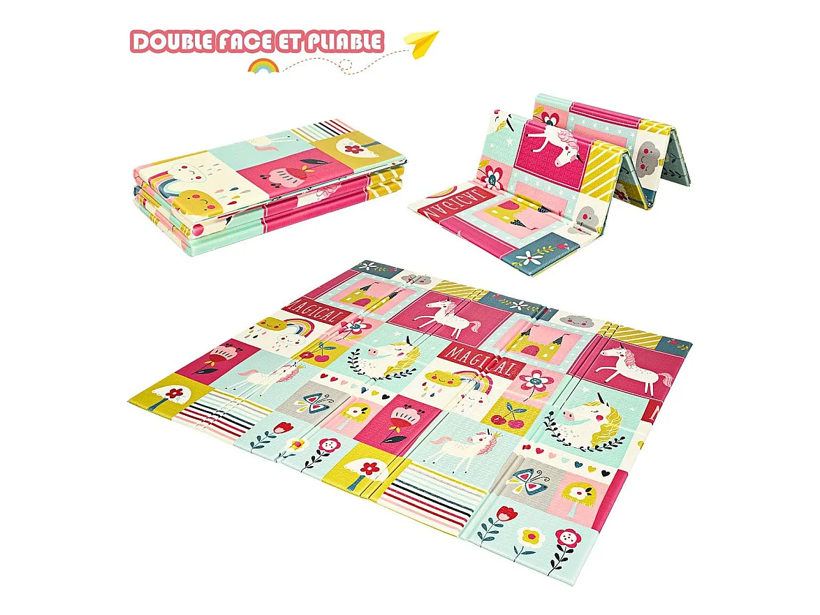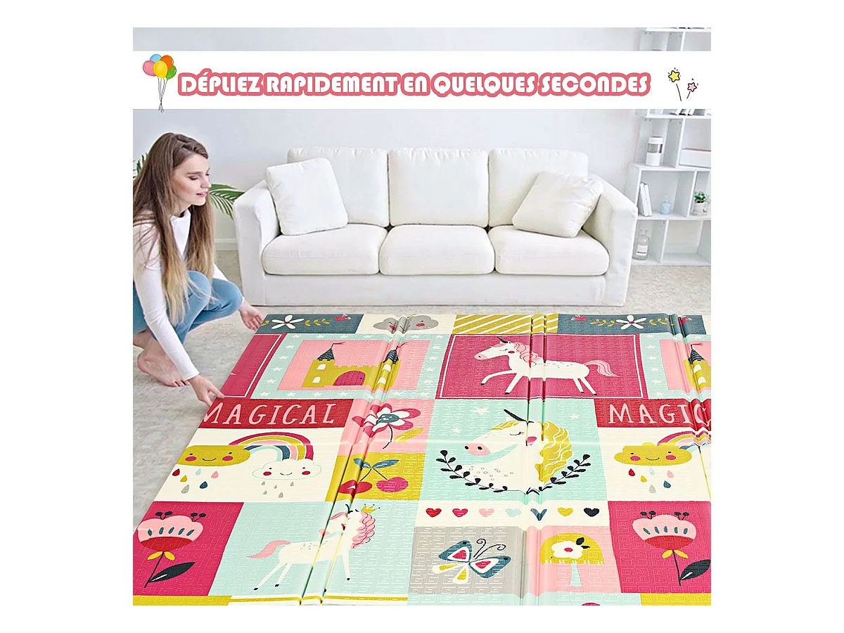 Tapis de Jeu pour Bébé Pliable 200x180x1,4CM avec l'Image Licorne/Lion en Mousse XPE Non Toxique Antidérapant Double Face avec Sac de Transport